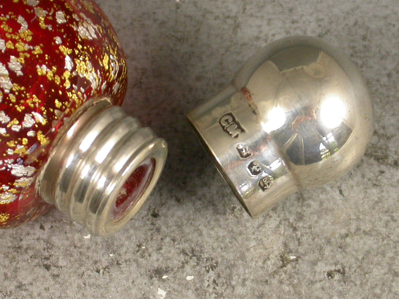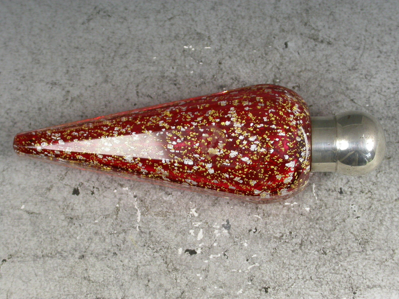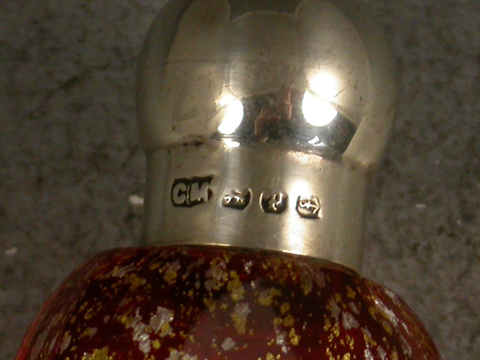 A good Victorian silver mounted ruby glass Scent Bottle of conical form with faceted sides, the glass encasing fragments of gold and silver leaf, probably made in Stourbridge c1880 - 1900. The silver top by Charles May, Birmingham, 1890.