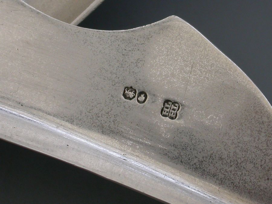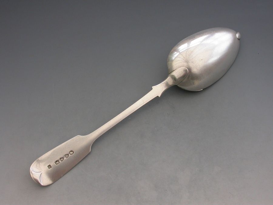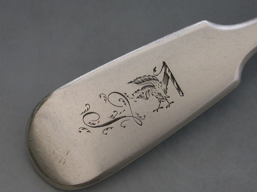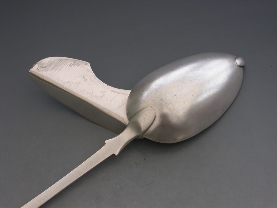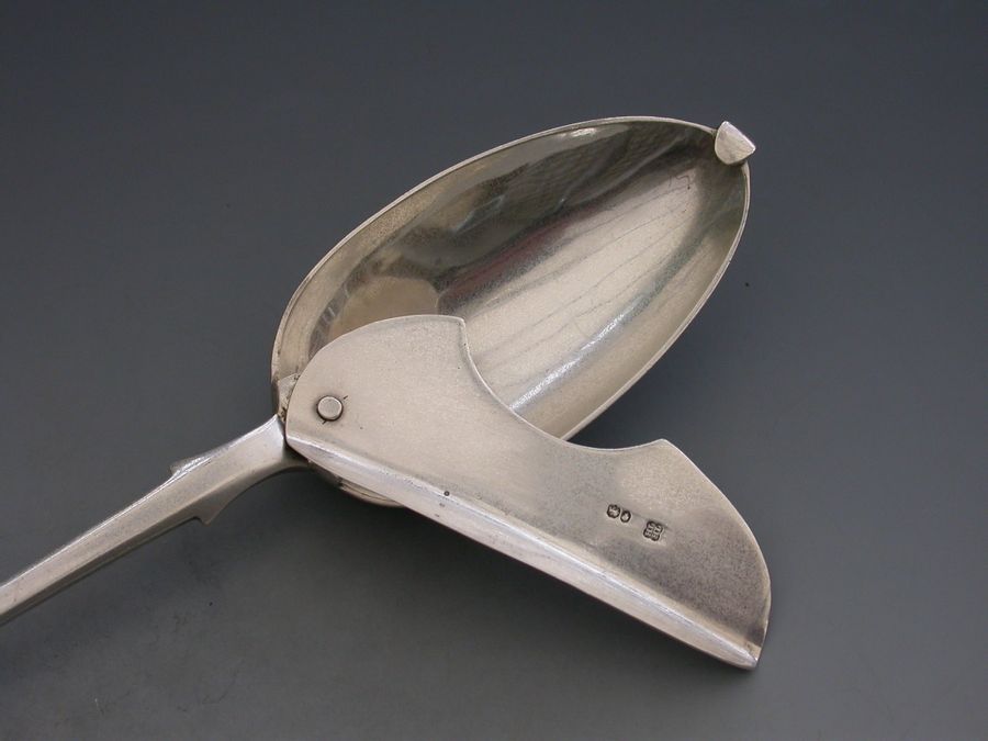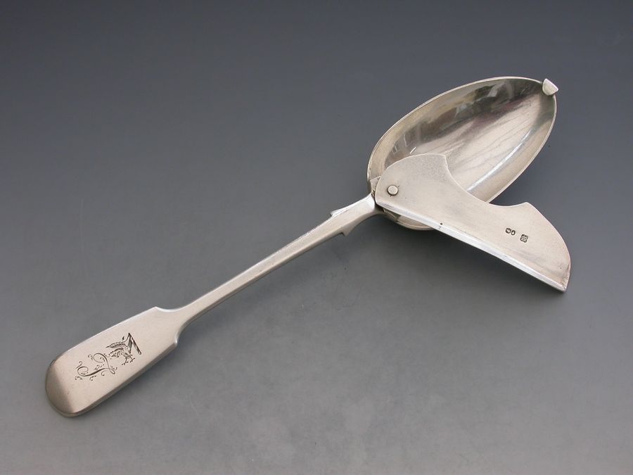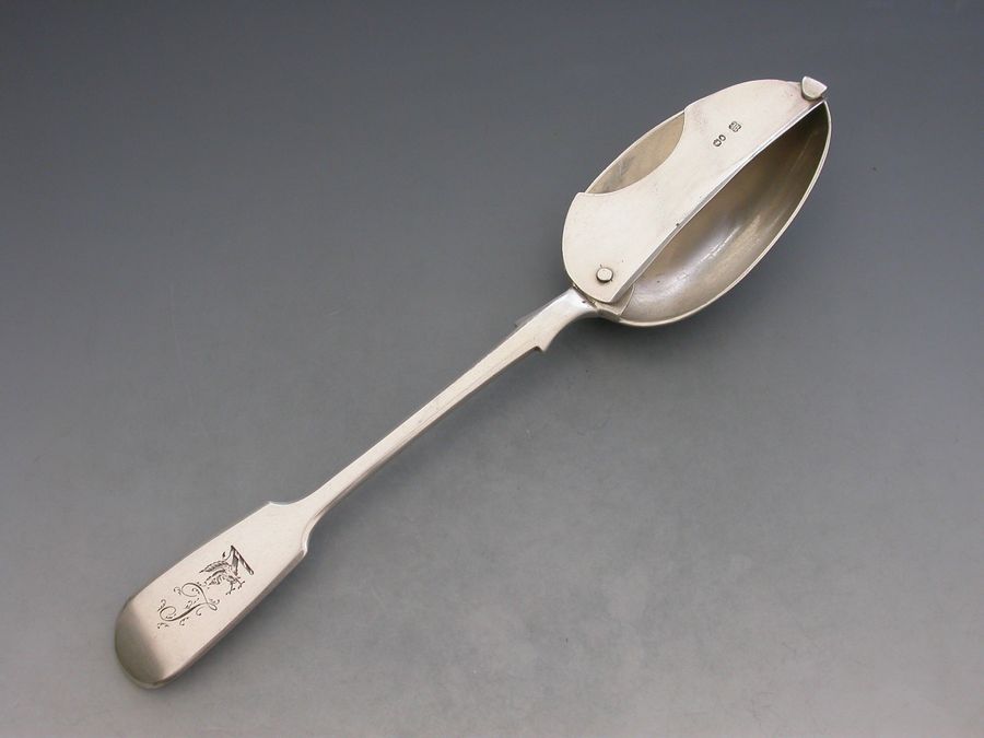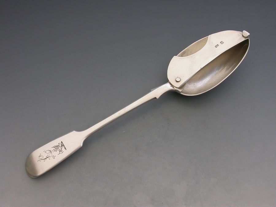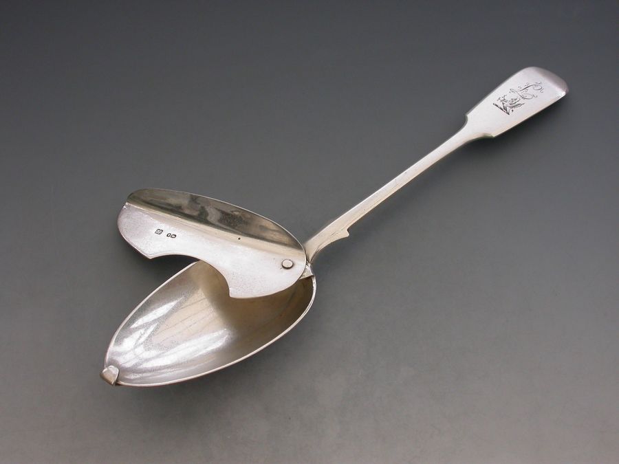 A rare Victorian silver Moustache Spoon of plain fiddle pattern, the oval bowl with a swing section clip-in moustache guard. The handle engraved with a crest and initials.