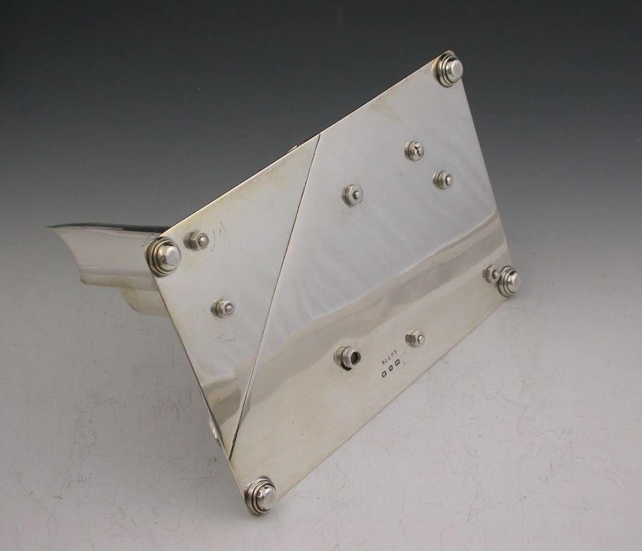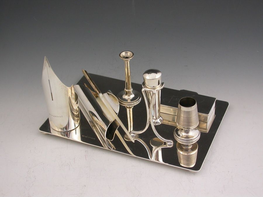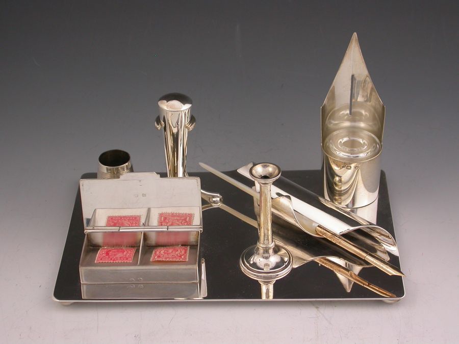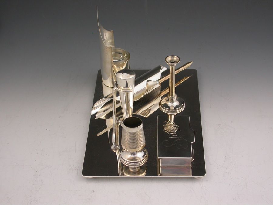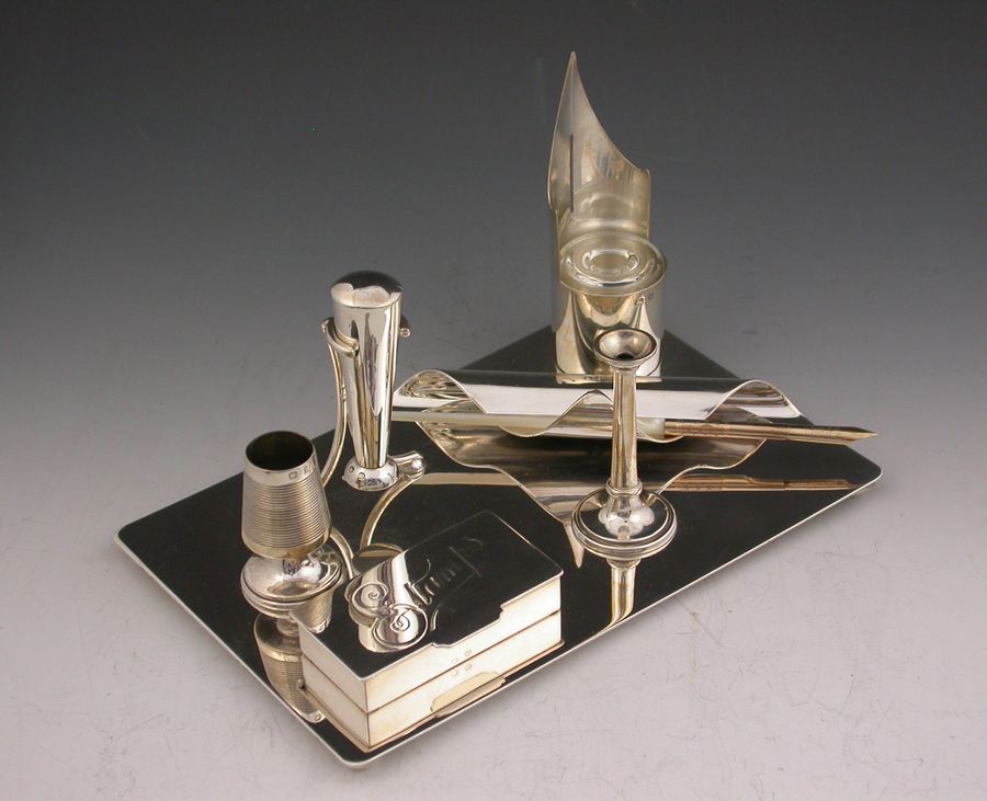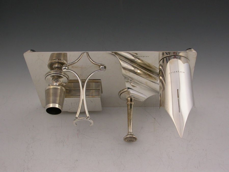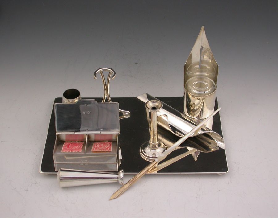 An unusual late Victorian silver multi-function Ink Stand of plain rectangular form standing on four stud feet, the glass ink pot formed as a fountain pen nib and a pen rack simulating the curled over corner a page. Complete with twin-compartment Stamp Box, Vesta Holder, Seal and Taperstick.