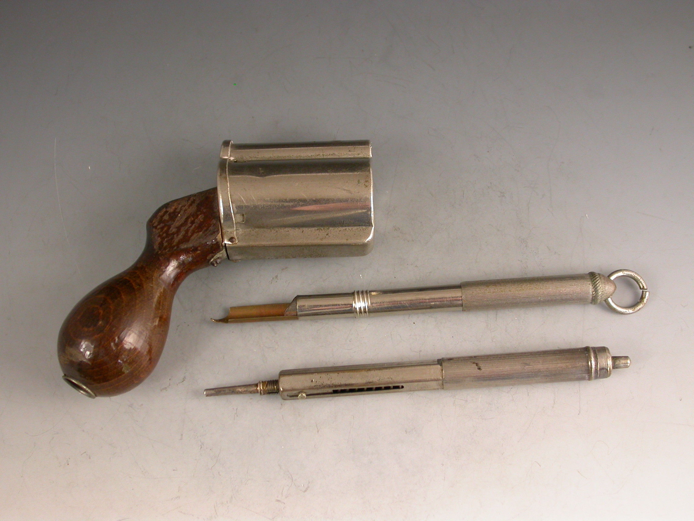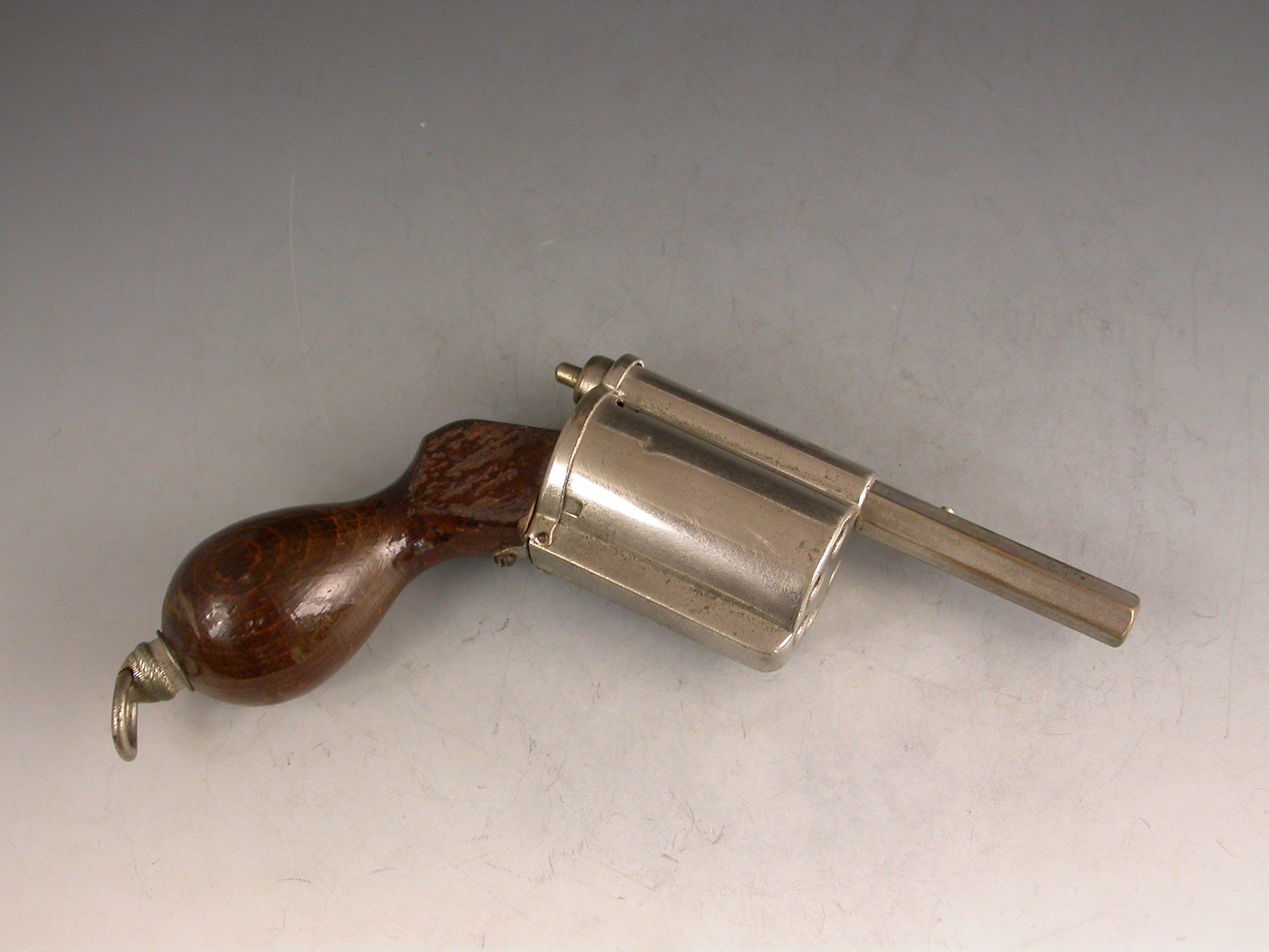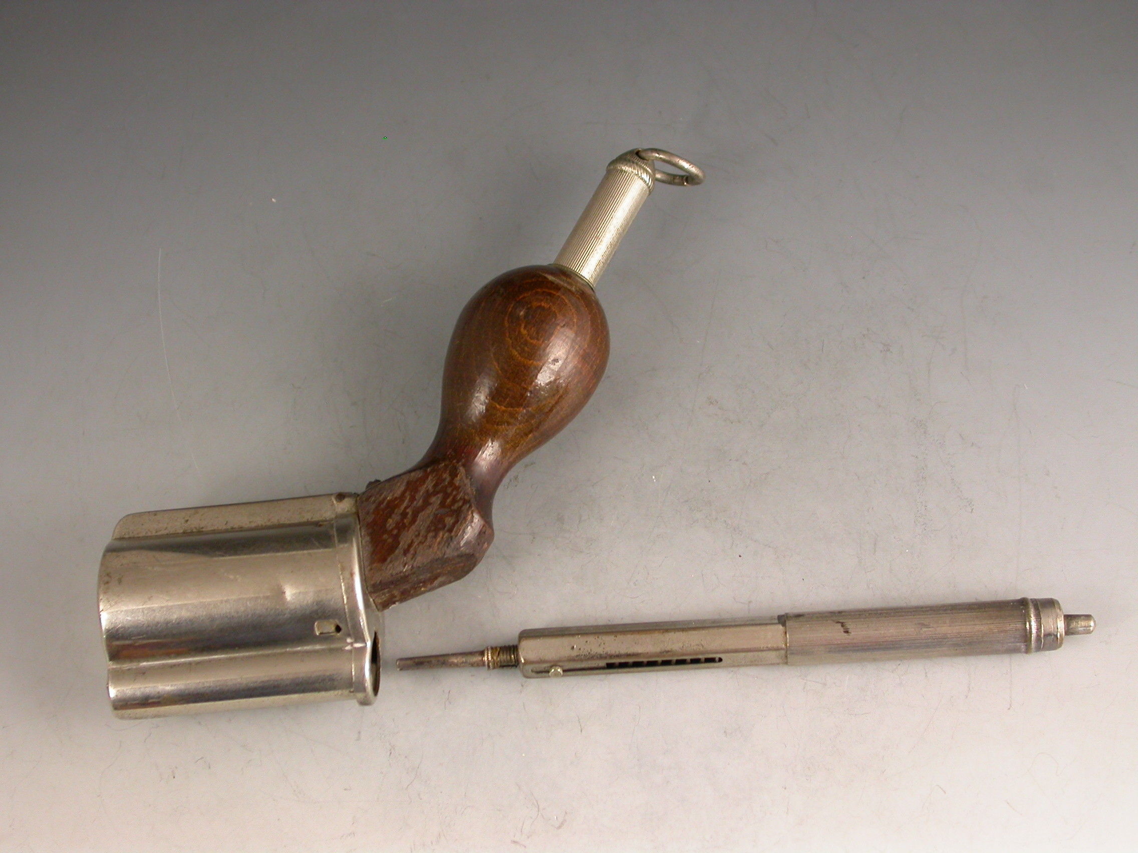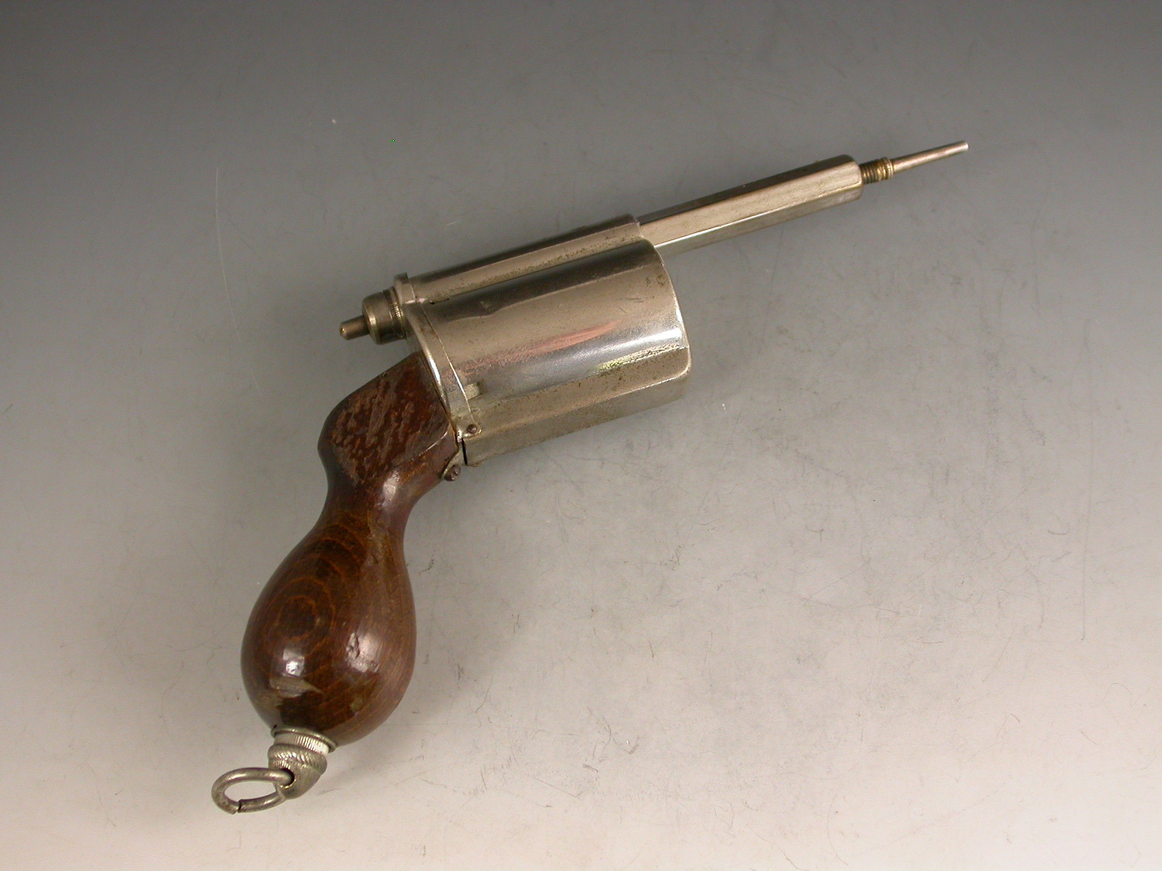 An unusual Victorian novelty silver plated Writing Compendium made in the form of a Revolver with a turned wooden handle, the barrel formed from a spring loaded propelling pencil, the chamber containing a glass inkwell and the handle concealing a telescopic dip pen, with attached suspension ring.