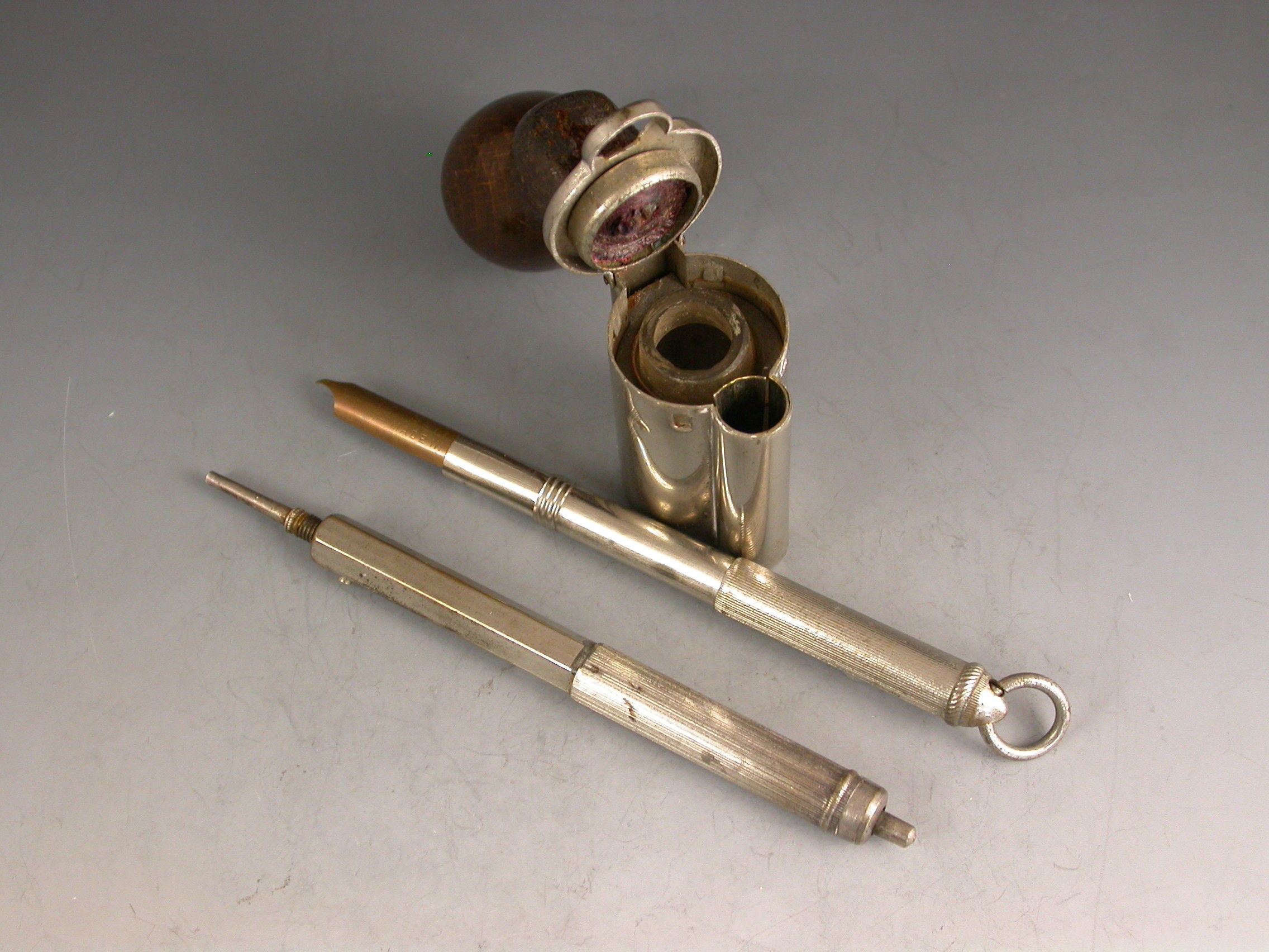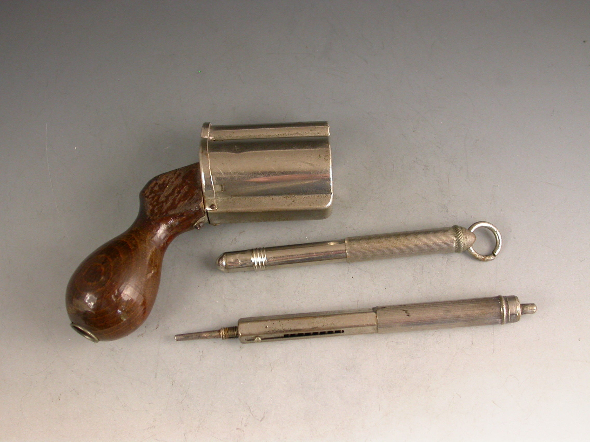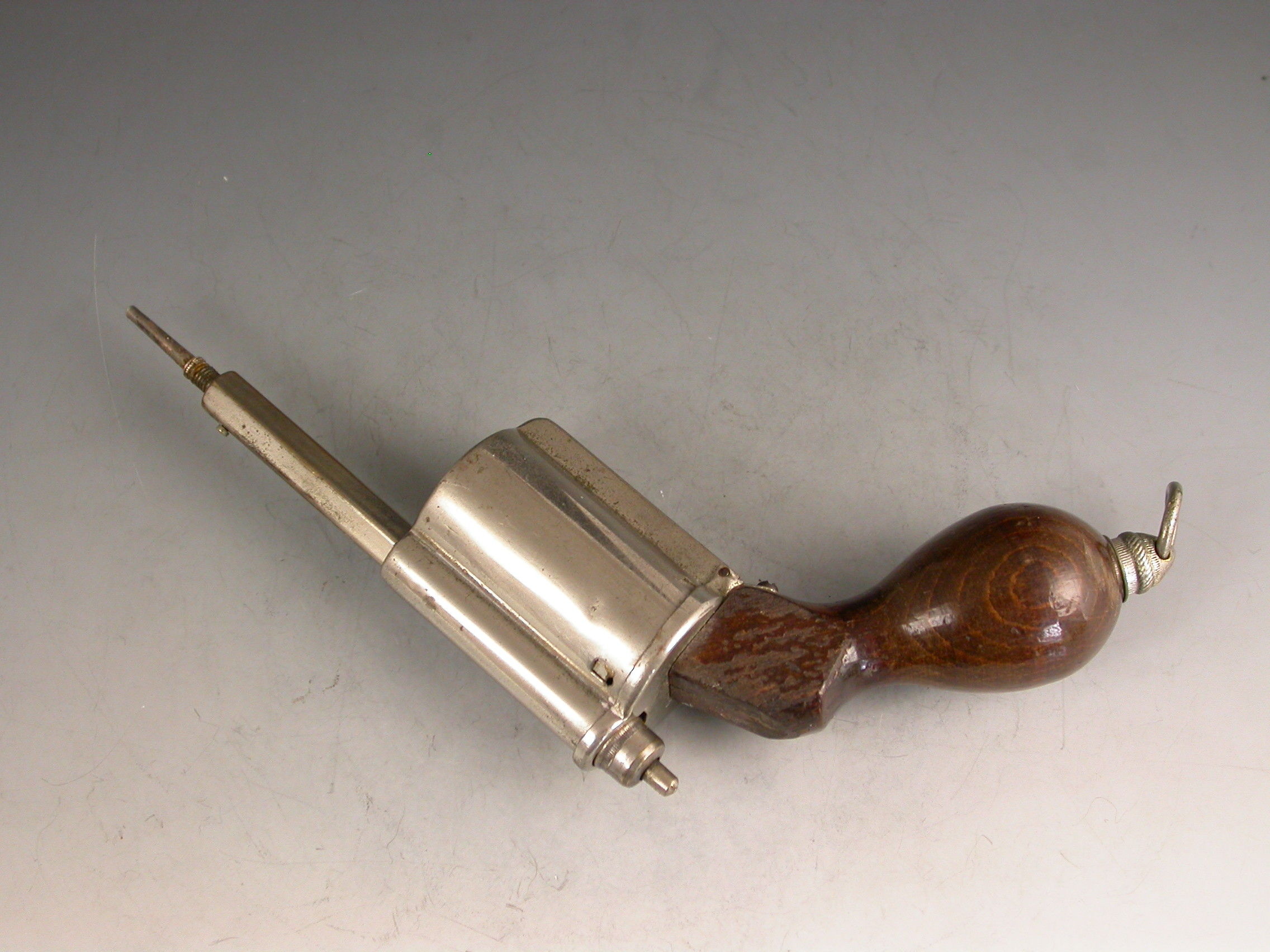An unusual Victorian novelty silver plated Writing Compendium made in the form of a Revolver with a turned wooden handle, the barrel formed from a spring loaded propelling pencil, the chamber containing a glass inkwell and the handle concealing a telescopic dip pen, with attached suspension ring.