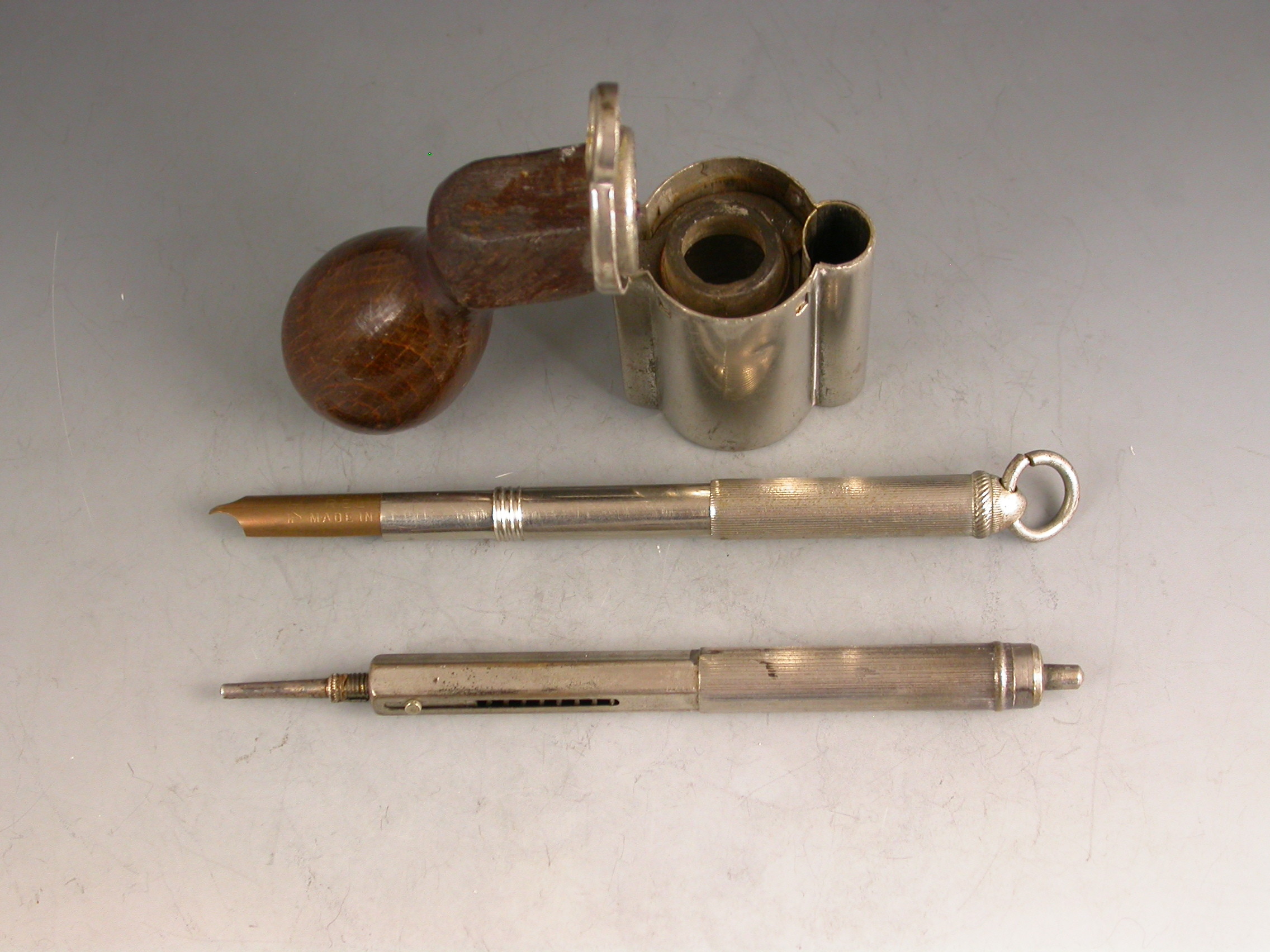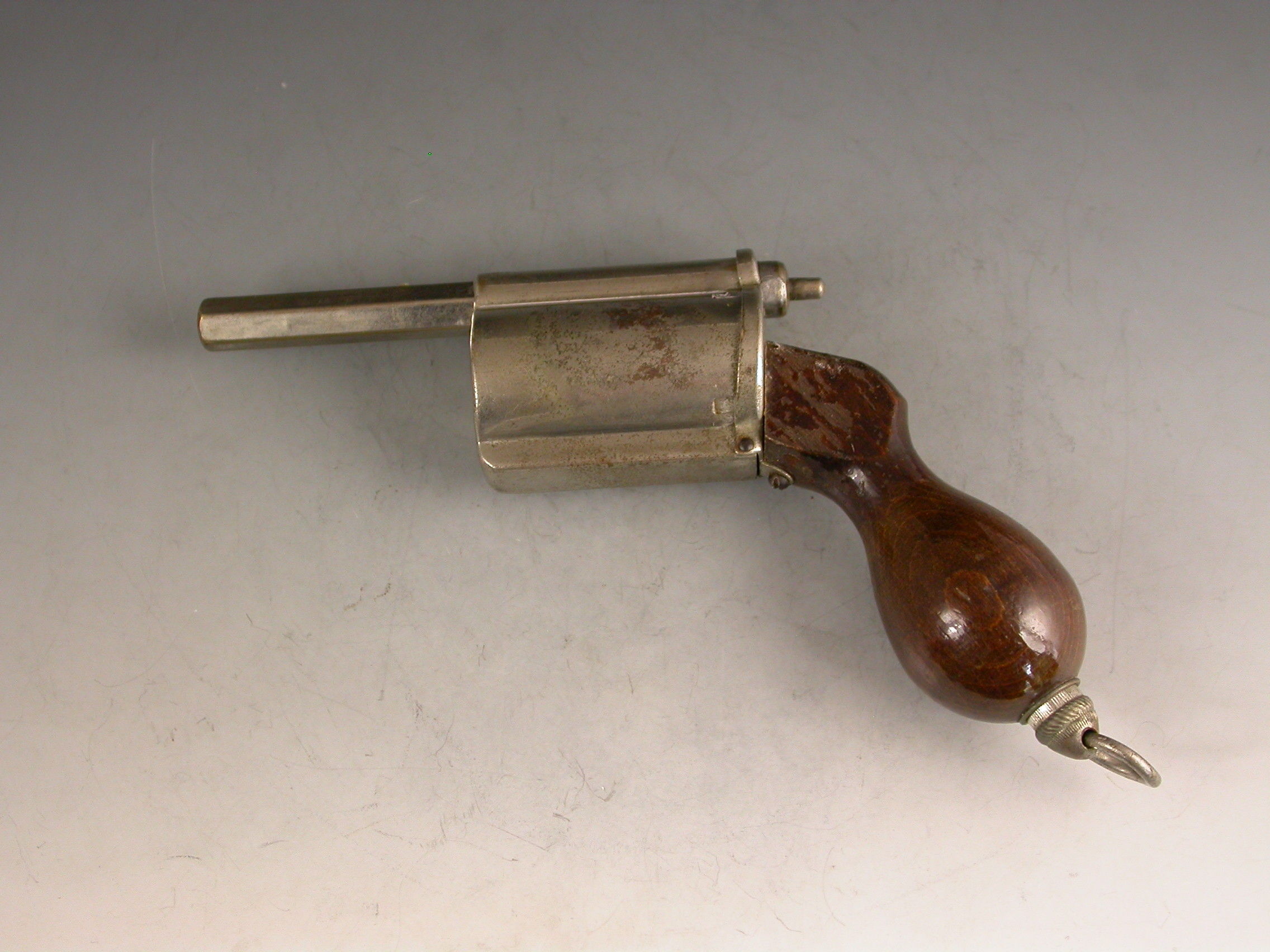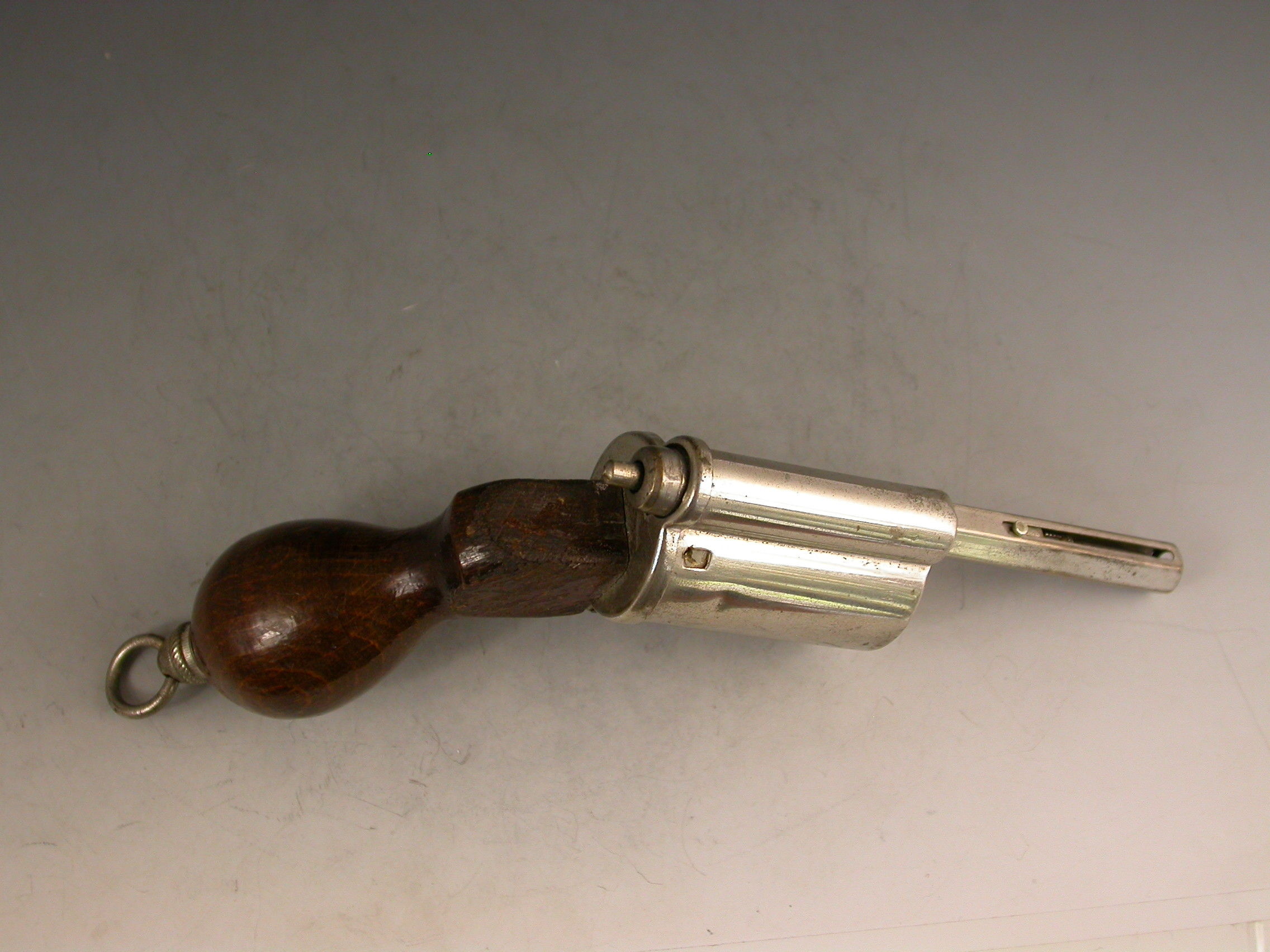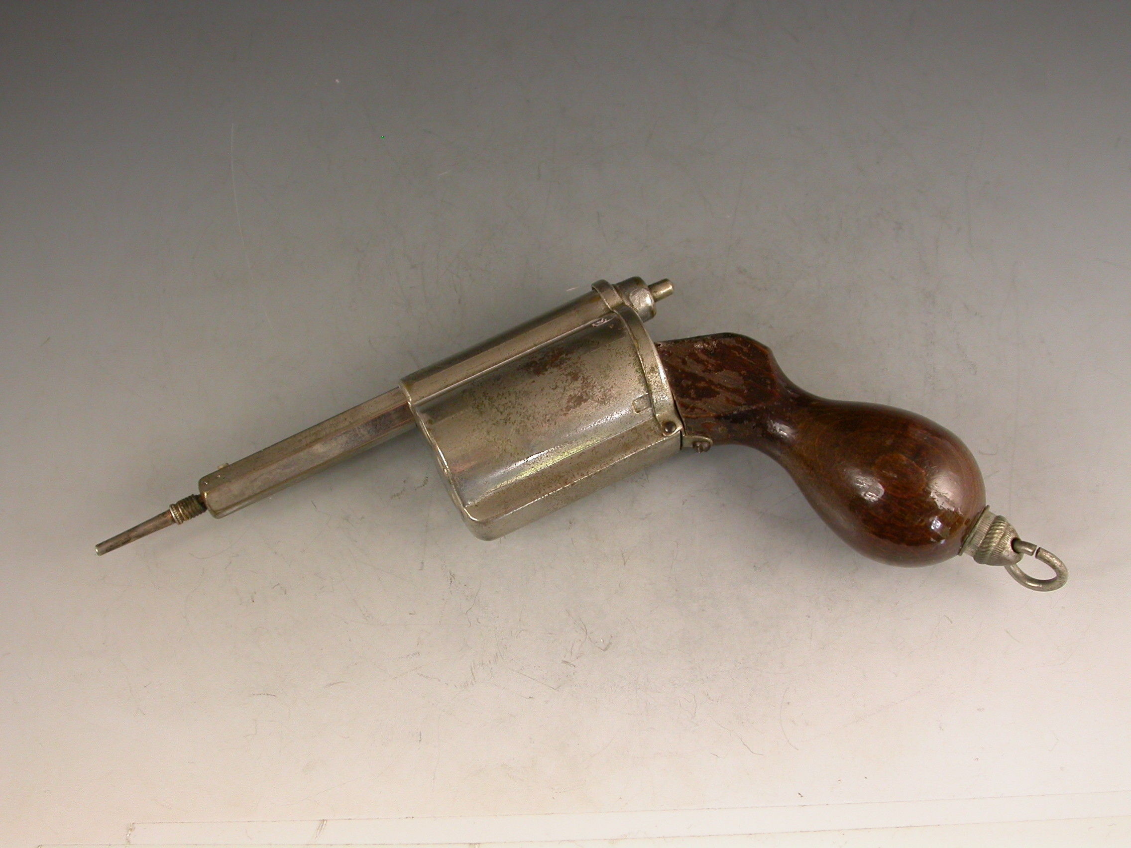 An unusual Victorian novelty silver plated Writing Compendium made in the form of a Revolver with a turned wooden handle, the barrel formed from a spring loaded propelling pencil, the chamber containing a glass inkwell and the handle concealing a telescopic dip pen, with attached suspension ring.