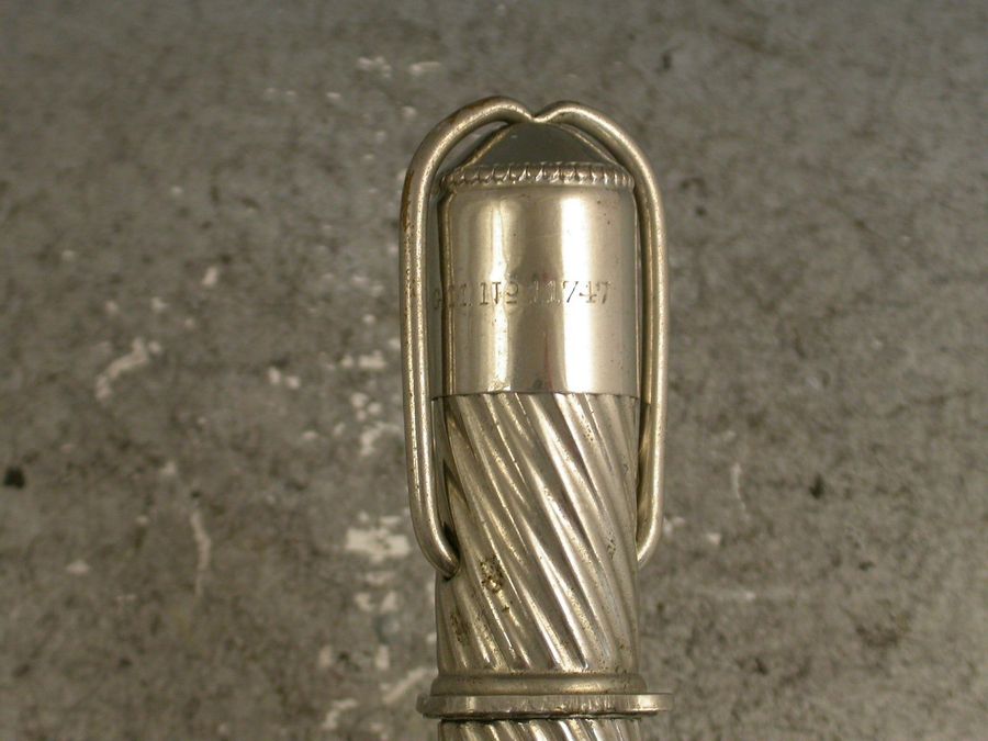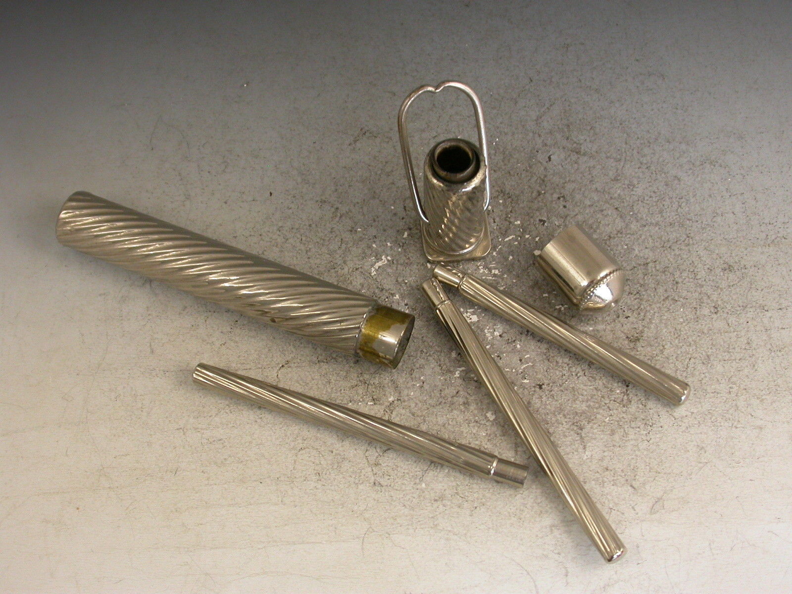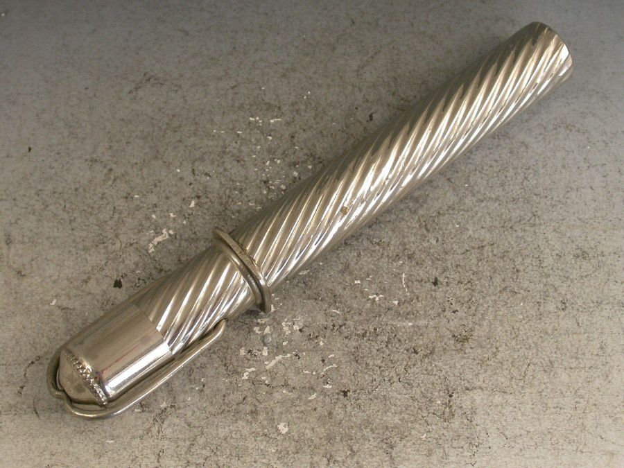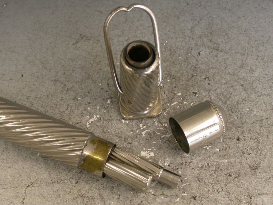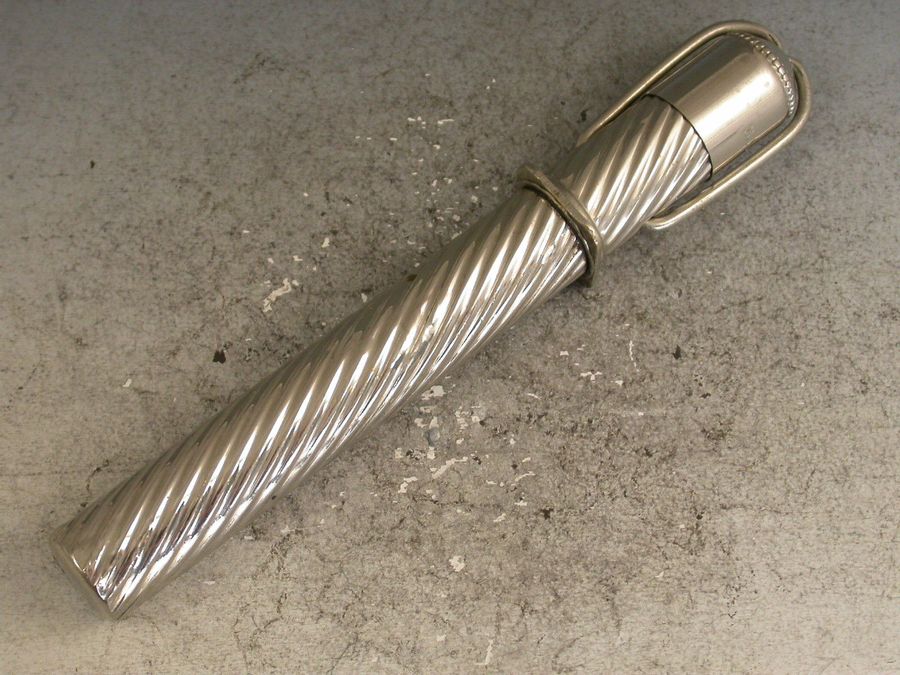 A late Victorian nickel plated silver Writing Etui Tool Set with Traveling Inkwell, the outer casing with spiral fluted design, the hinged hook over the top releases the lid to the inkwell. Inside the lid is a glass ink bottle that is slightly sprung so that when the lid is replaced and the hook is pulled over the bottle it is sealed by an interior stopper. The whole top section pulls off to reveal a storage compartment for a dip pen, a pencil and an eraser. The pencil and dip pen pull out and when reversed fit back into their holders to make a full size tool. The tools have matching spiral fluted handles. c1900.