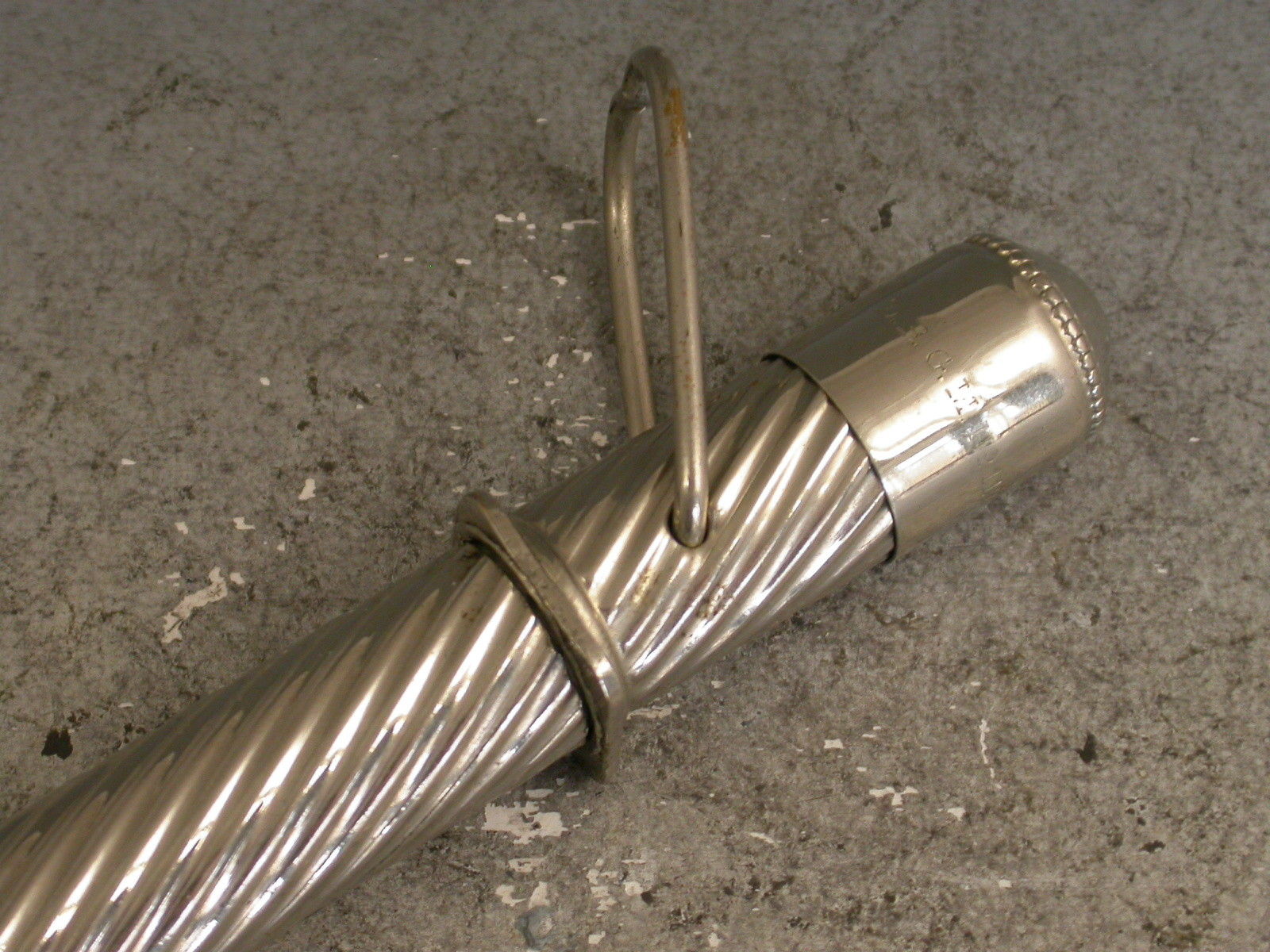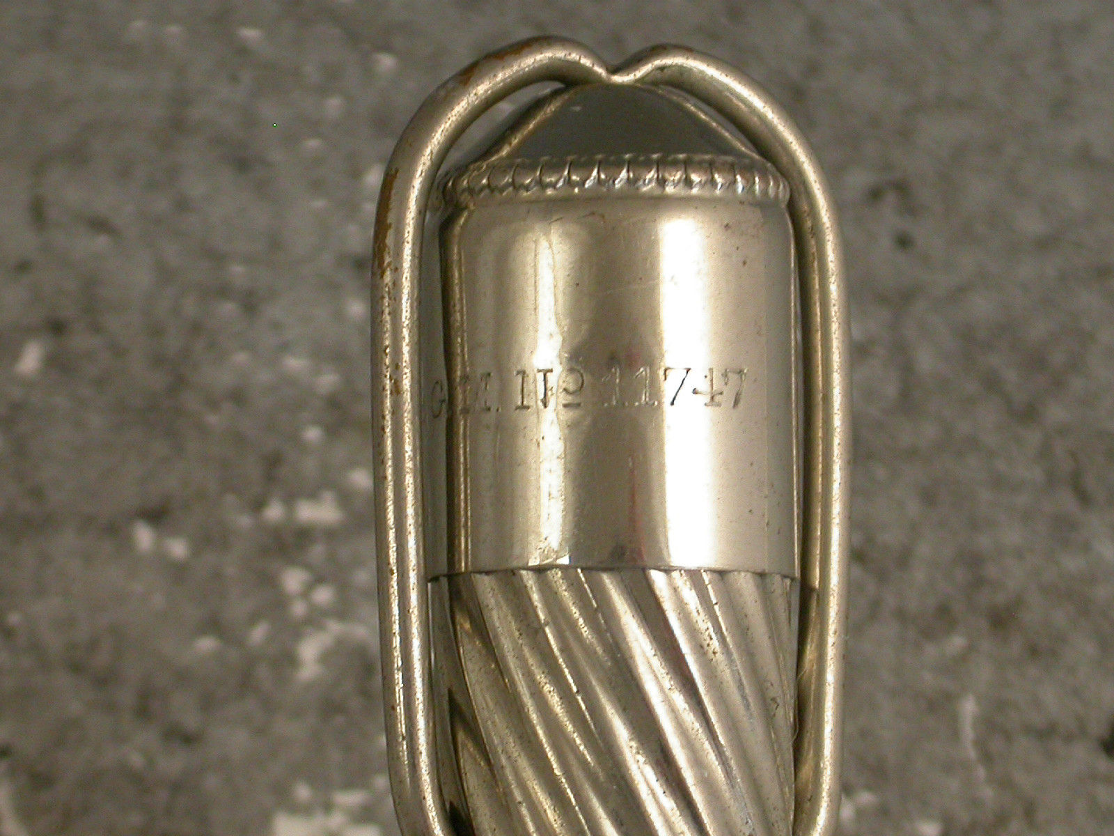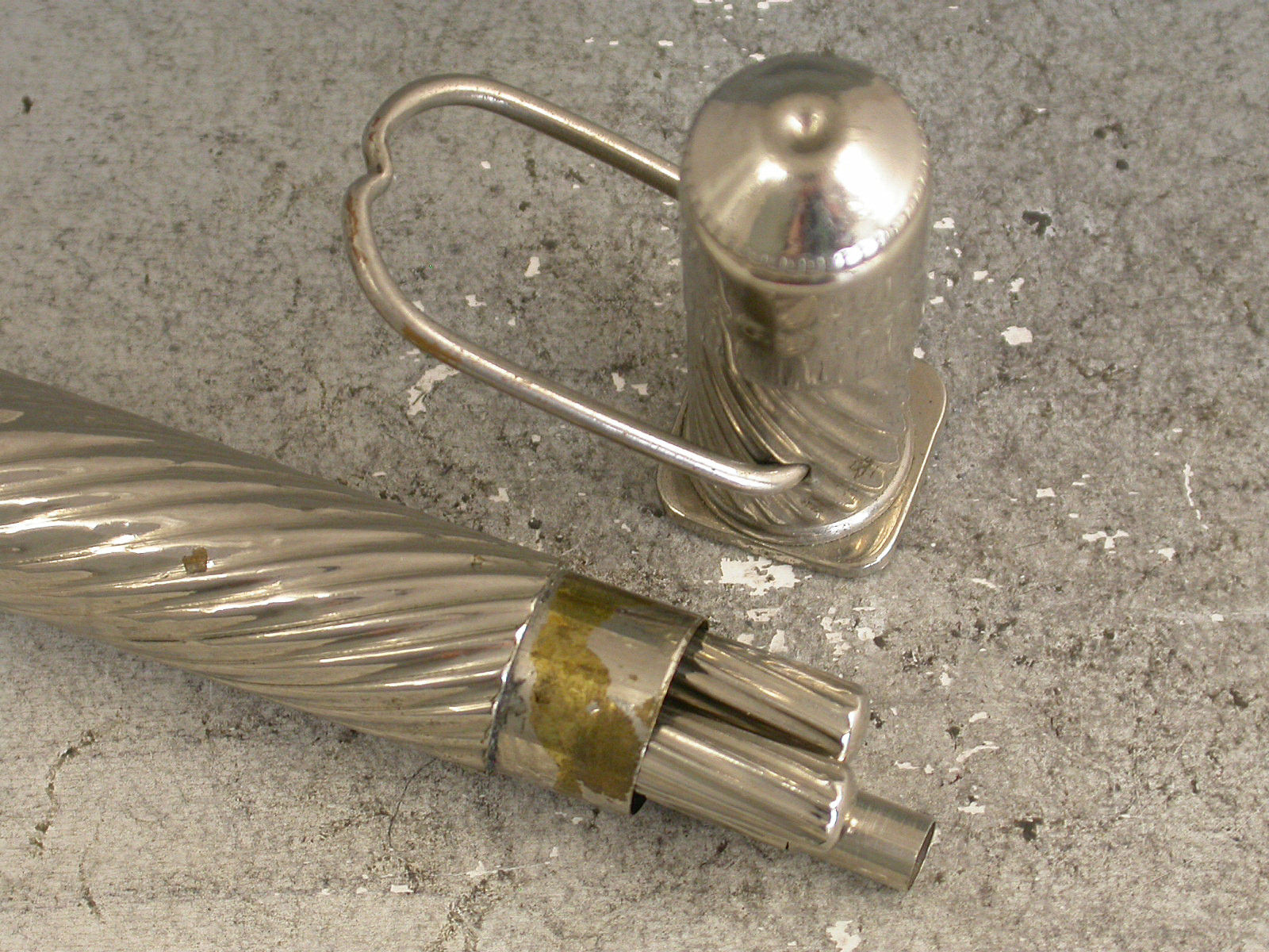 A late Victorian nickel plated silver Writing Etui Tool Set with Traveling Inkwell, the outer casing with spiral fluted design, the hinged hook over the top releases the lid to the inkwell. Inside the lid is a glass ink bottle that is slightly sprung so that when the lid is replaced and the hook is pulled over the bottle it is sealed by an interior stopper. The whole top section pulls off to reveal a storage compartment for a dip pen, a pencil and an eraser. The pencil and dip pen pull out and when reversed fit back into their holders to make a full size tool. The tools have matching spiral fluted handles. c1900.
