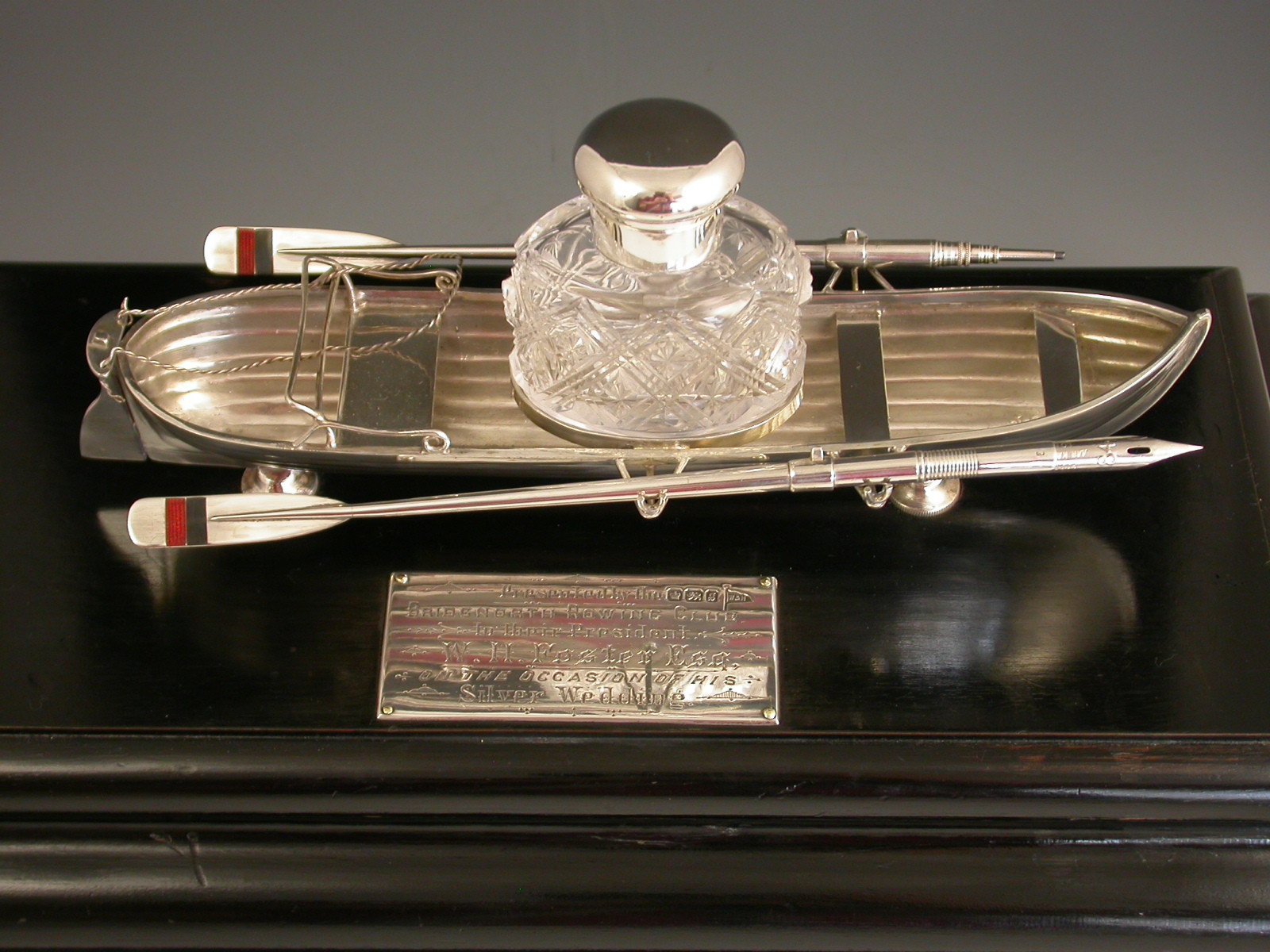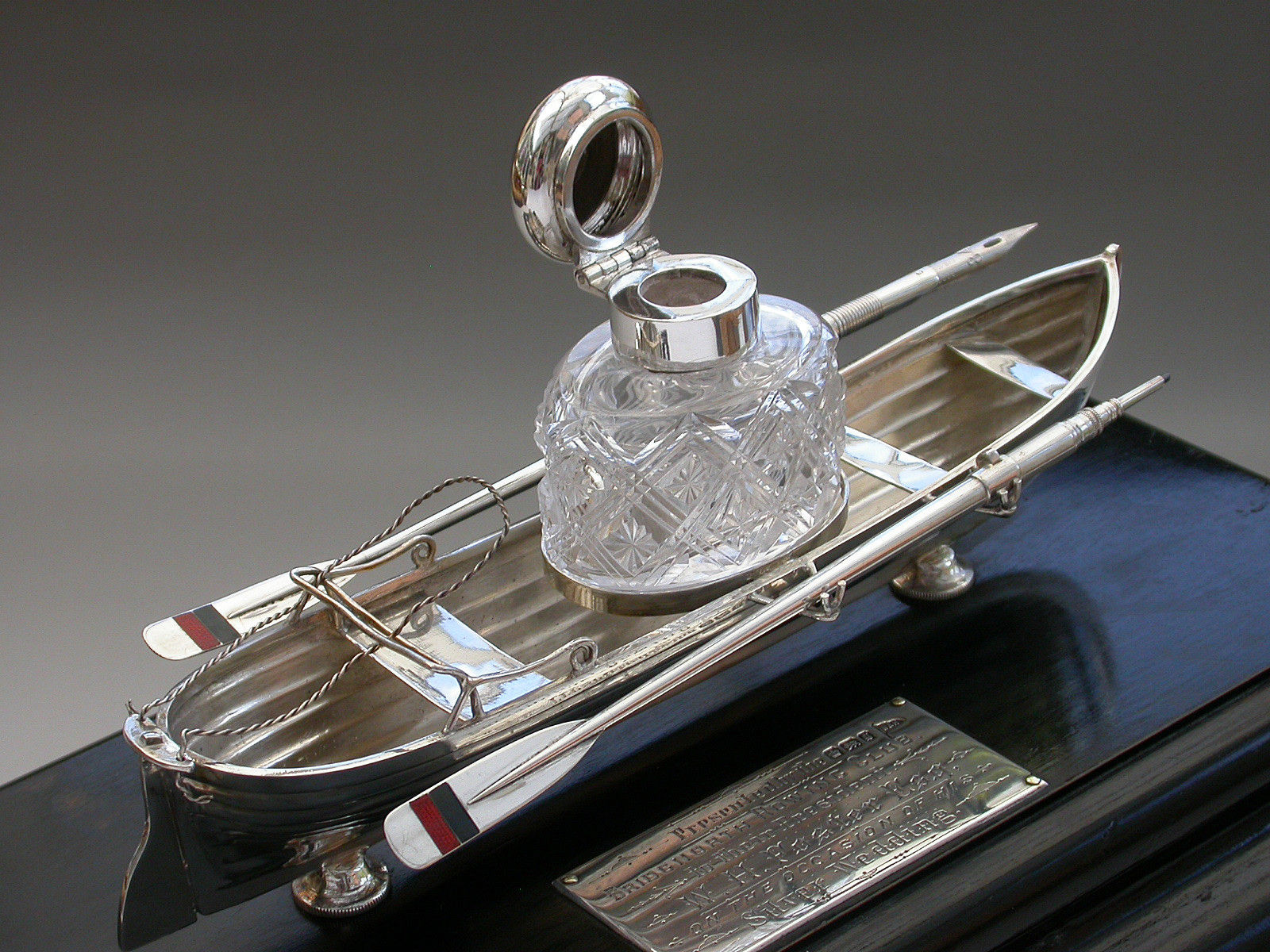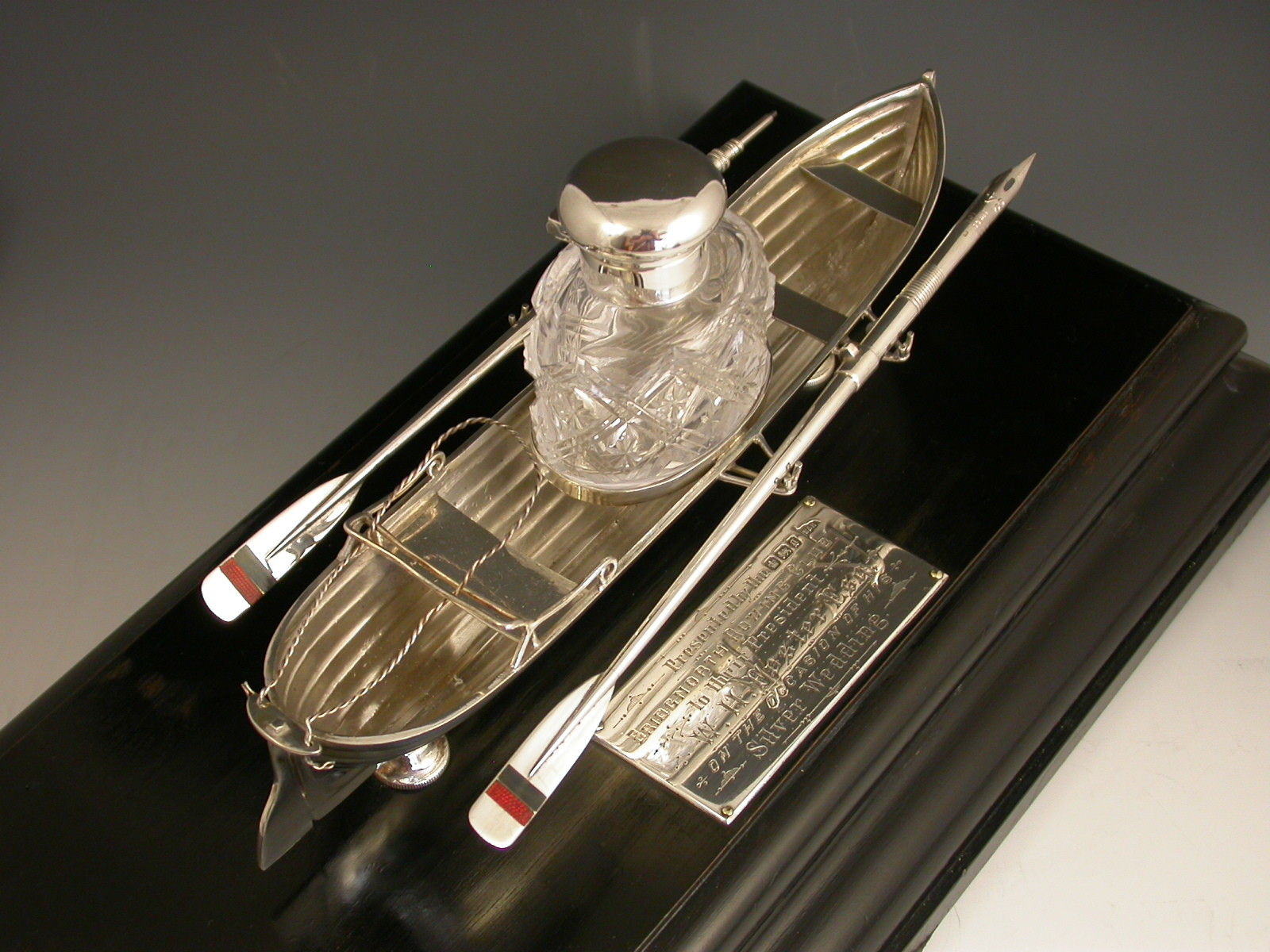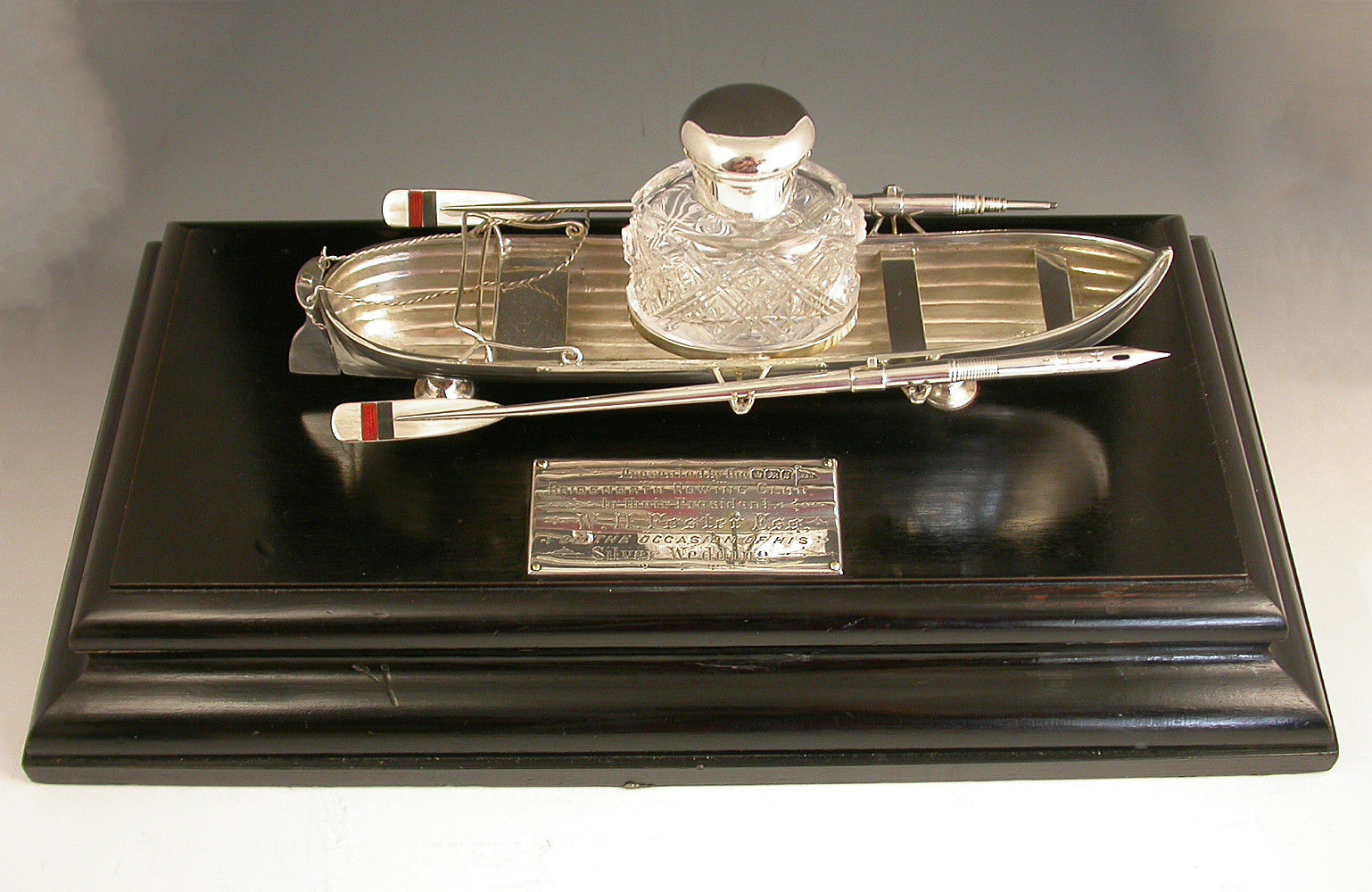 An extremely fine Victorian silver Presentation Table Writing Set of superb quality, modelled in the most unusual form of a silver Rowing Boat supported on a wood plinth with inscribed silver plaque. The centre Bench Seat holding the original silver and cut glass inkwell in a frame and the rowlocks holding two oars with the colours of Bridgenorth Rowing Club in enamel, one a dip pen and the other a propelling pencil.
