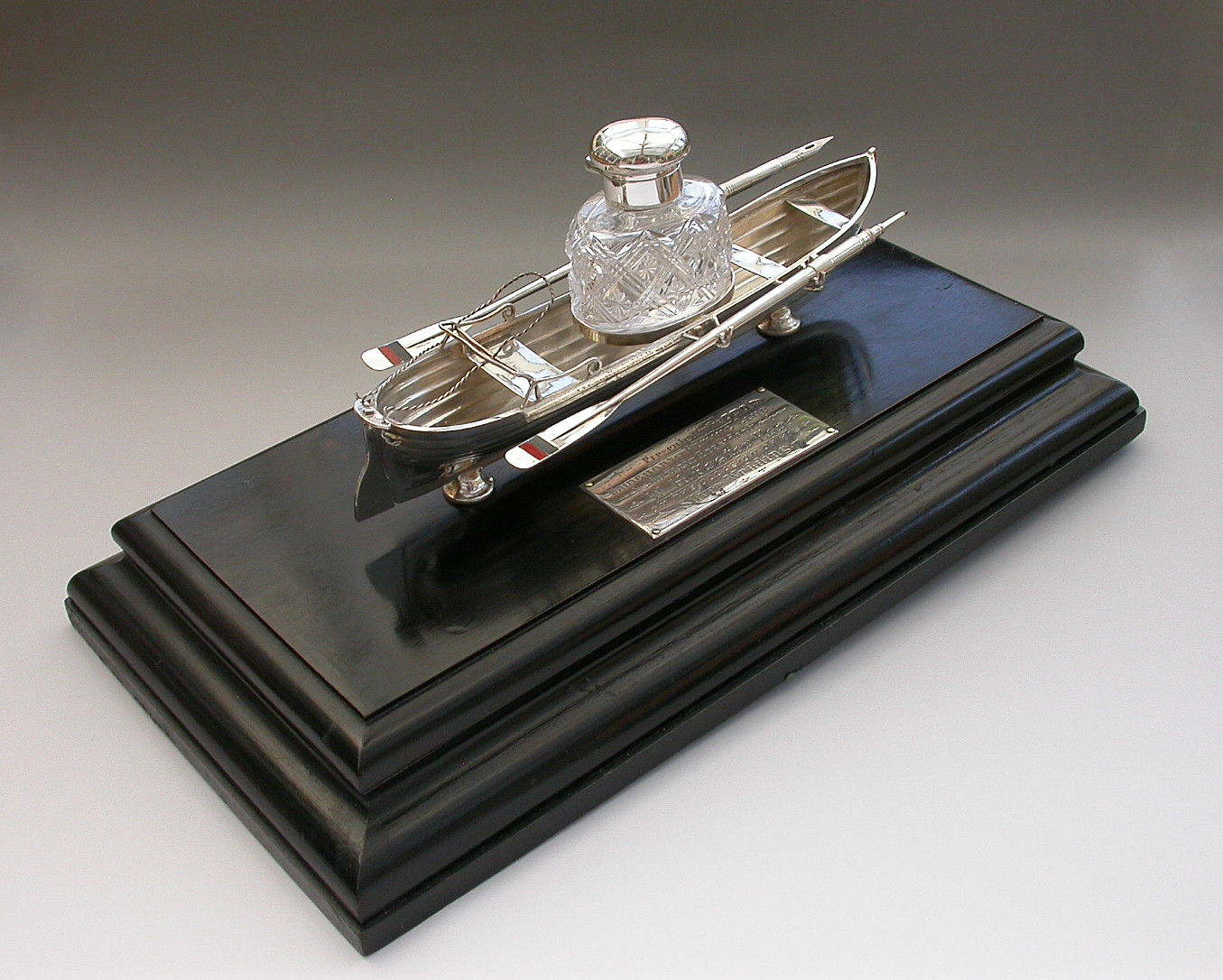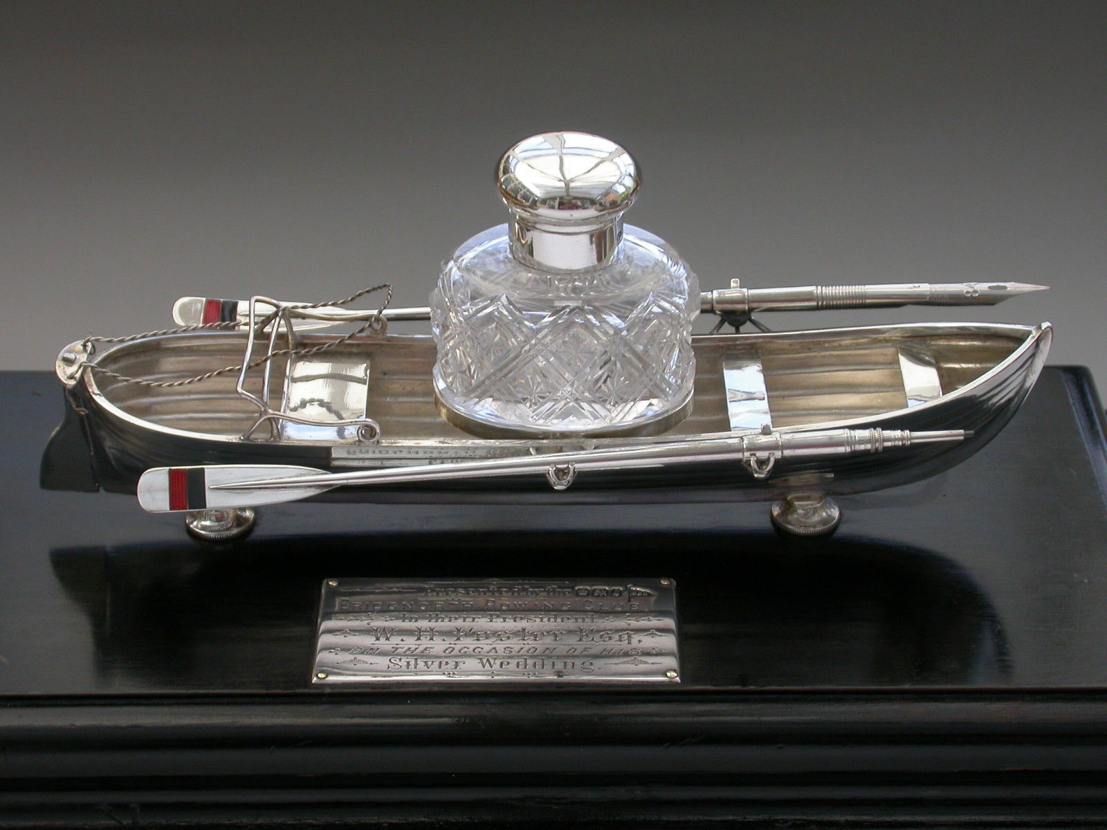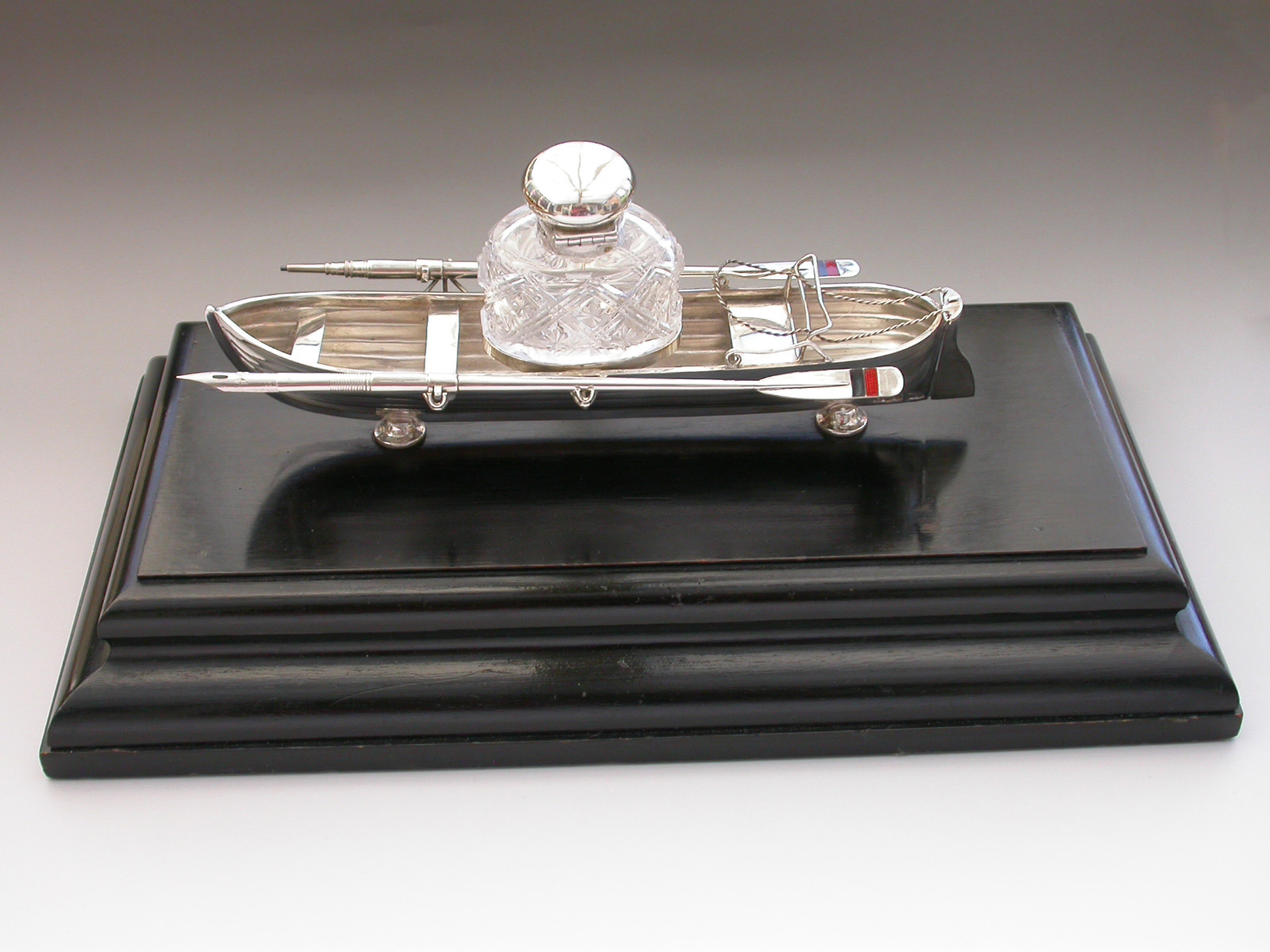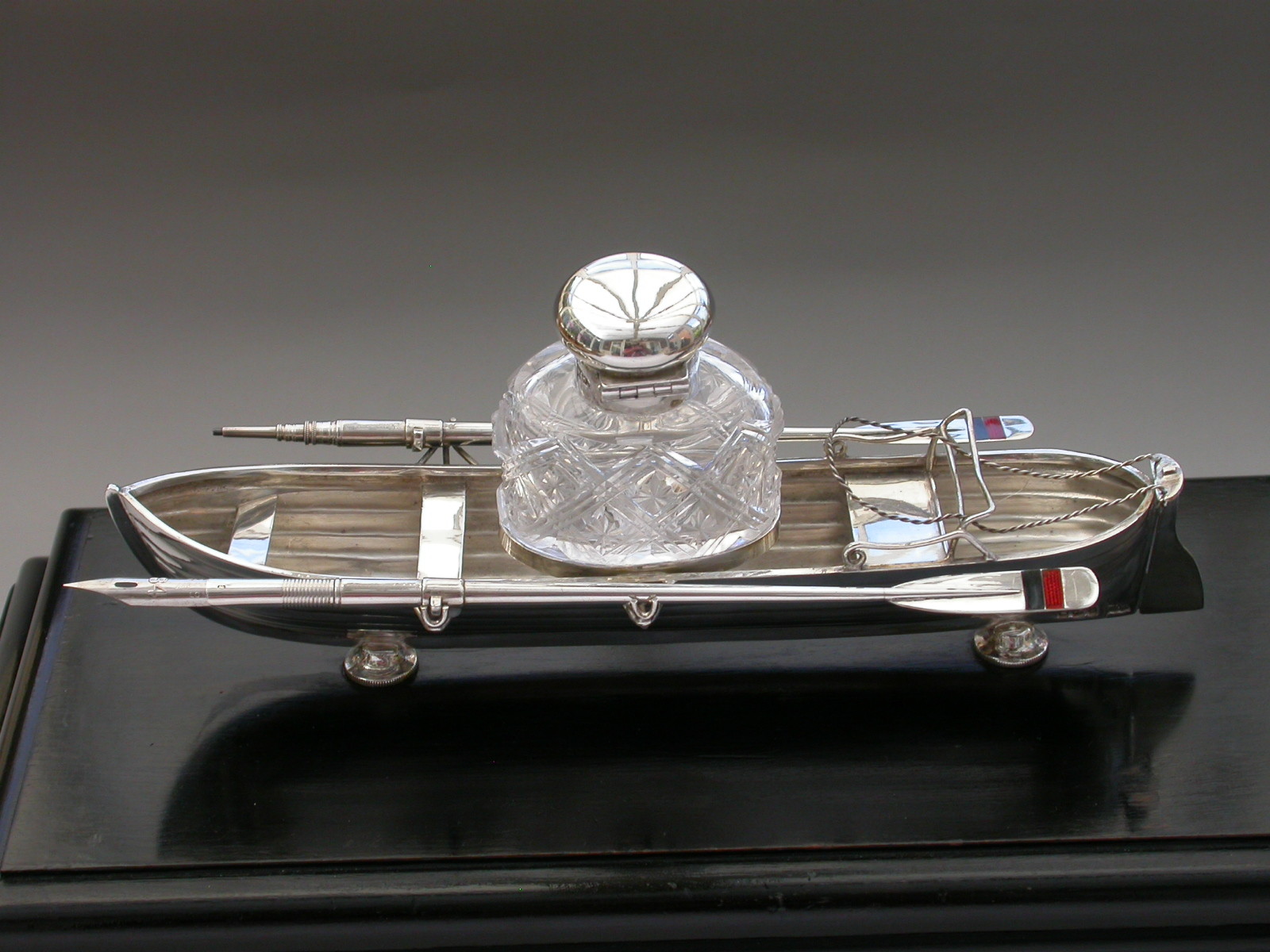 An extremely fine Victorian silver Presentation Table Writing Set of superb quality, modelled in the most unusual form of a silver Rowing Boat supported on a wood plinth with inscribed silver plaque. The centre Bench Seat holding the original silver and cut glass inkwell in a frame and the rowlocks holding two oars with the colours of Bridgenorth Rowing Club in enamel, one a dip pen and the other a propelling pencil.