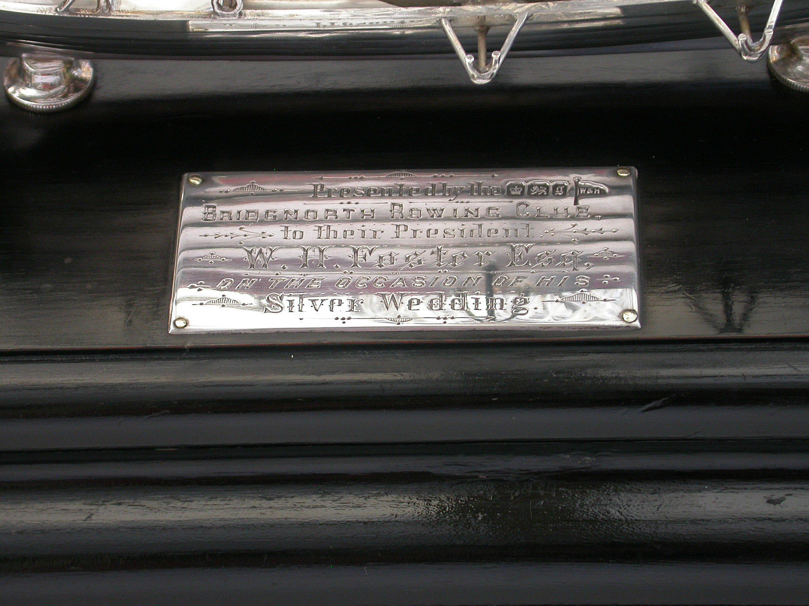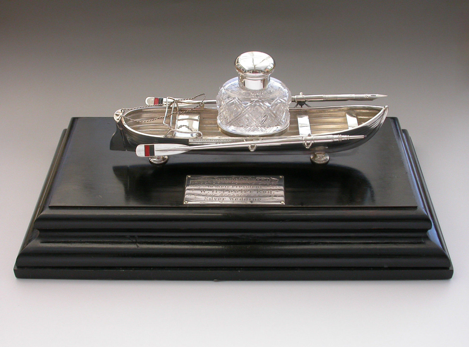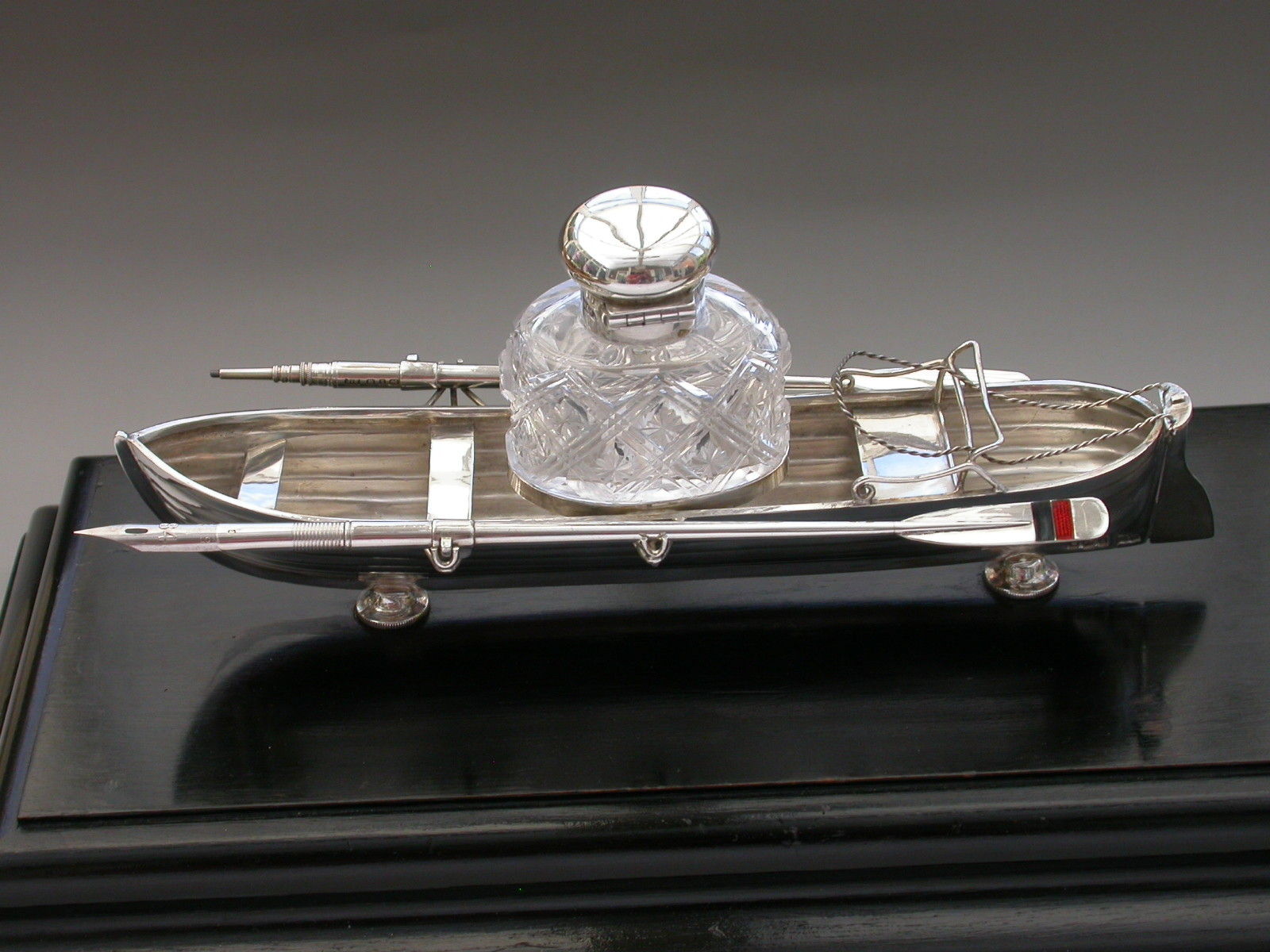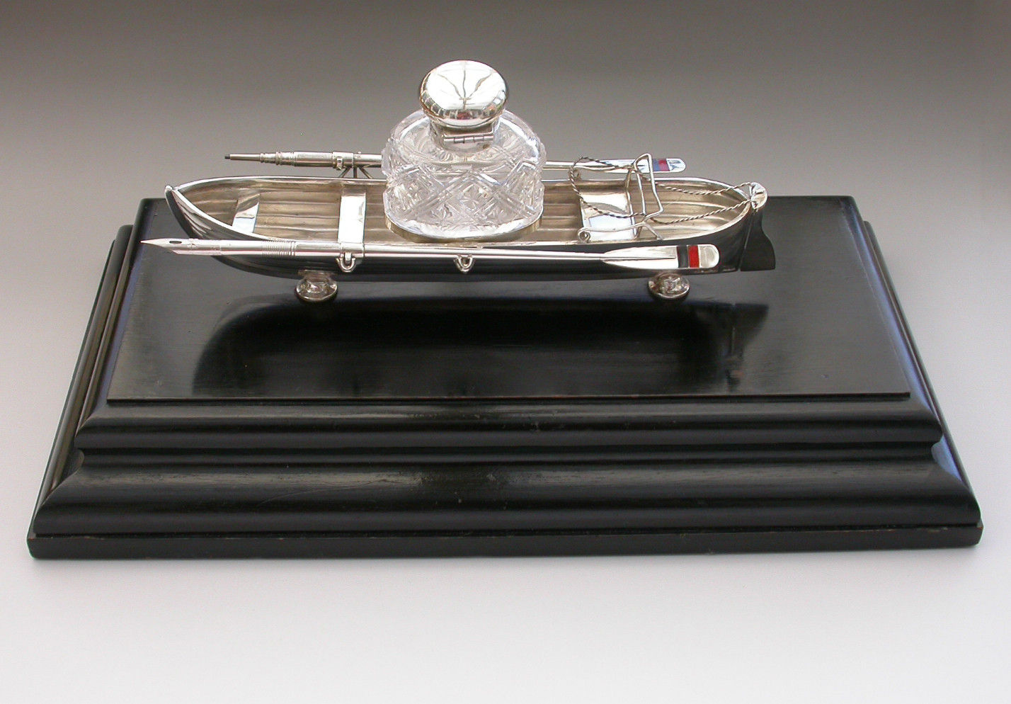 An extremely fine Victorian silver Presentation Table Writing Set of superb quality, modelled in the most unusual form of a silver Rowing Boat supported on a wood plinth with inscribed silver plaque. The centre Bench Seat holding the original silver and cut glass inkwell in a frame and the rowlocks holding two oars with the colours of Bridgenorth Rowing Club in enamel, one a dip pen and the other a propelling pencil.