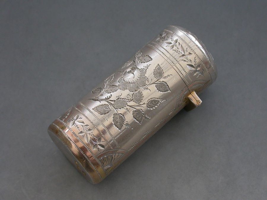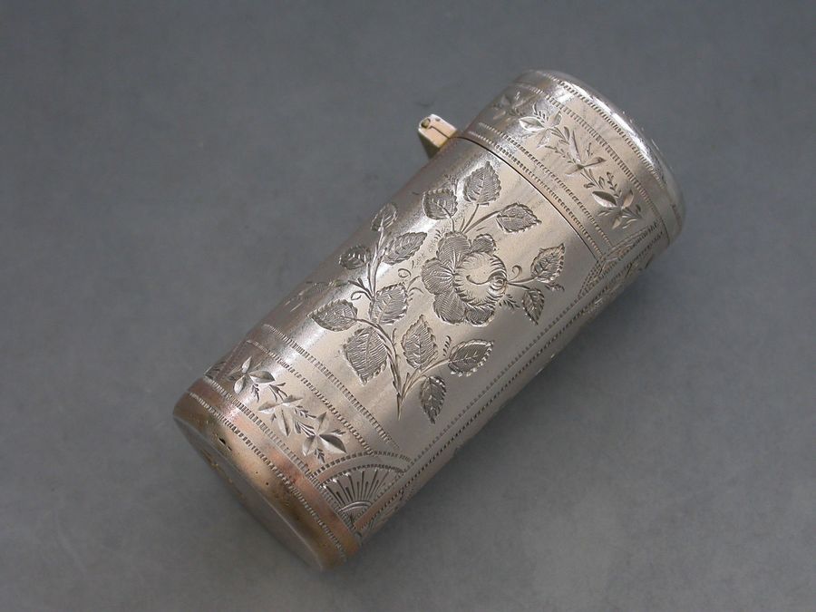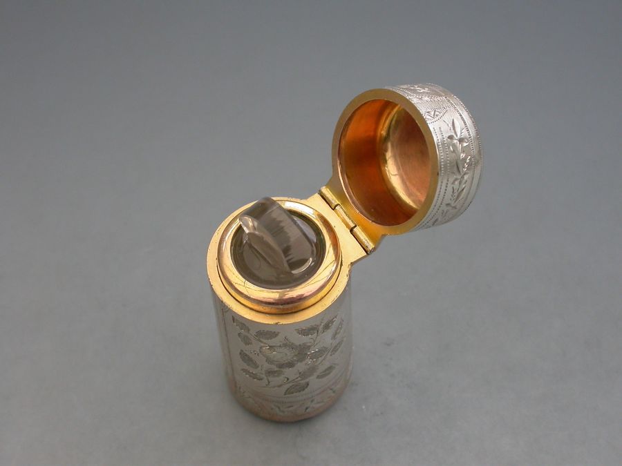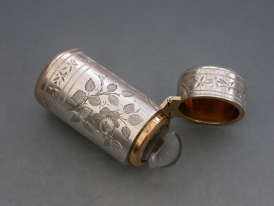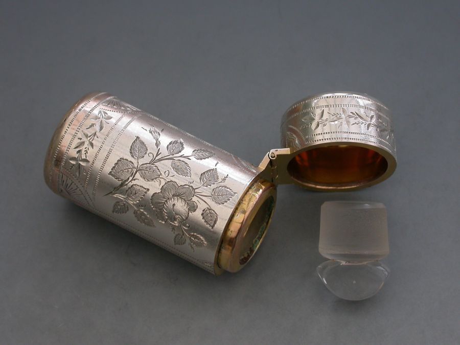 A fine quality Victorian silver Scent Bottle of cylindrical form with hinged lid, glass liner and stopper, the body crisply engraved with panels of roses and leaves.