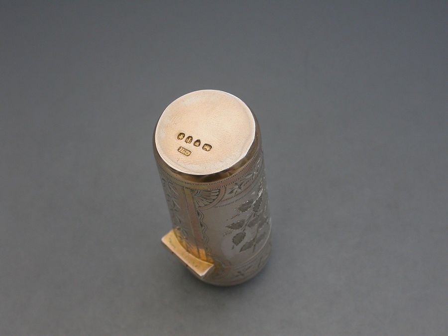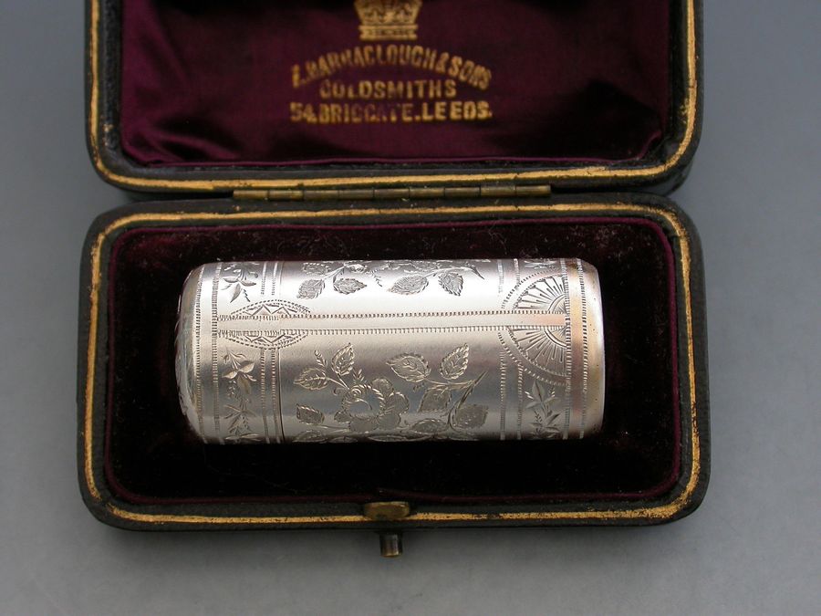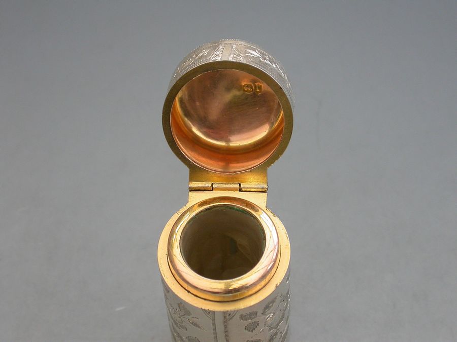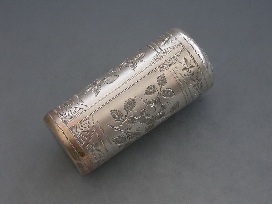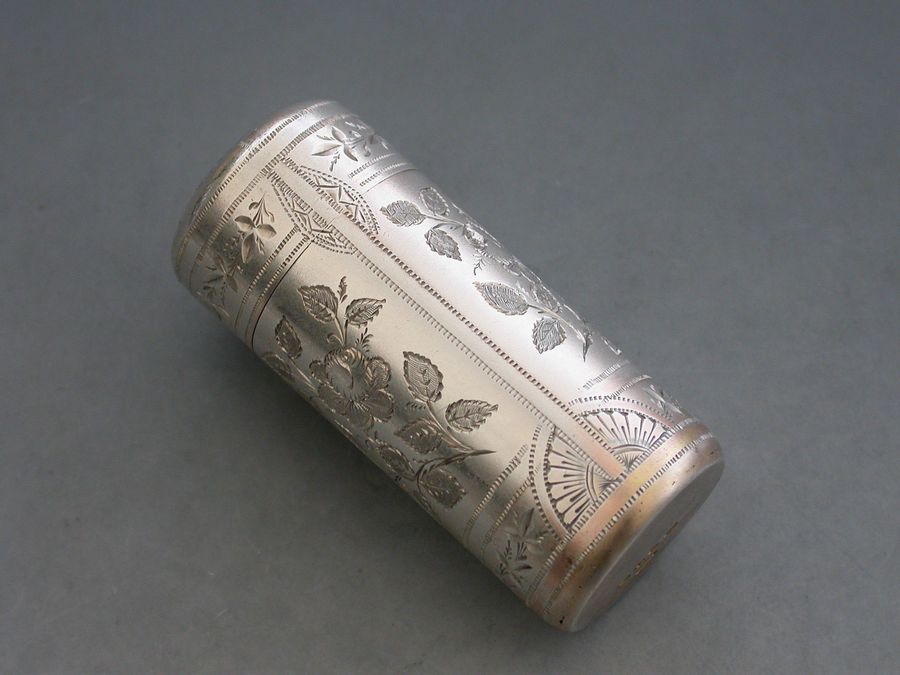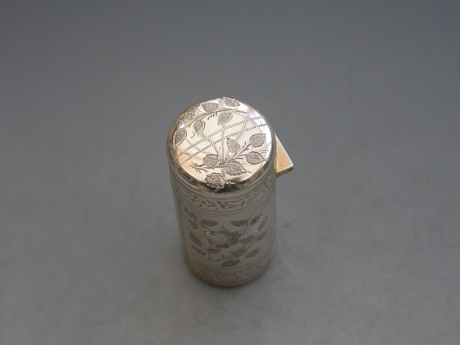 A fine quality Victorian silver Scent Bottle of cylindrical form with hinged lid, glass liner and stopper, the body crisply engraved with panels of roses and leaves.