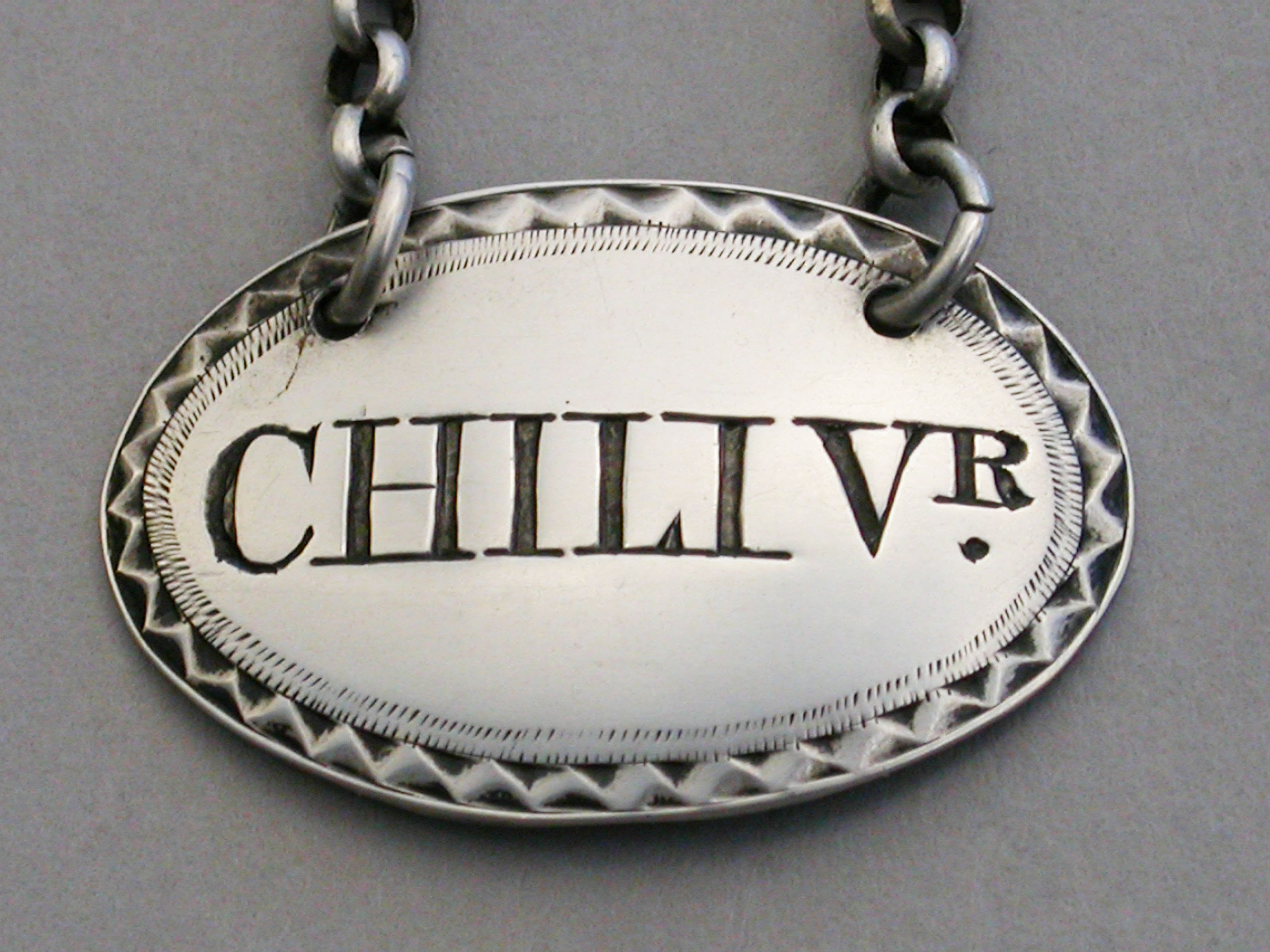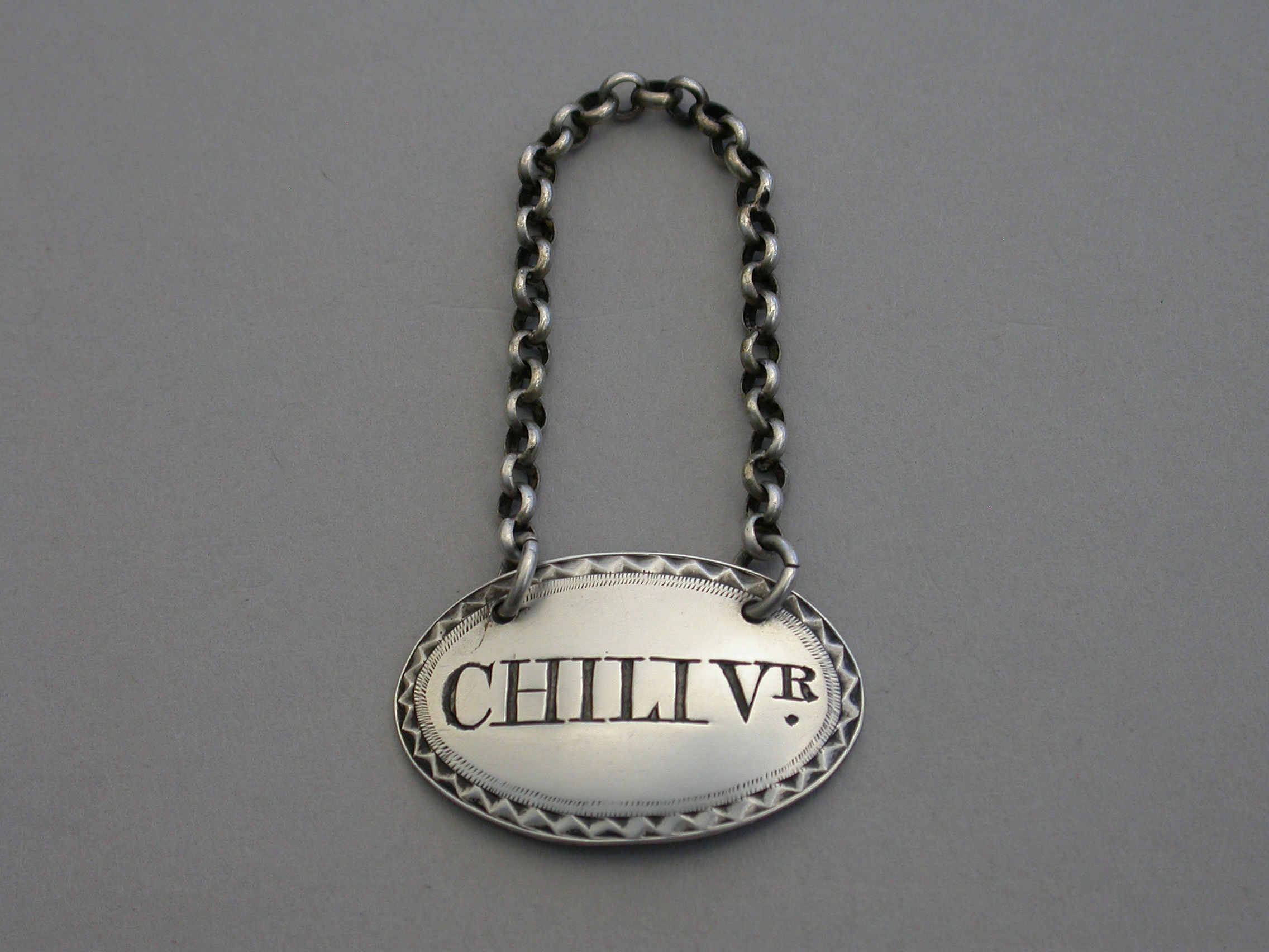 A fine early Victorian silver Sauce Label of oval form with bright-cut engraved border, incised for CHILI VR.