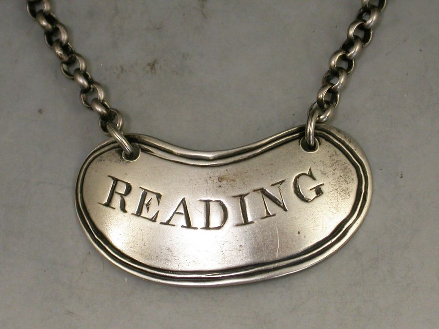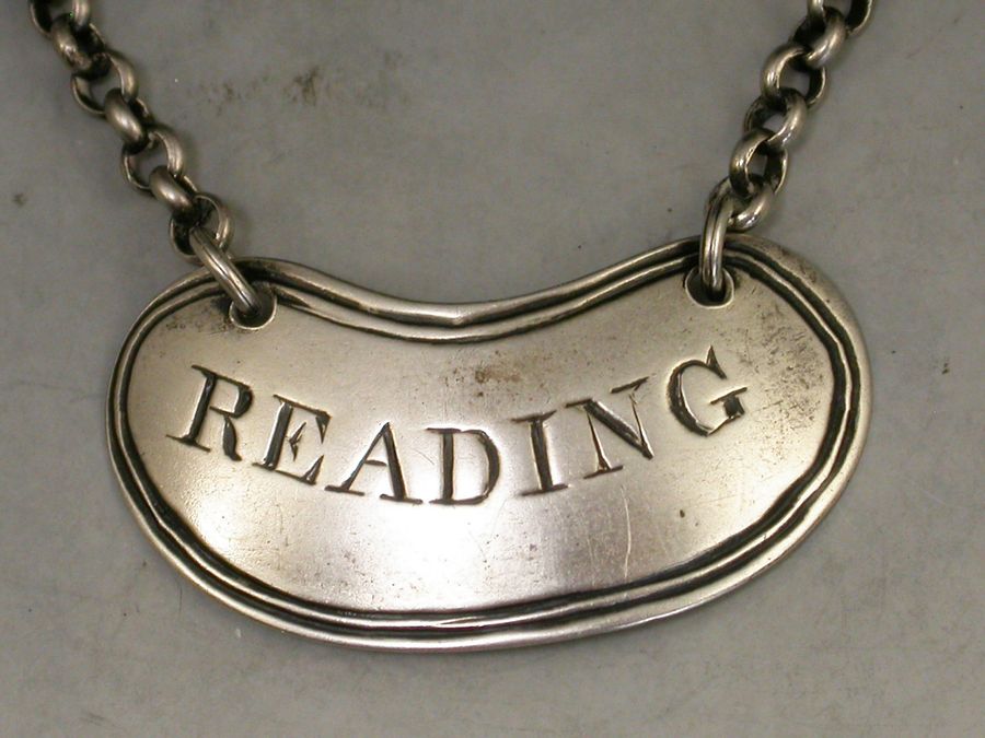 A rare Victorian silver Sauce Label of kidney shape with double reeded border, incised for Reading.