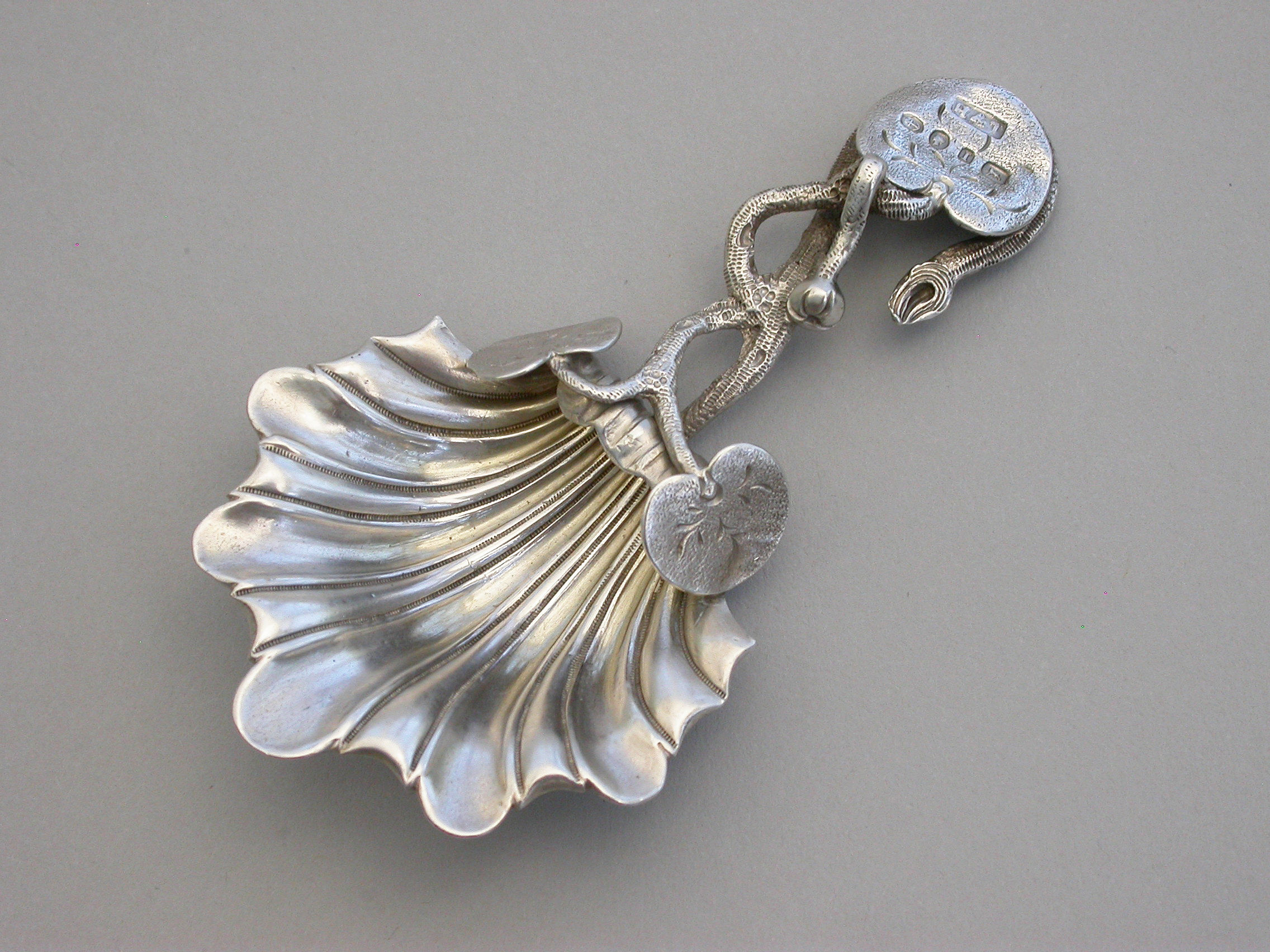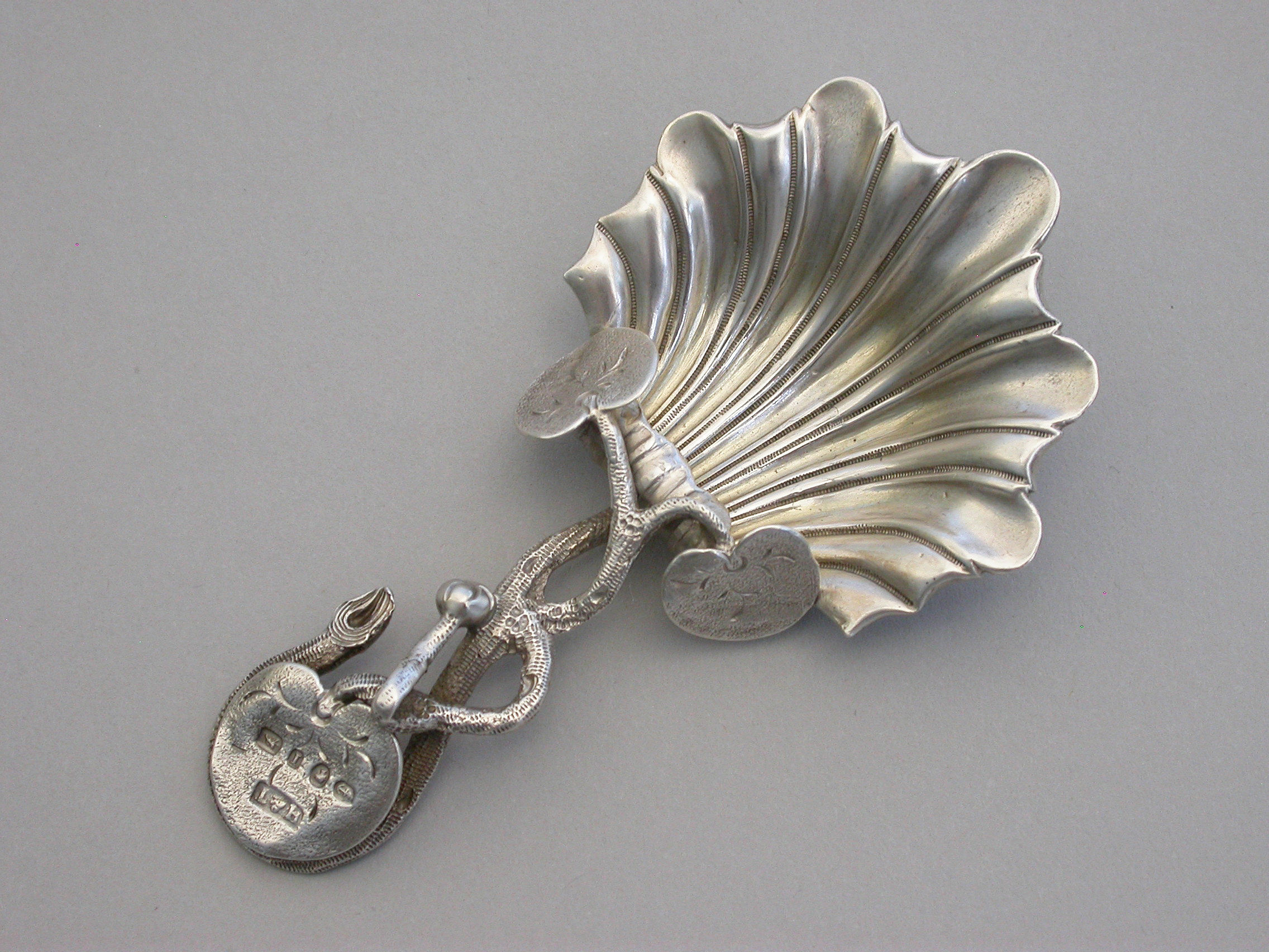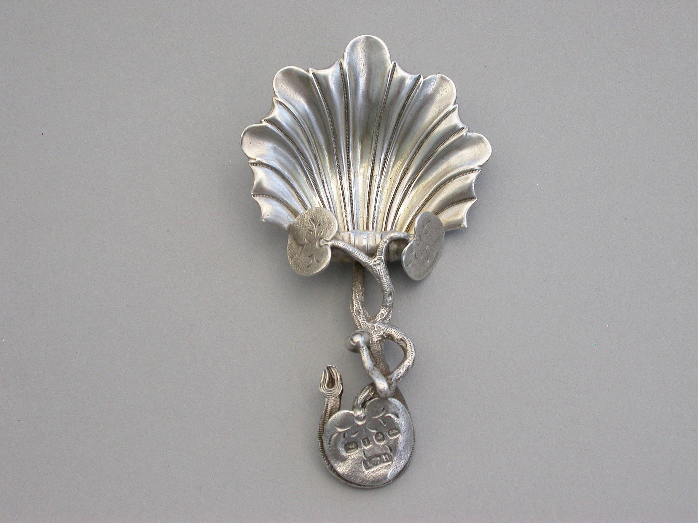 A rare Victorian silver Caddy Spoon with unusual scallop shell shaped bowl and entwinned lily leaf handle.