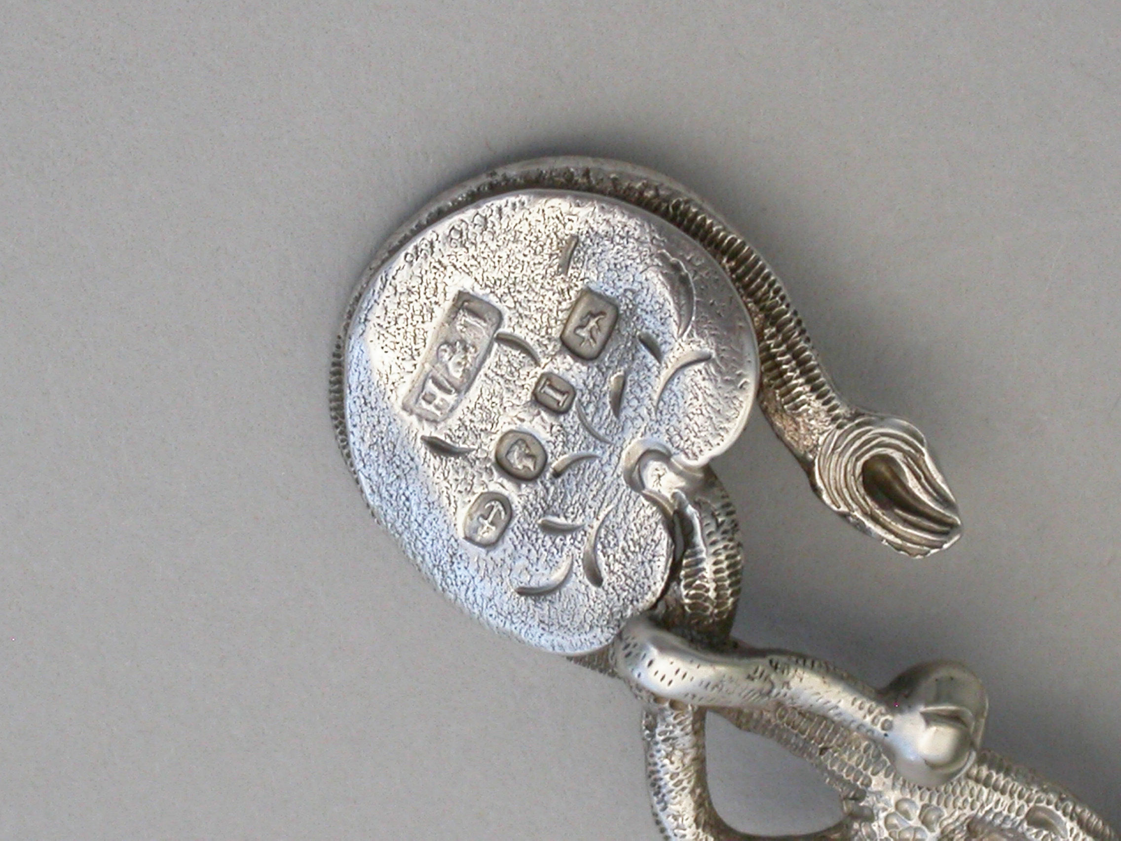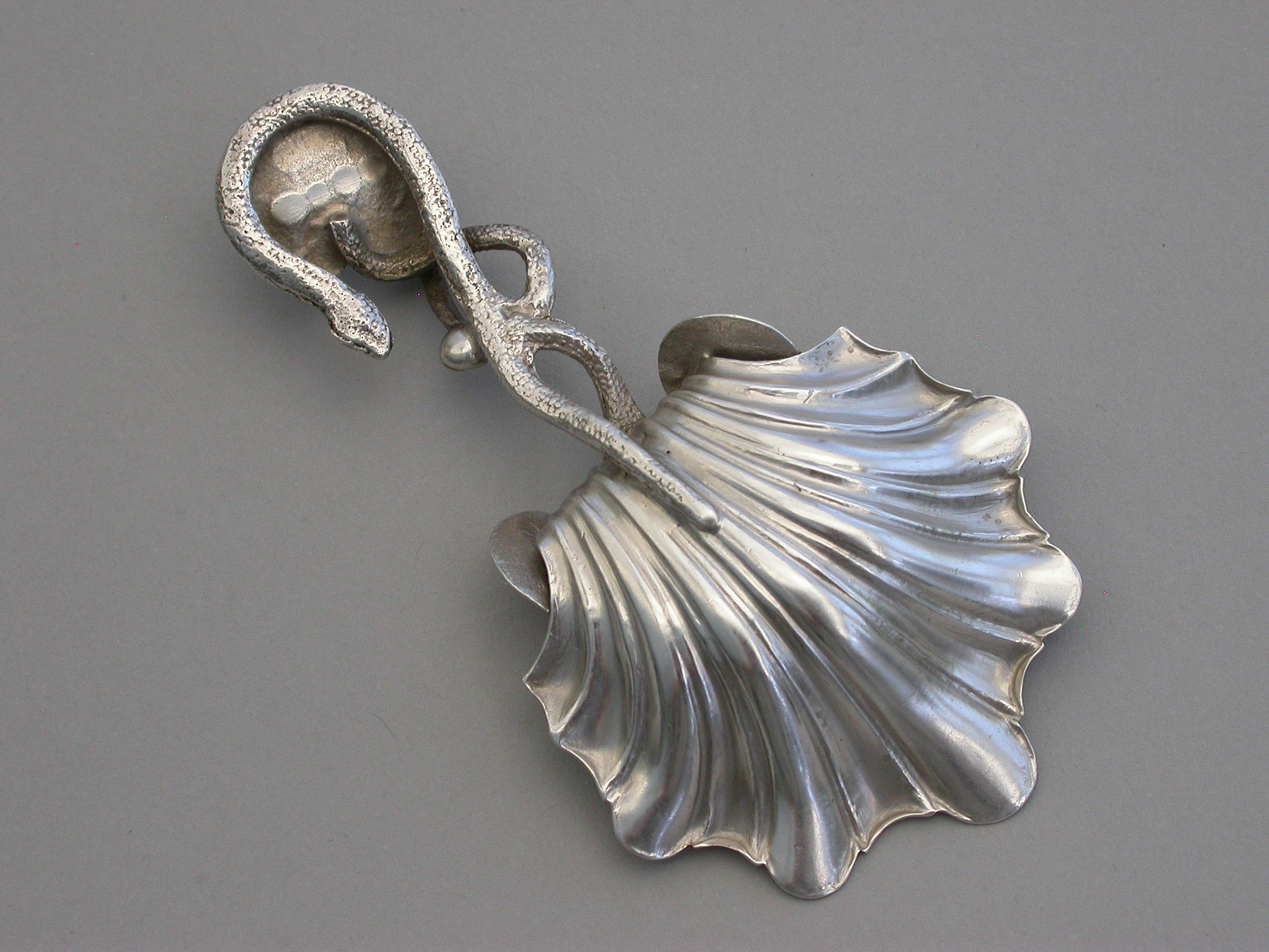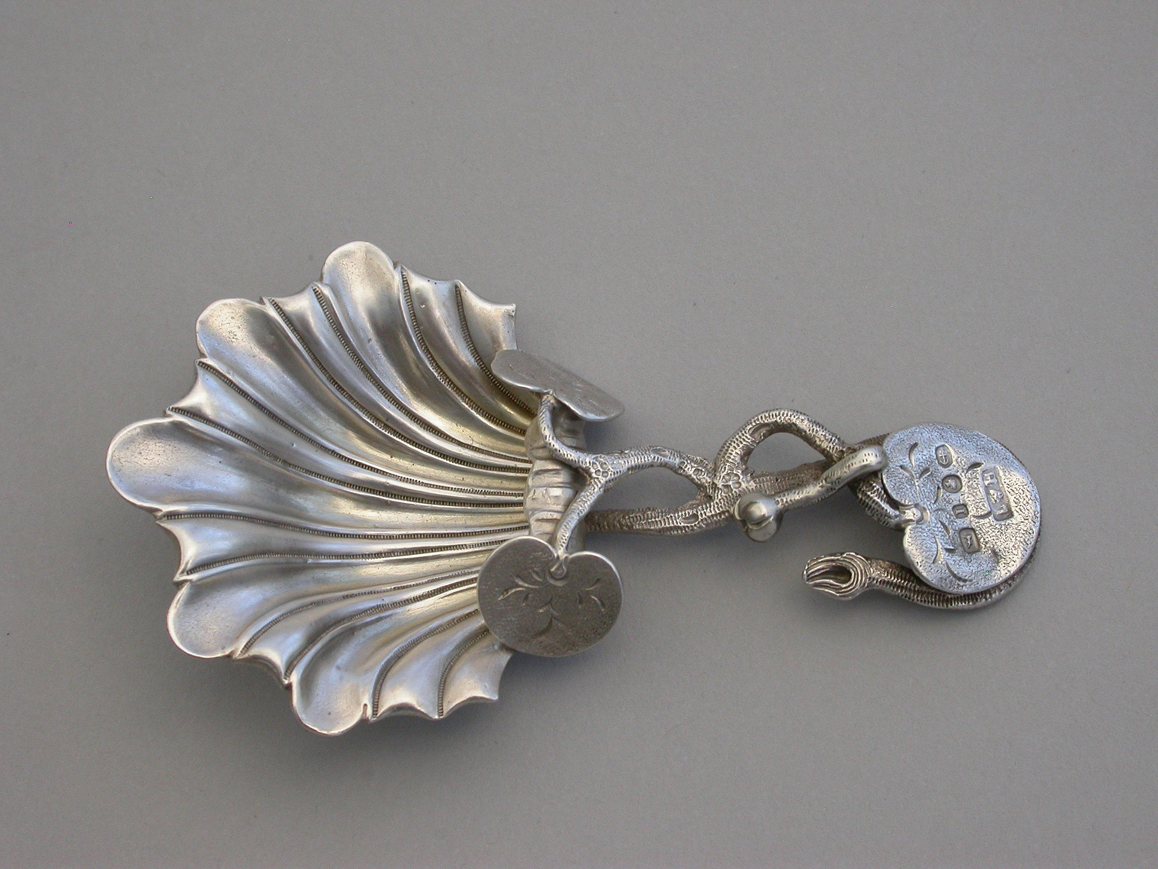 A rare Victorian silver Caddy Spoon with unusual scallop shell shaped bowl and entwinned lily leaf handle.