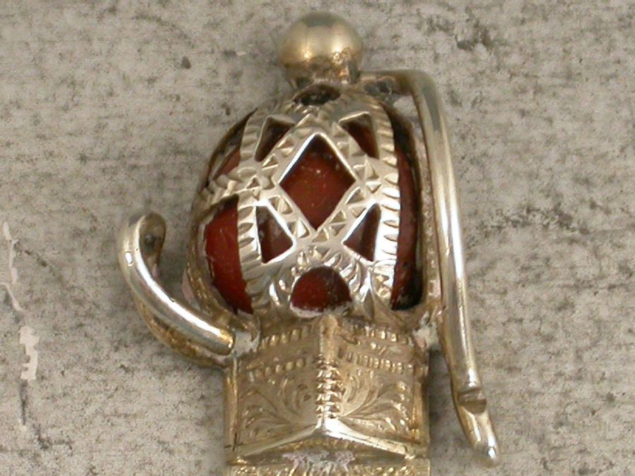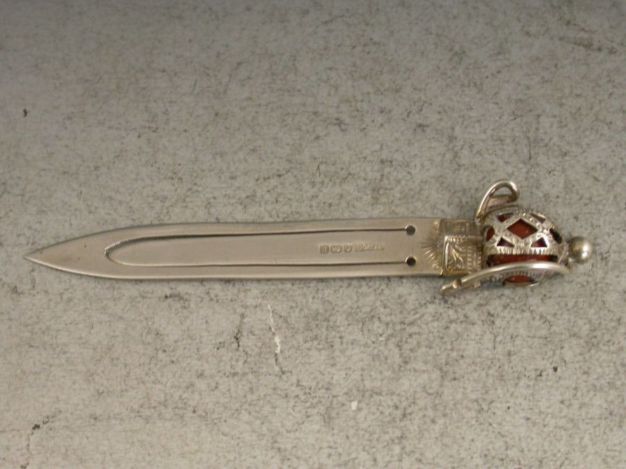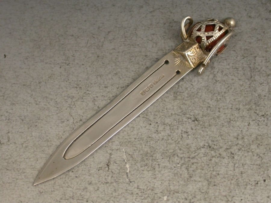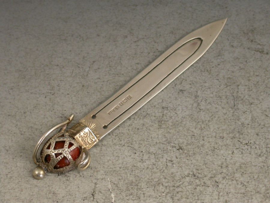 A good Victorian silver Bookmark formed as a Scottish Claymore Broadsword, the basket hilted handle set with an orange coloured agate stone.