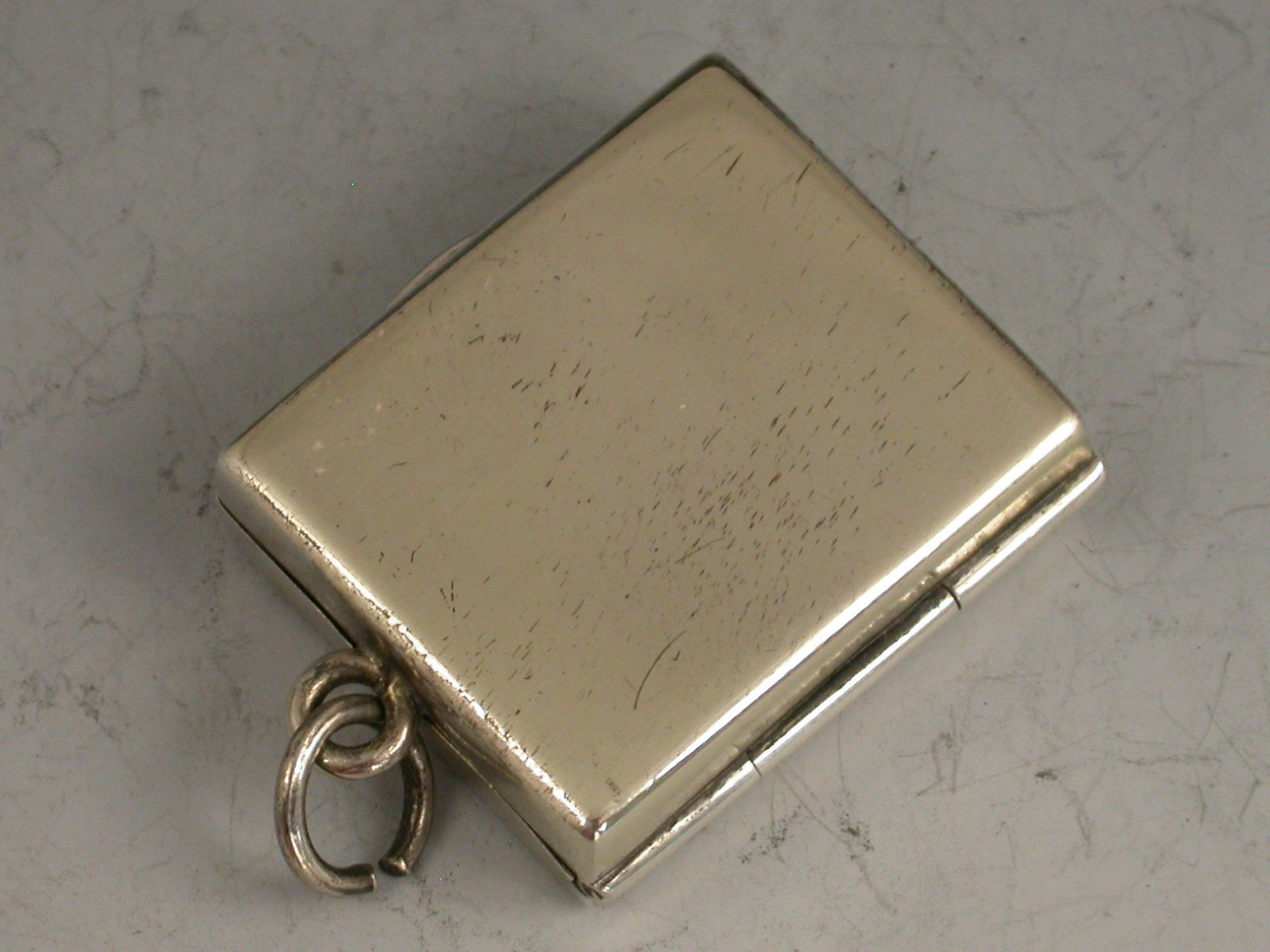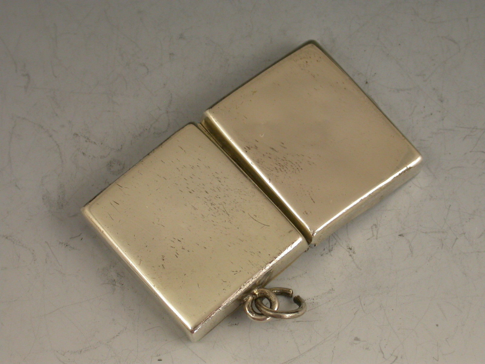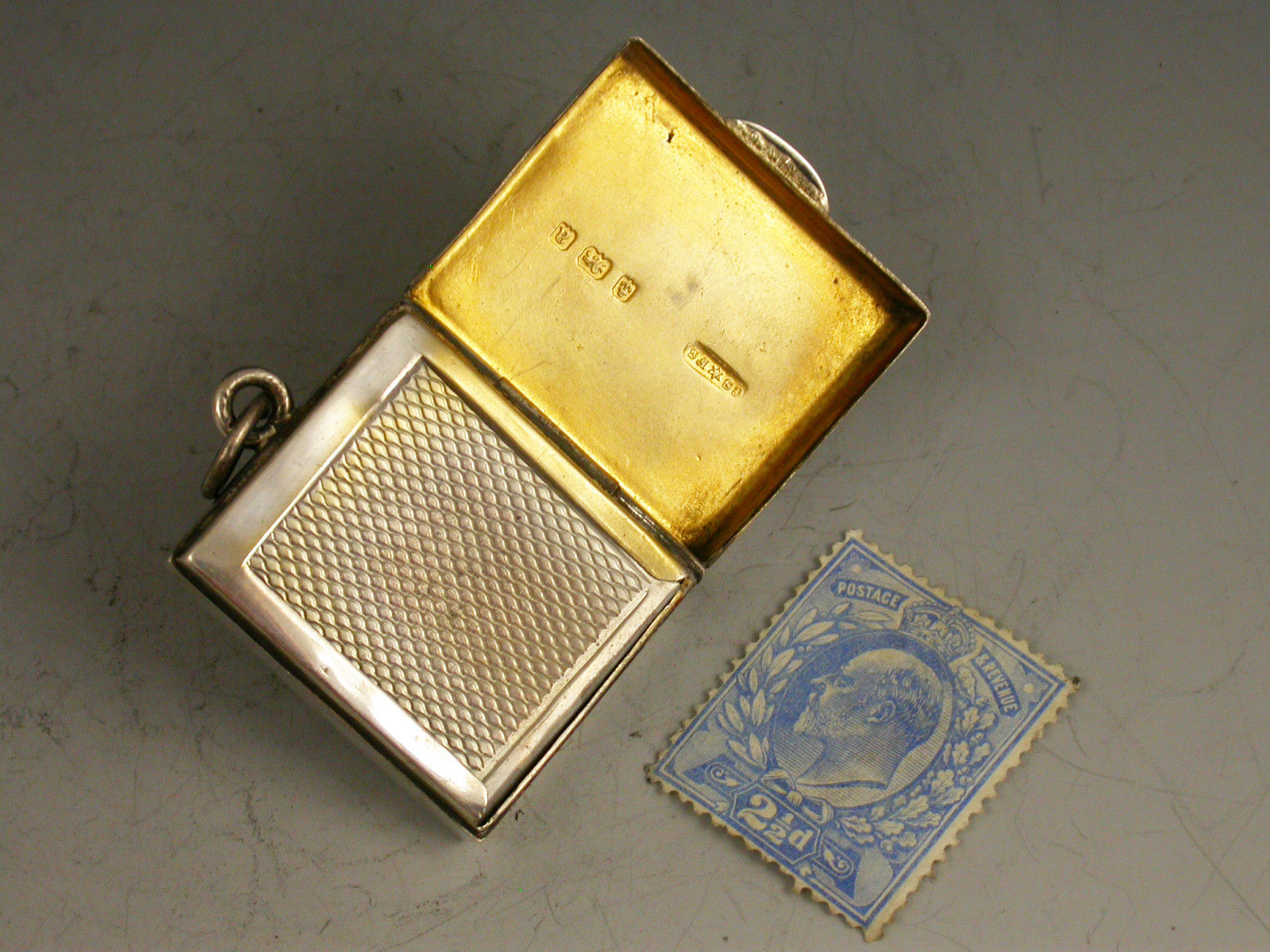 A Victorian silver Stamp Case of hinged rectangular form with attached suspension ring, the silver gilt interior with a sprung compartment to hold and dispense stamps.