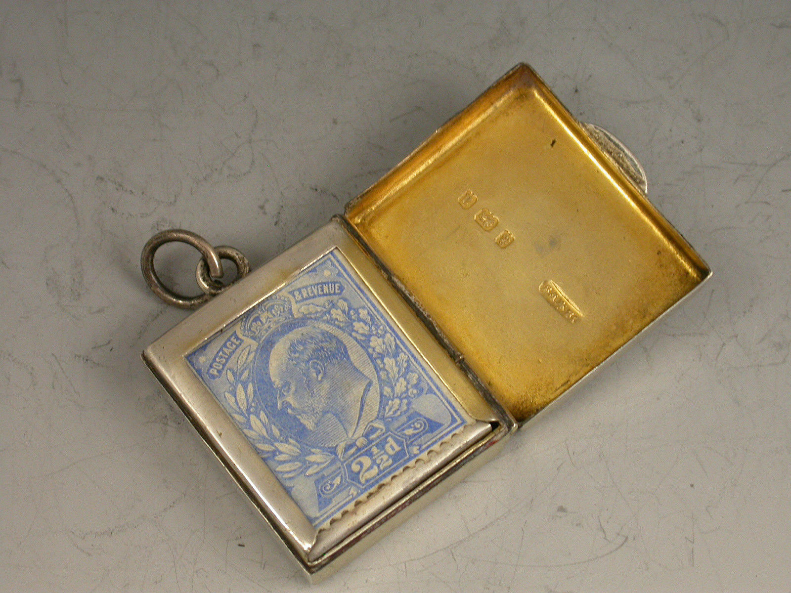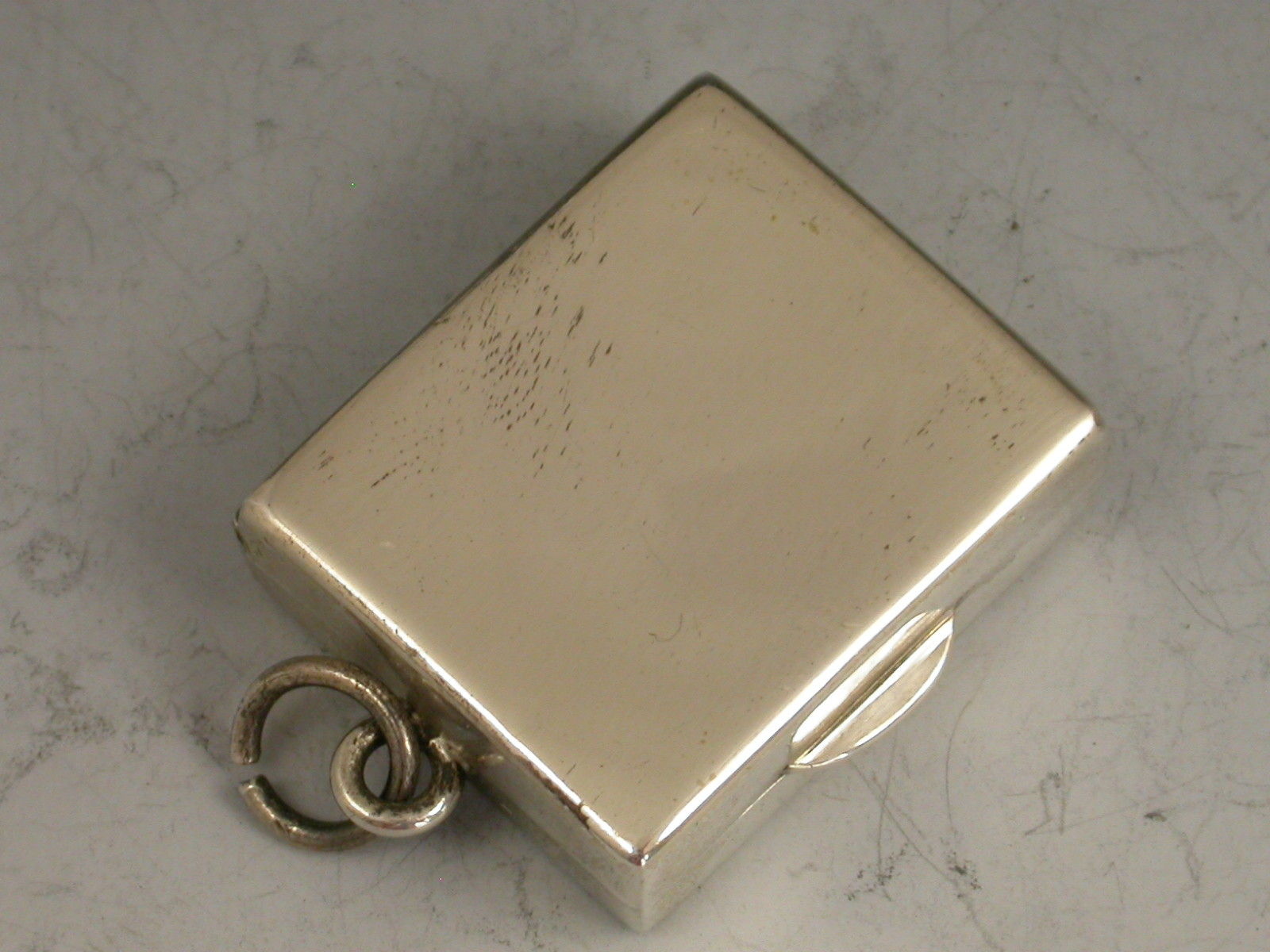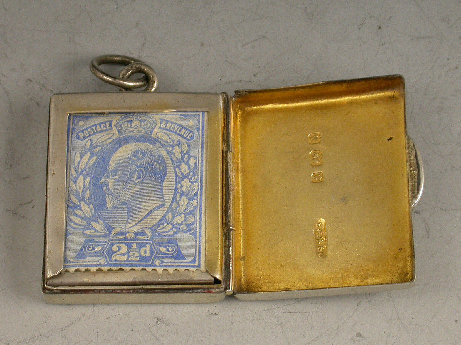 A Victorian silver Stamp Case of hinged rectangular form with attached suspension ring, the silver gilt interior with a sprung compartment to hold and dispense stamps.