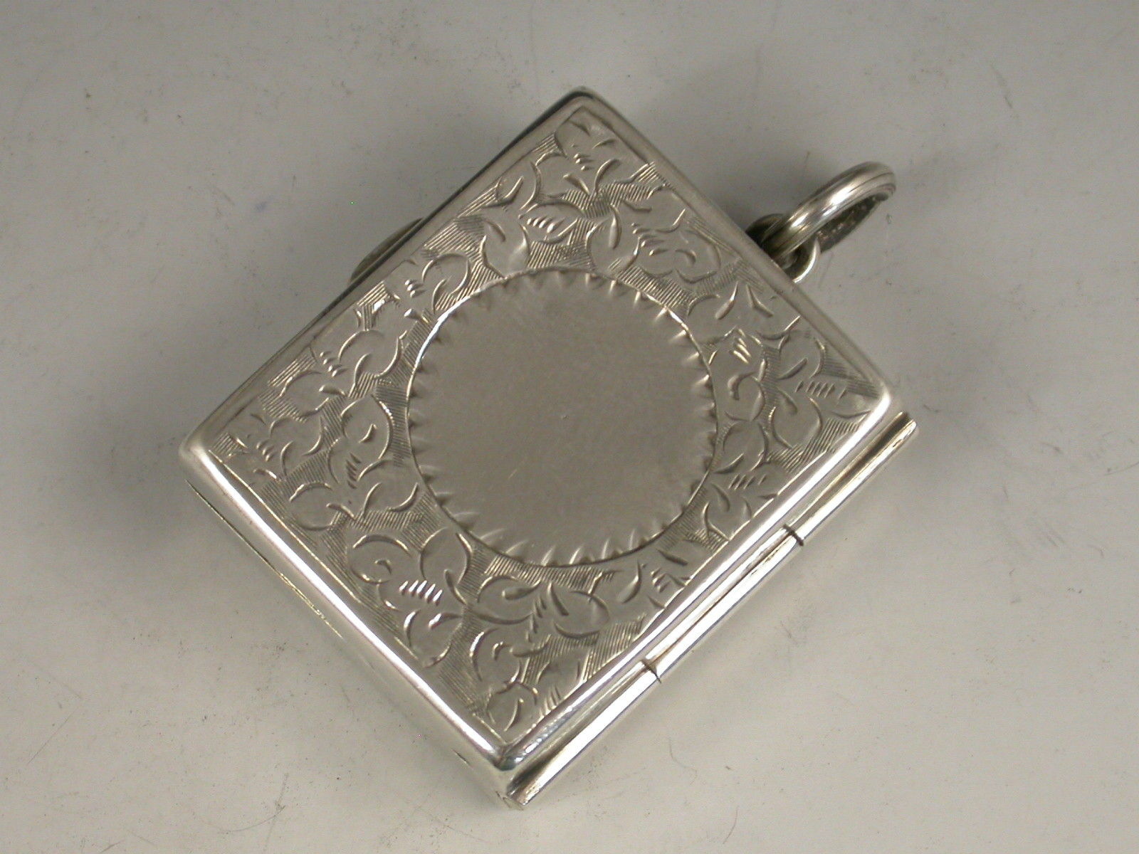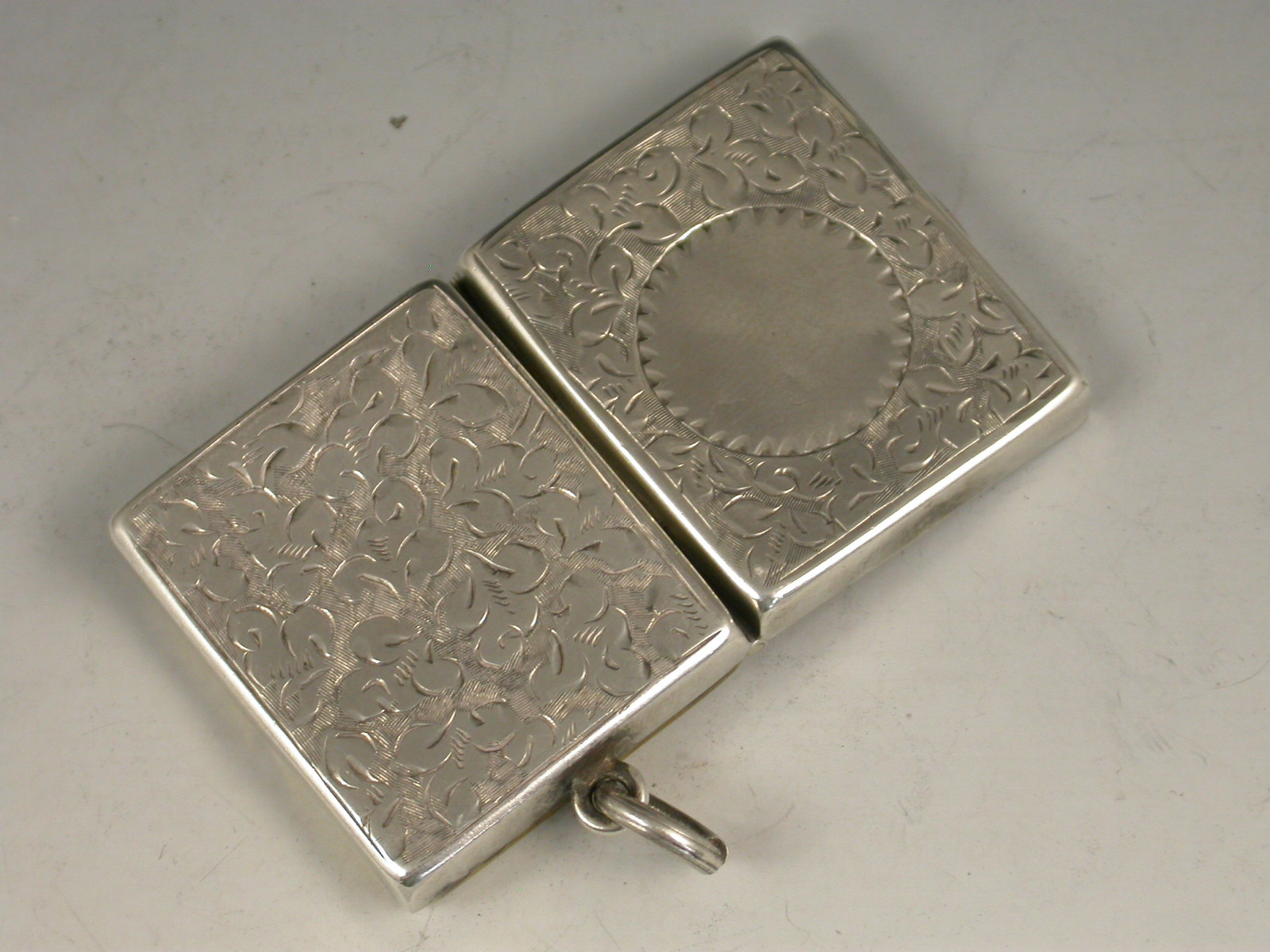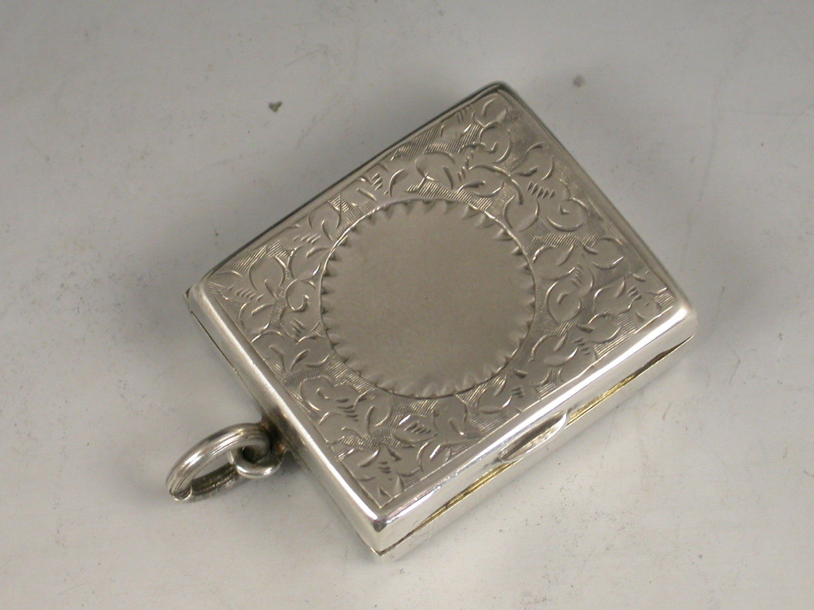 A good Victorian silver Stamp Case of hinged rectangular form with attached suspension ring, the base and cover engraved with ivy leaf decoration surrounding a vacant circular cartouche, the silver gilt interior with a sprung compartment to hold and dispense stamps.