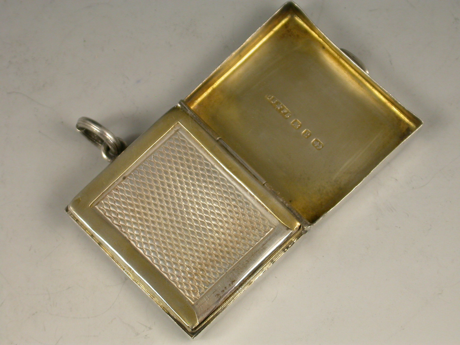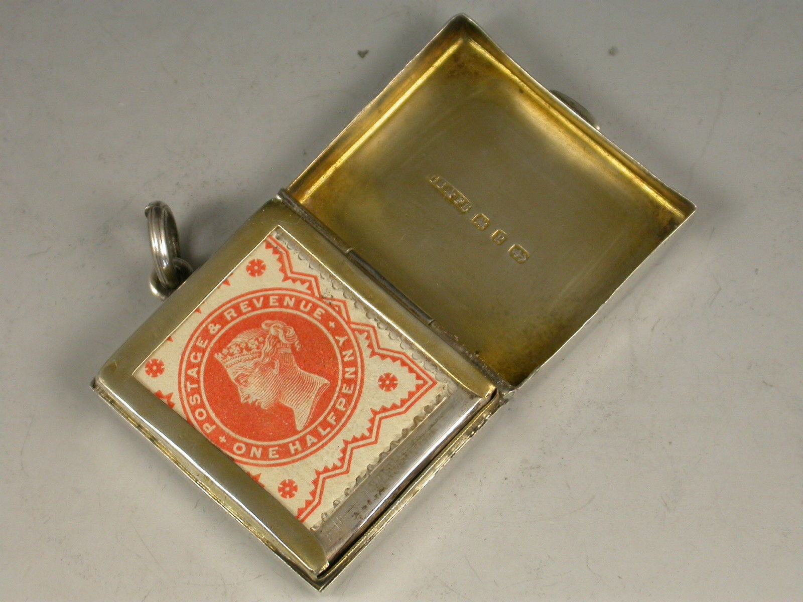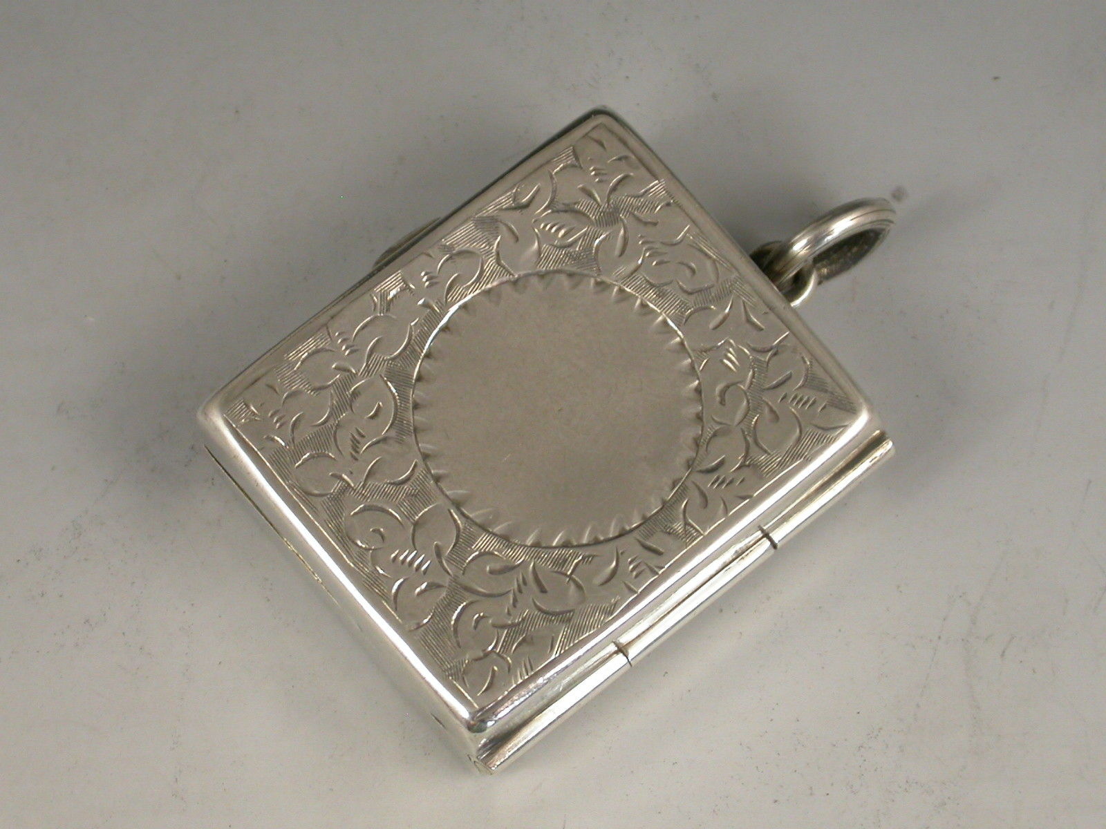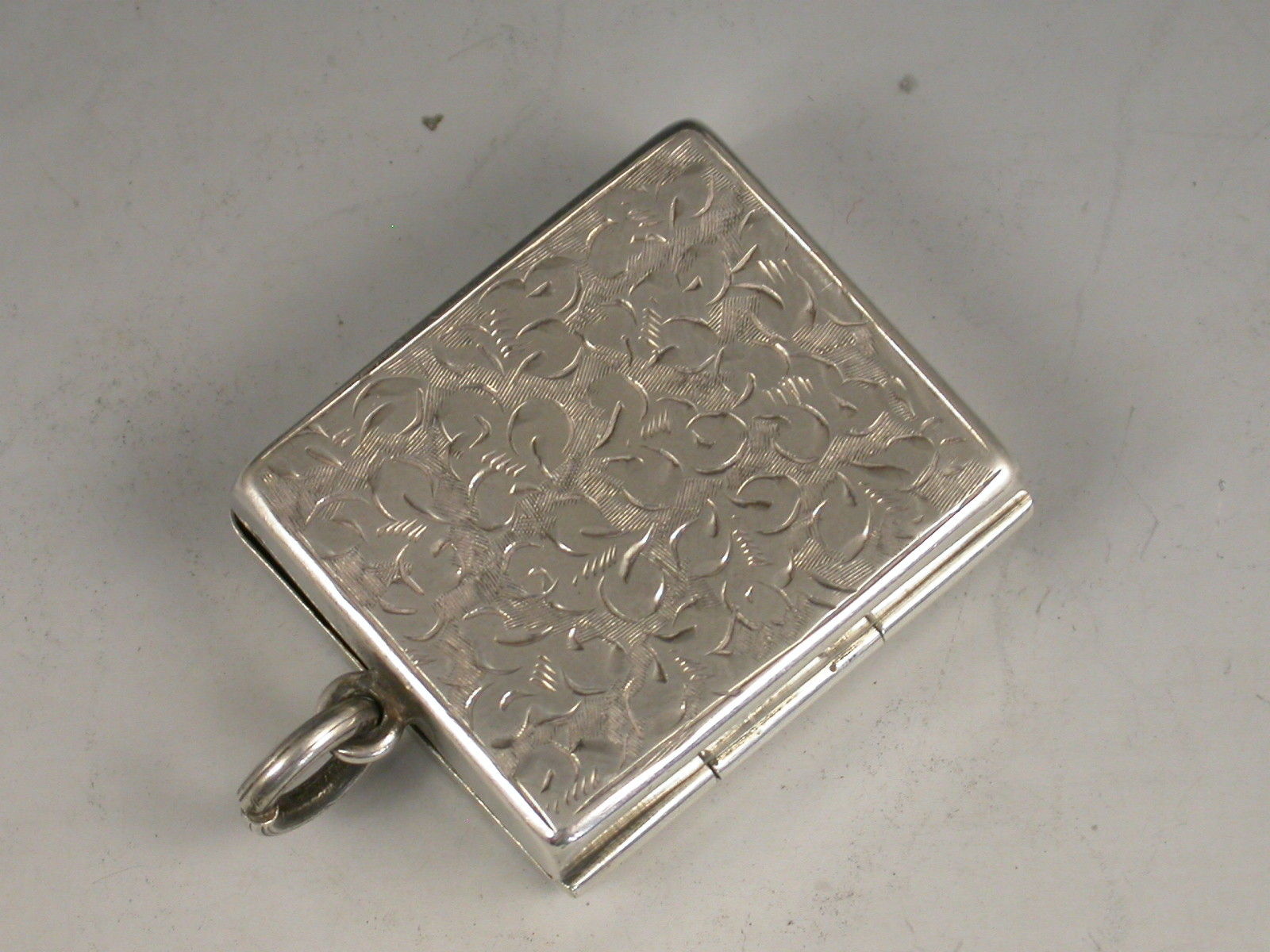 A good Victorian silver Stamp Case of hinged rectangular form with attached suspension ring, the base and cover engraved with ivy leaf decoration surrounding a vacant circular cartouche, the silver gilt interior with a sprung compartment to hold and dispense stamps.