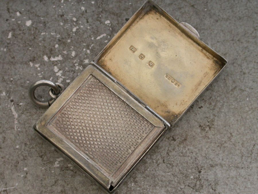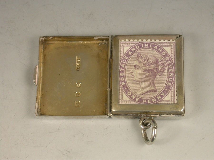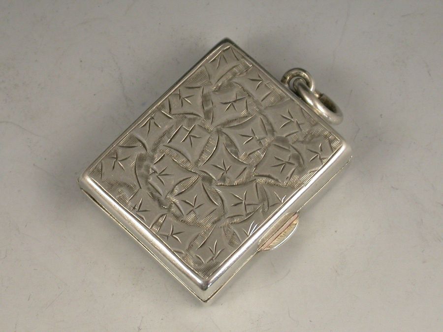 A good Victorian silver Stamp Case of hinged rectangular form with attached suspension ring, the base and cover engraved with ivy leaf decoration surrounding a vacant circular cartouche, the silver gilt interior with a sprung compartment to hold and dispense stamps.