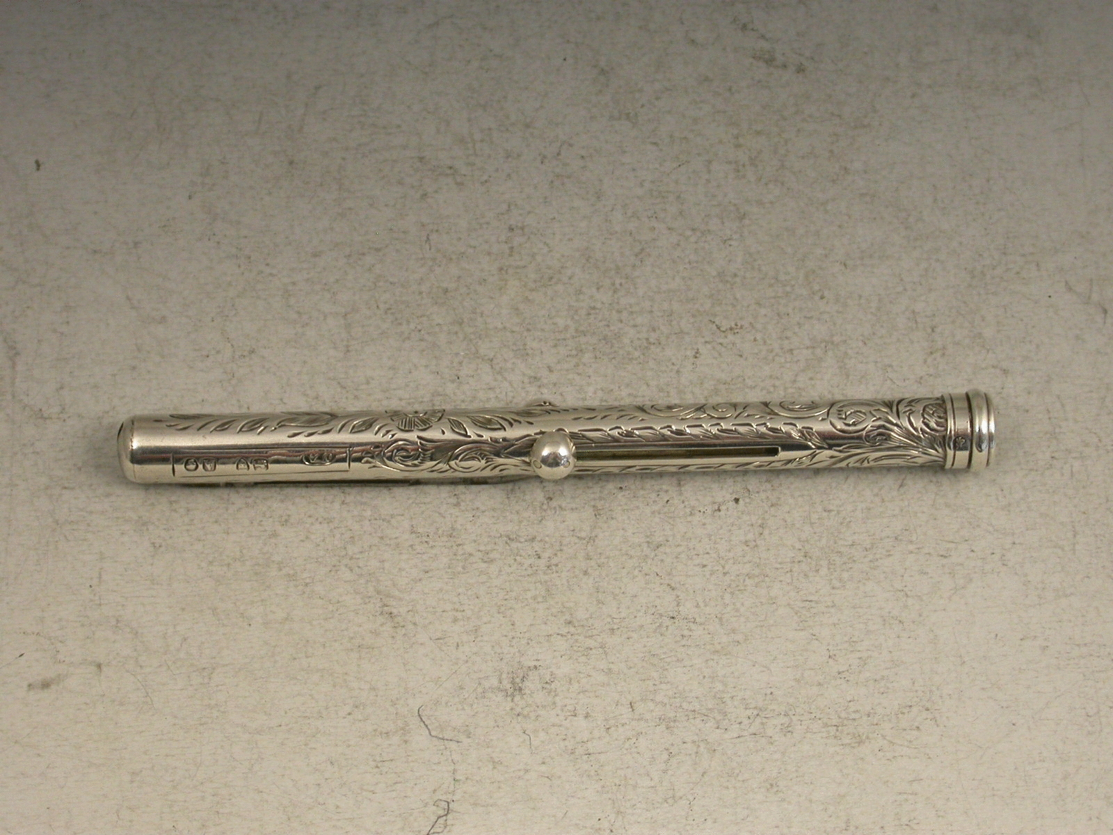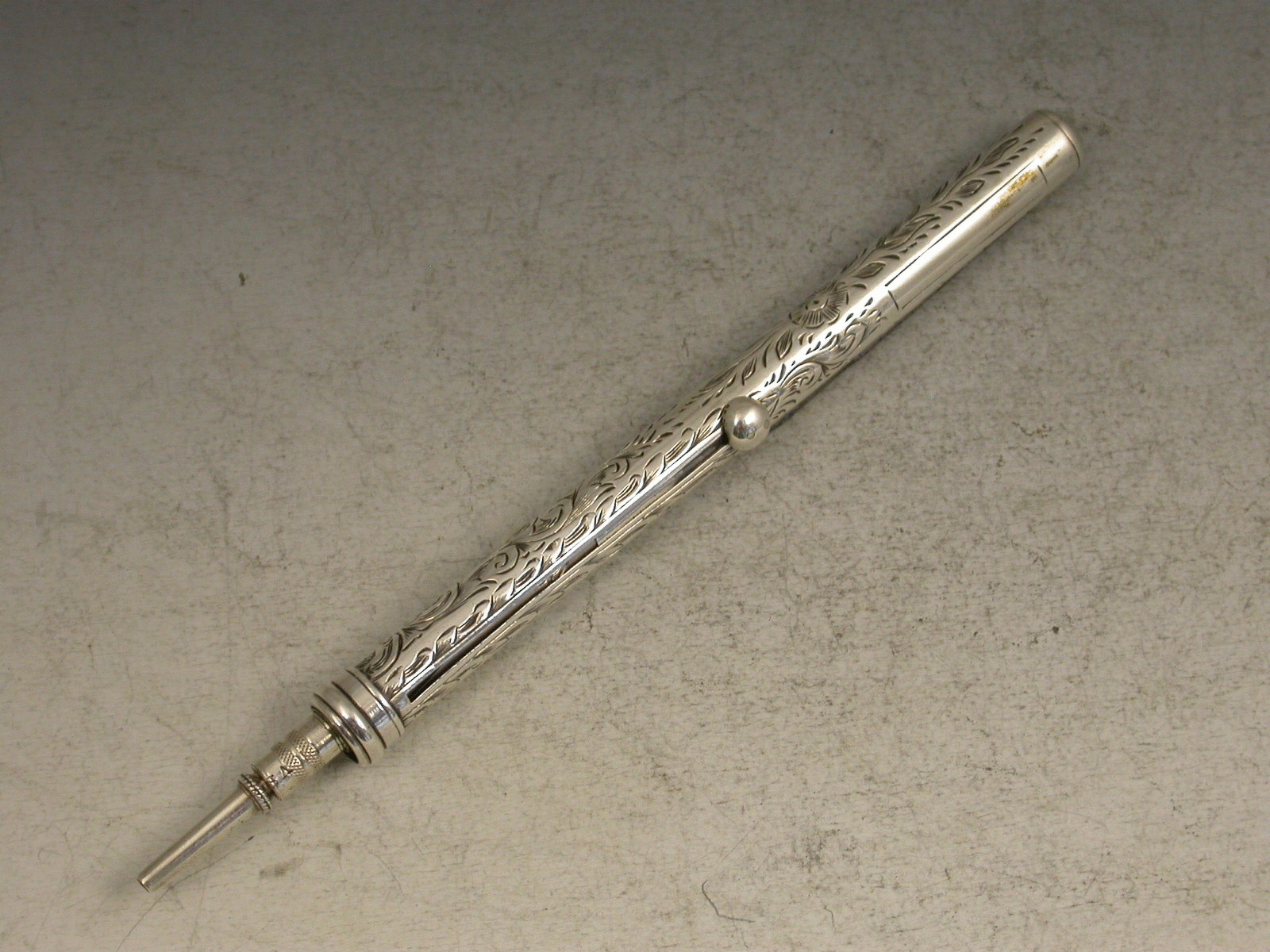 A Victorian silver combination sliding Propelling Pencil / Dip Pen / Pen Knife, within a foliate scroll engraved tubular silver case.