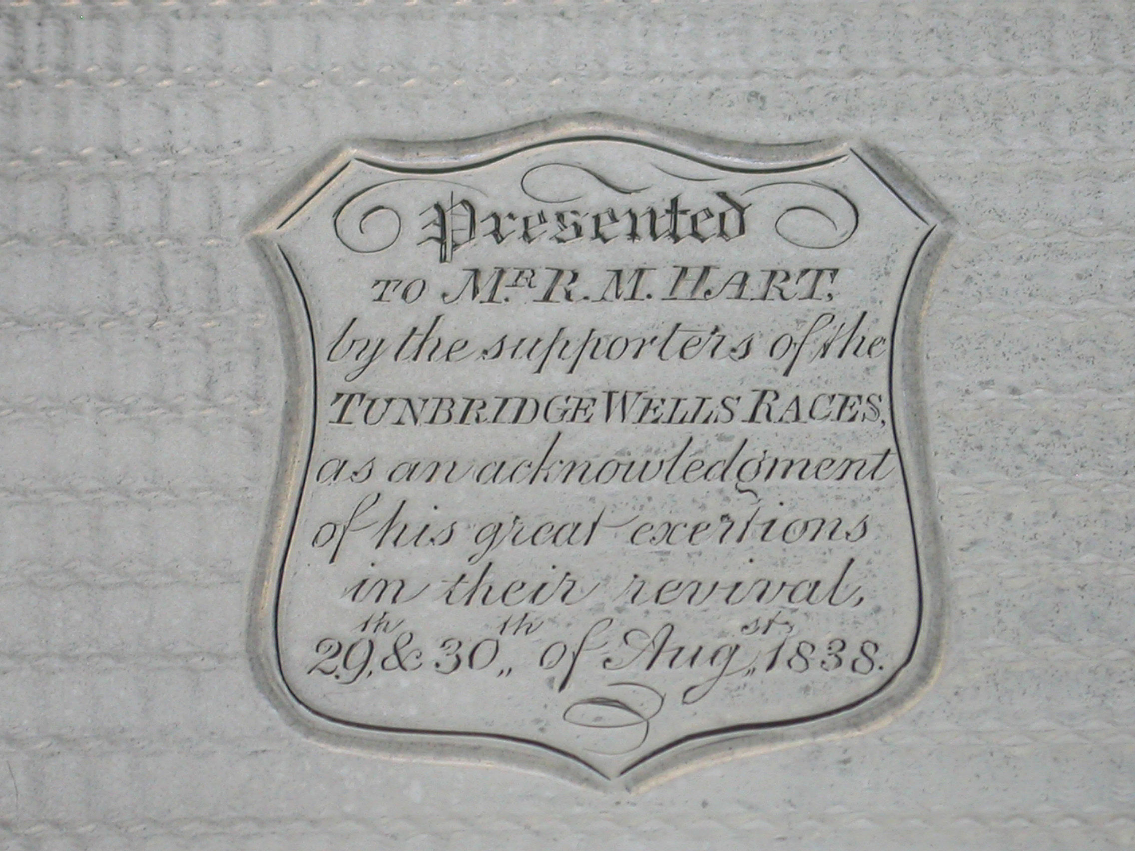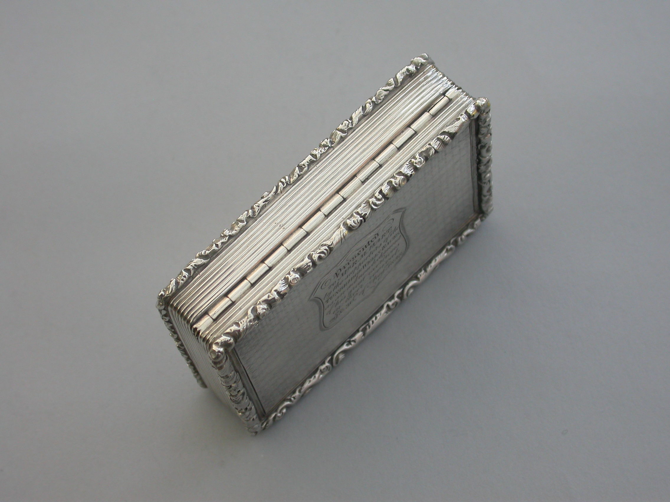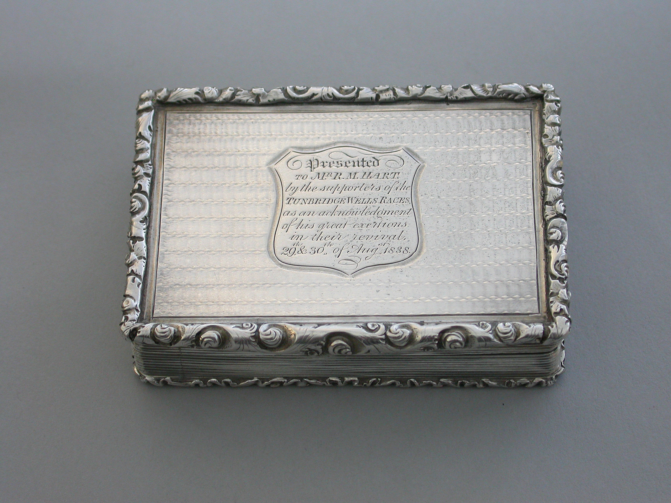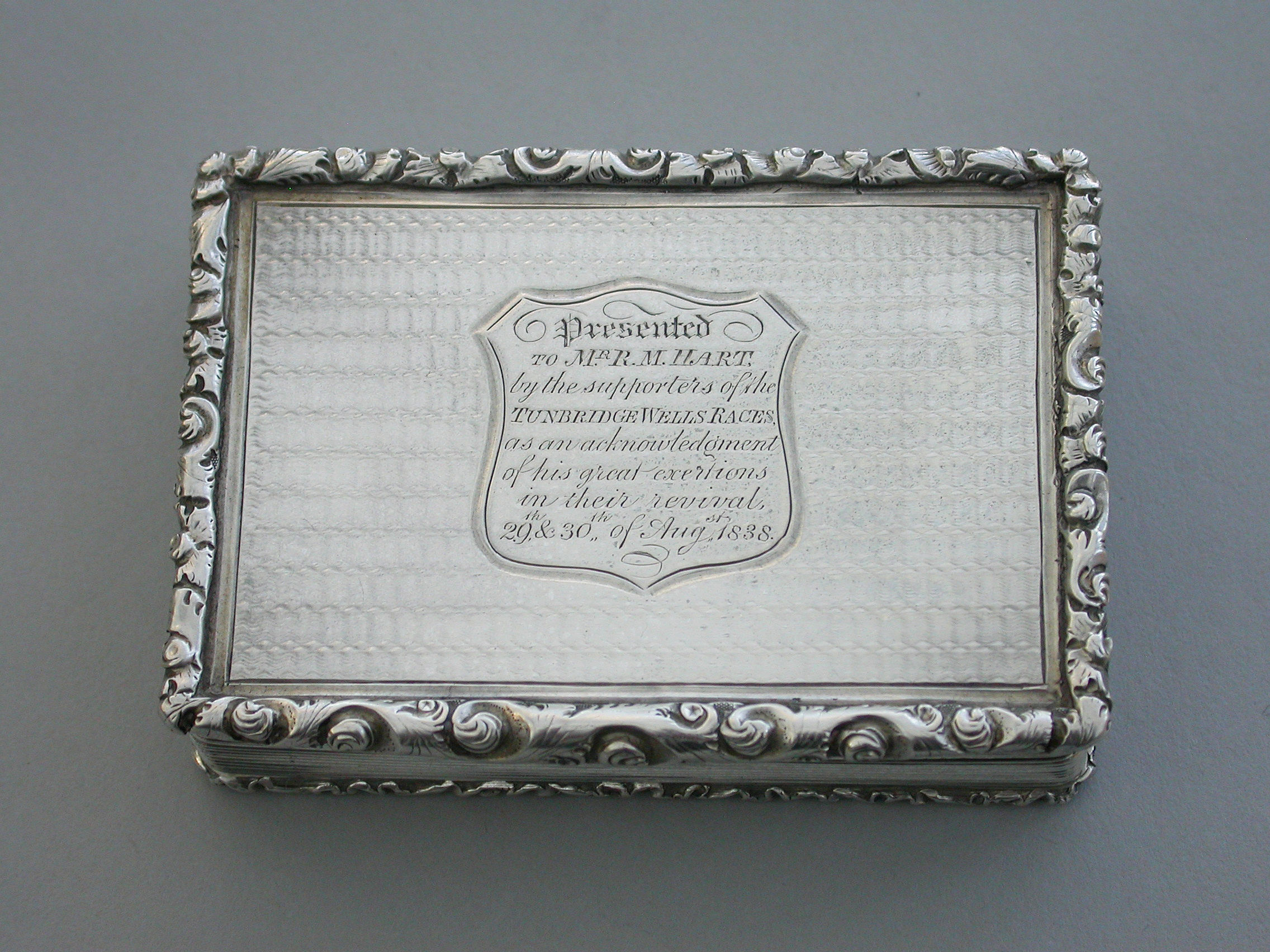 An interesting early Victorian silver Snuff Box of rectangular form with all-over engine turned decoration and raised chased floral borders, the lid with shield shaped cartouche engraved with presentation inscription relating to Tunbridge Wells Horse Races.
