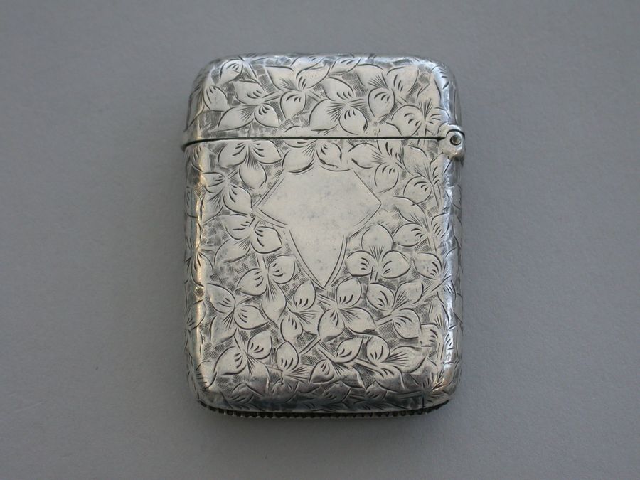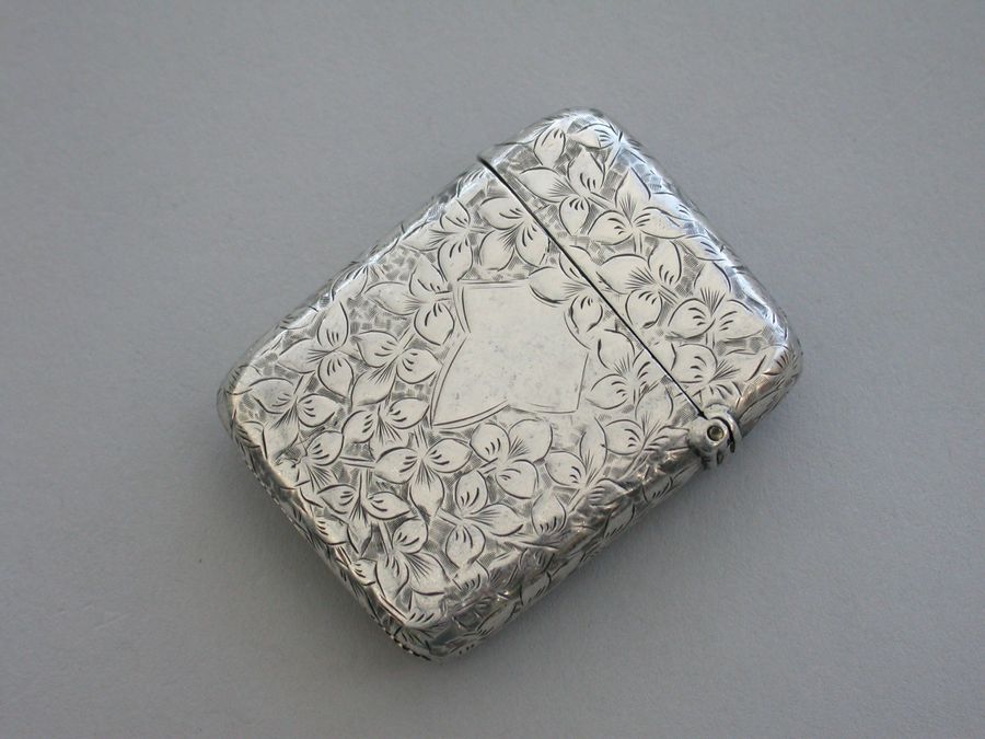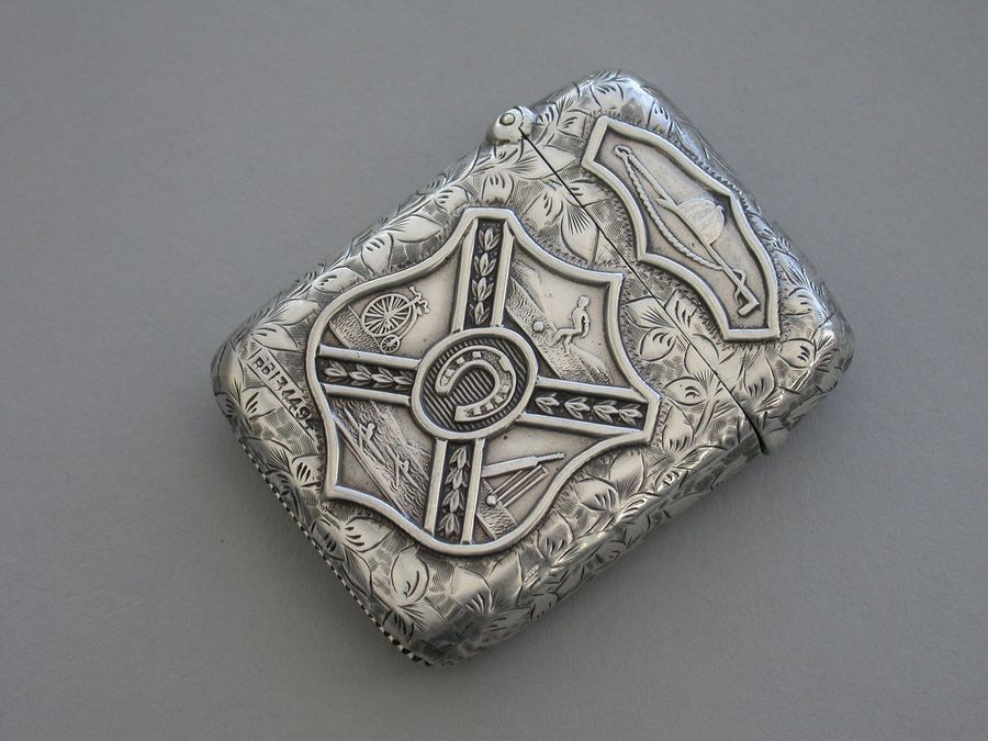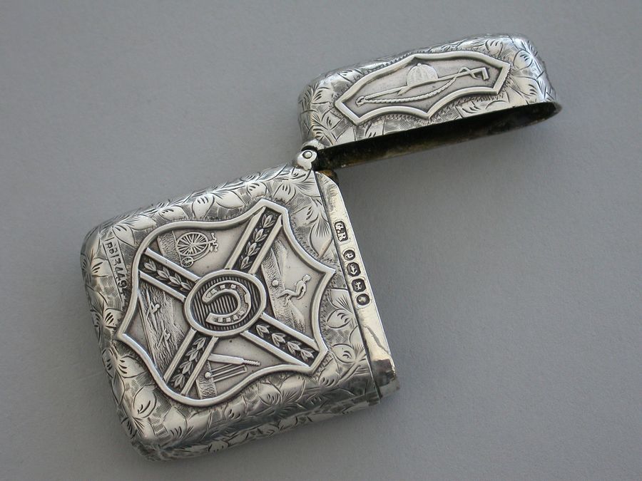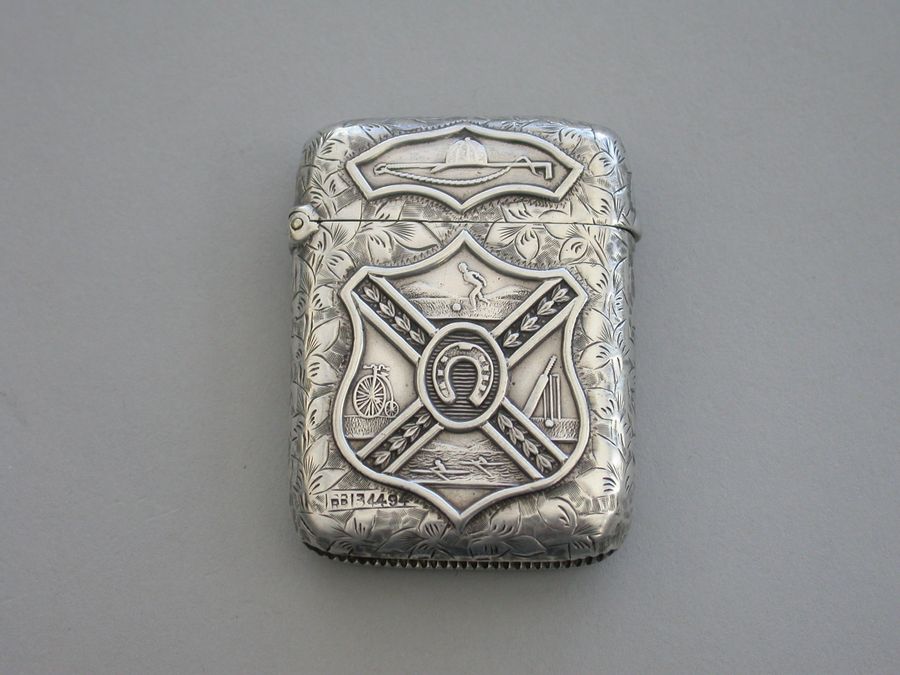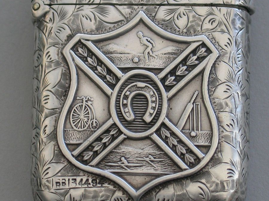 An unusual Victorian silver Vesta Case of rounded rectangular form with foliate engraved decoration, an applied vignette and shield to the front depicting various sporting activities including riding, football, cycling, cricket and rowing.