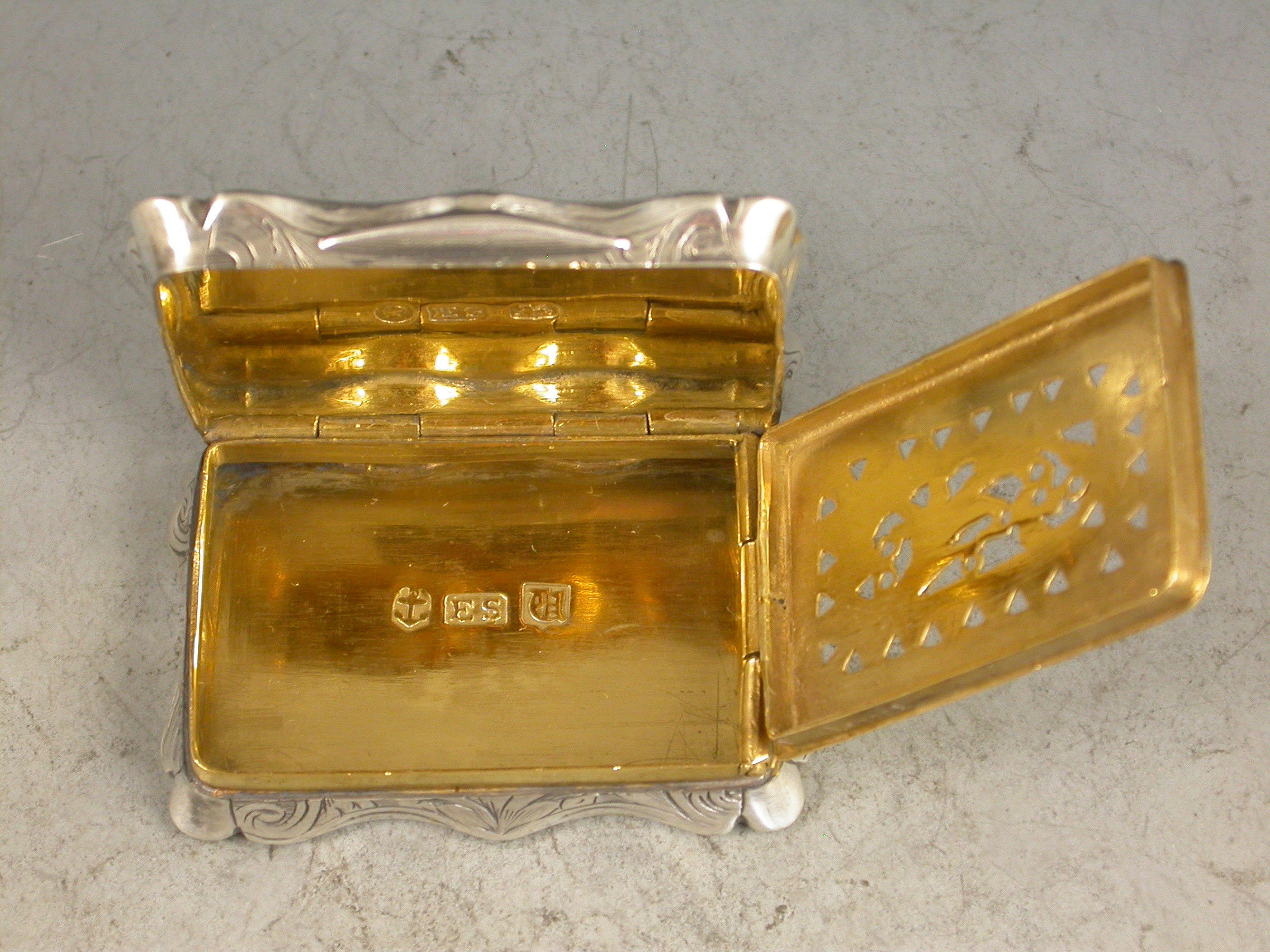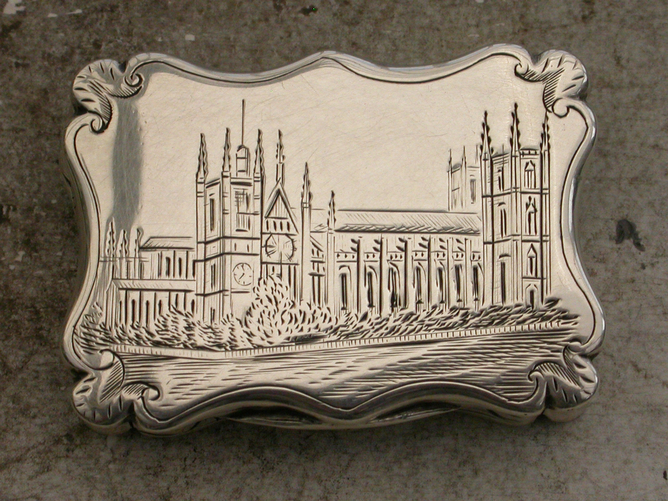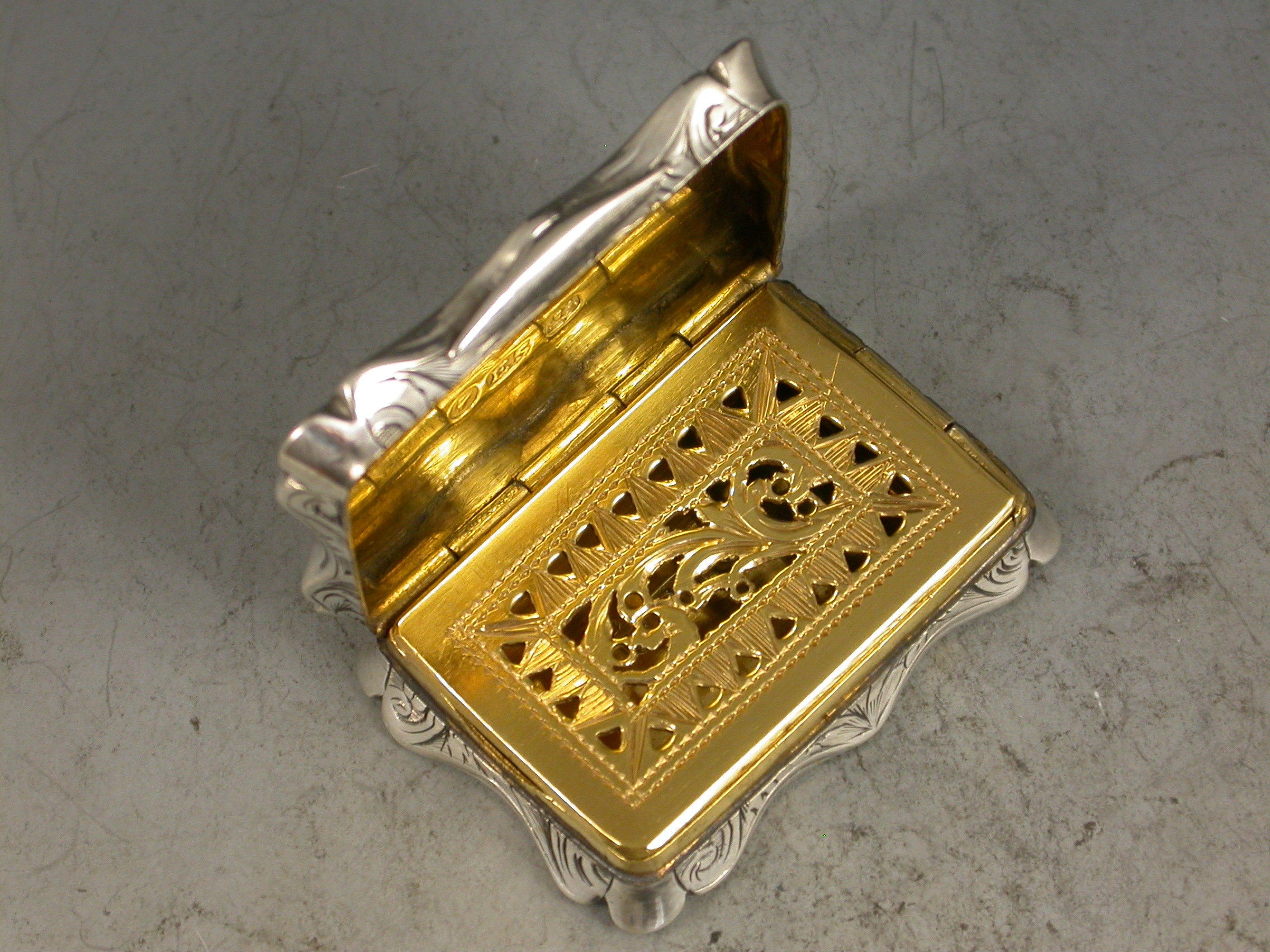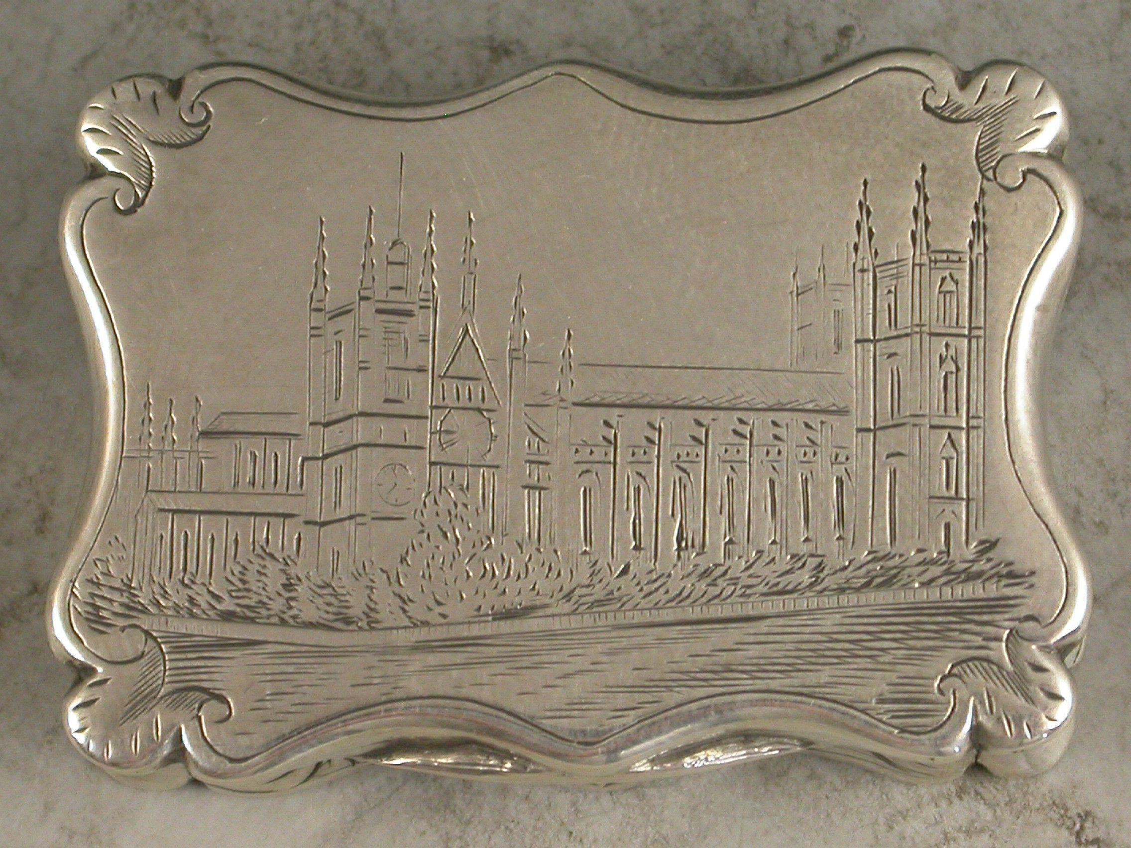 An extremely rare Victorian silver Vinaigrette with foliate scroll decoration to the base and sides, the lid engraved with a rare view of St Margaret's Church, Westminster Abbey. The silver gilt interior with foliate scroll pierced grille.