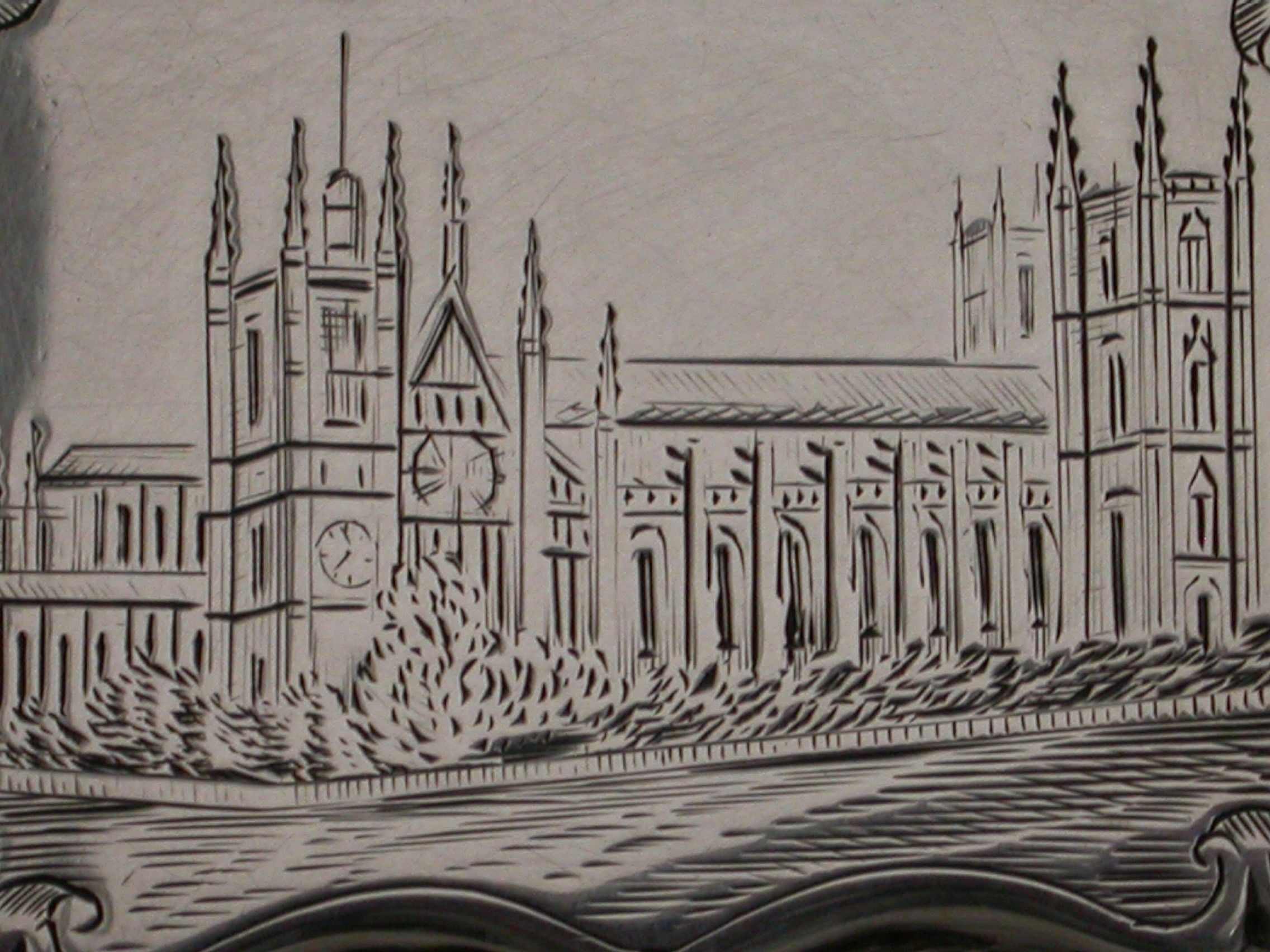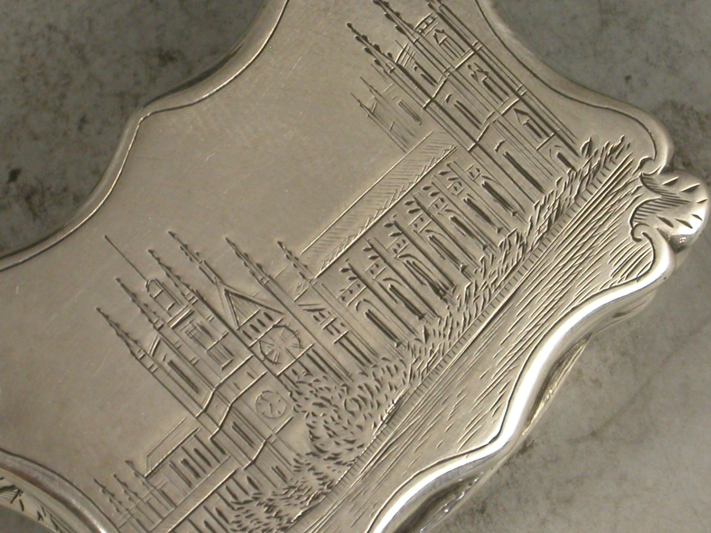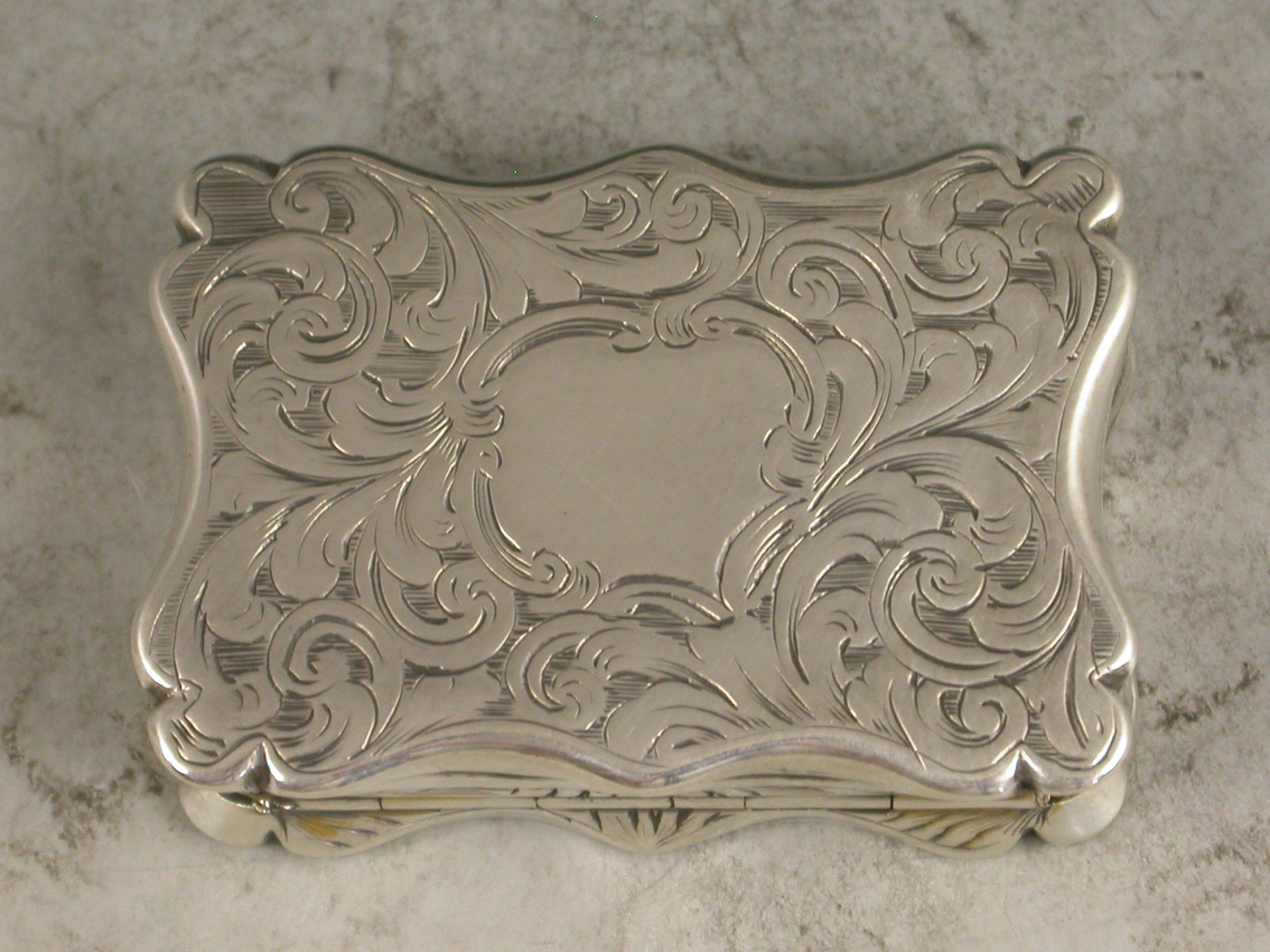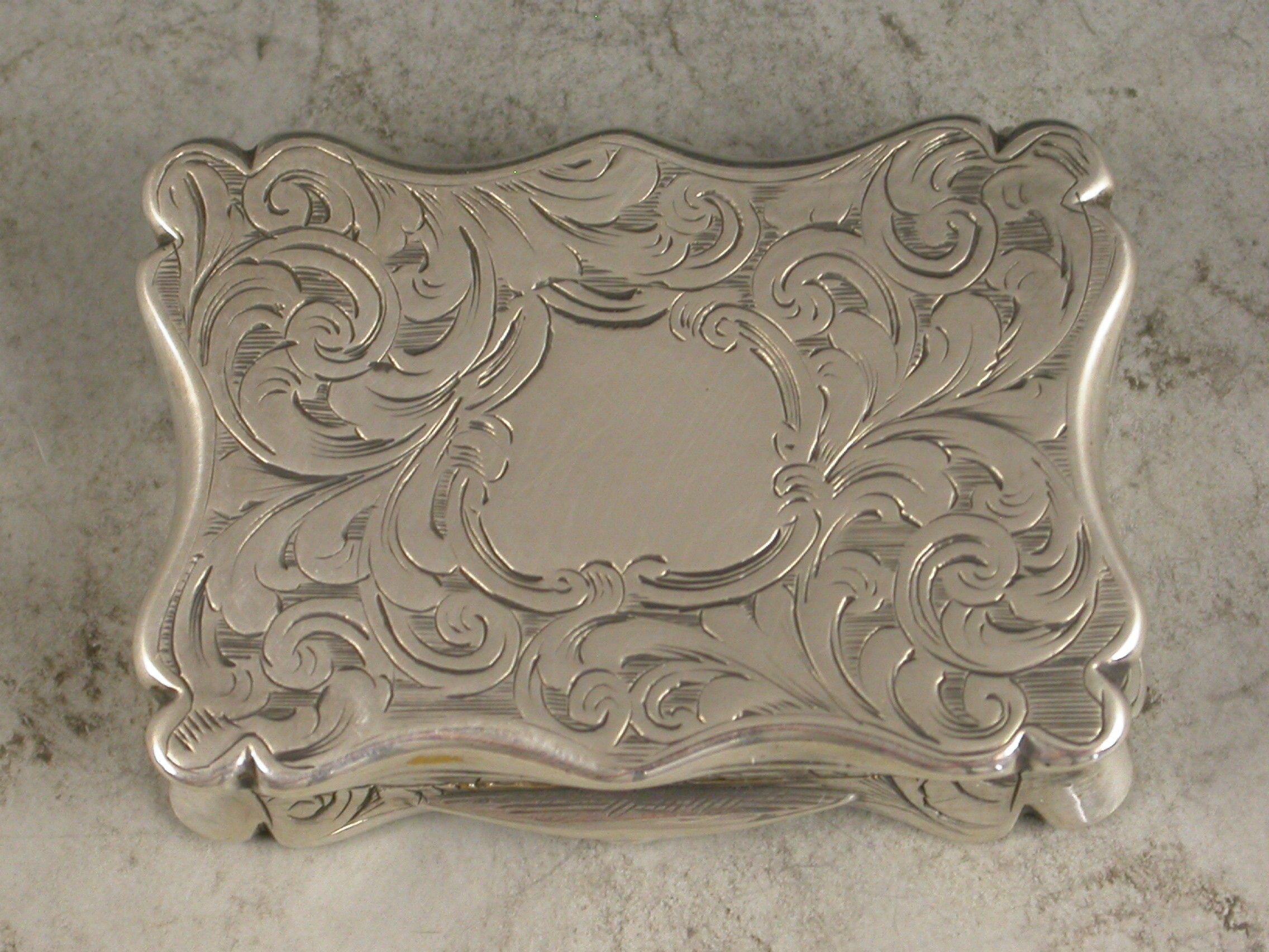 An extremely rare Victorian silver Vinaigrette with foliate scroll decoration to the base and sides, the lid engraved with a rare view of St Margaret's Church, Westminster Abbey. The silver gilt interior with foliate scroll pierced grille.