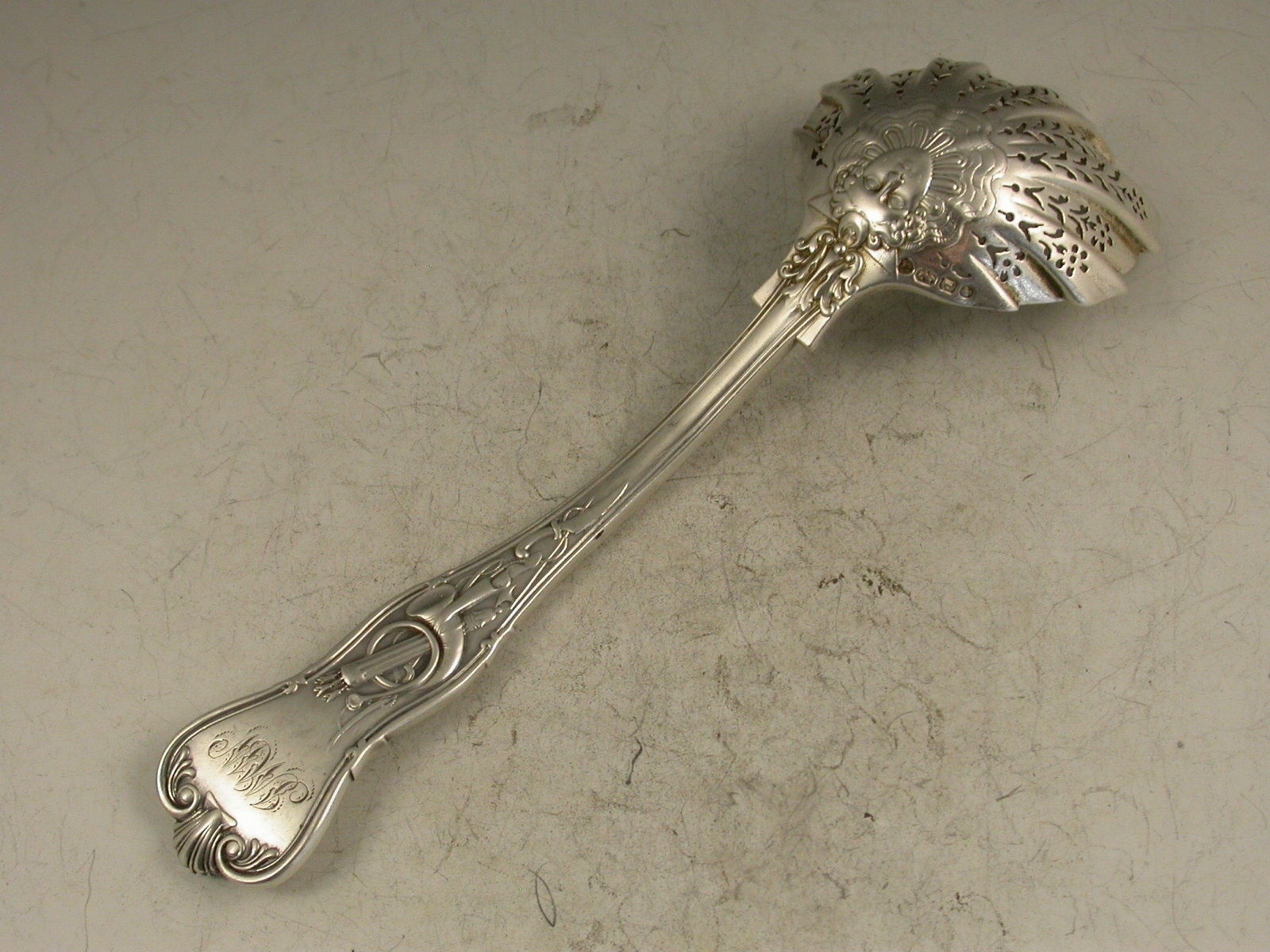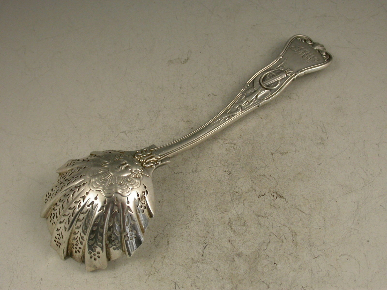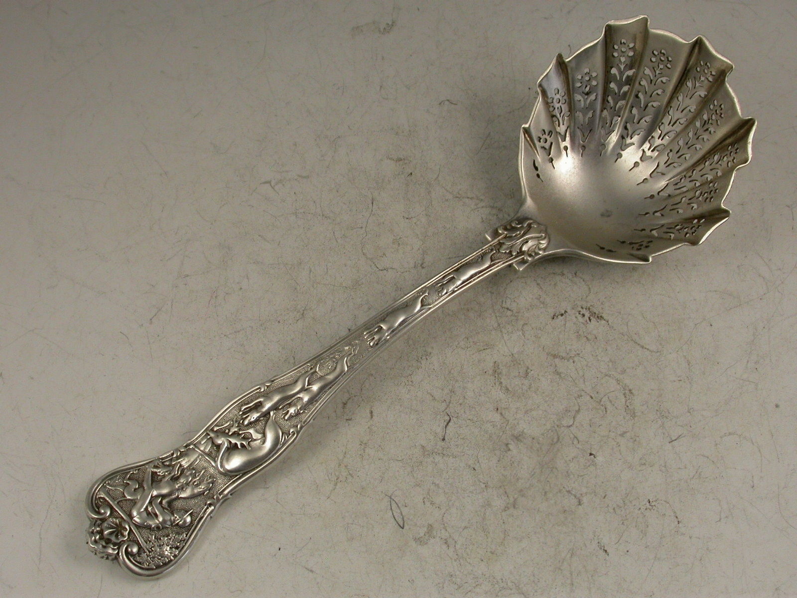 A good Victorian cast silver Sugar Sifter Ladle in the 'Stag Hunt' pattern, with finely pierced fluted bowl.