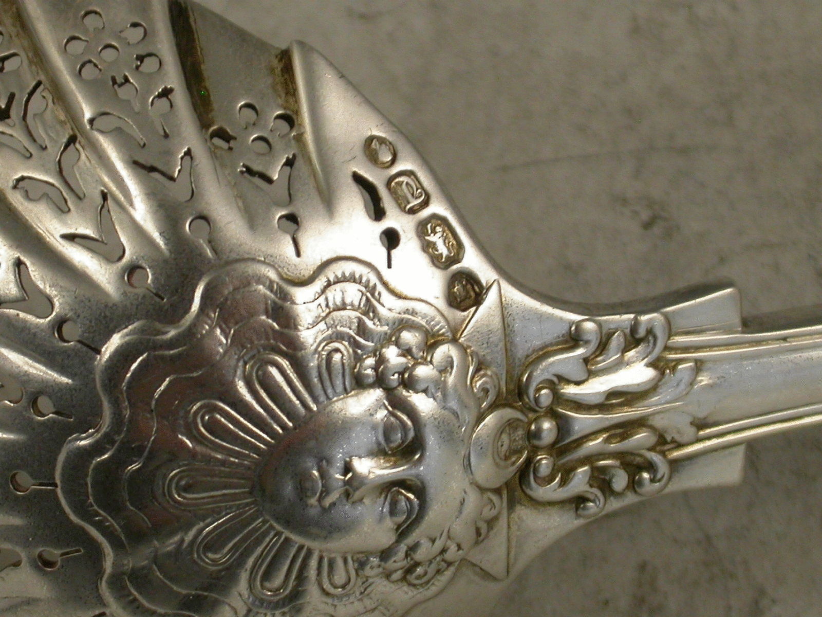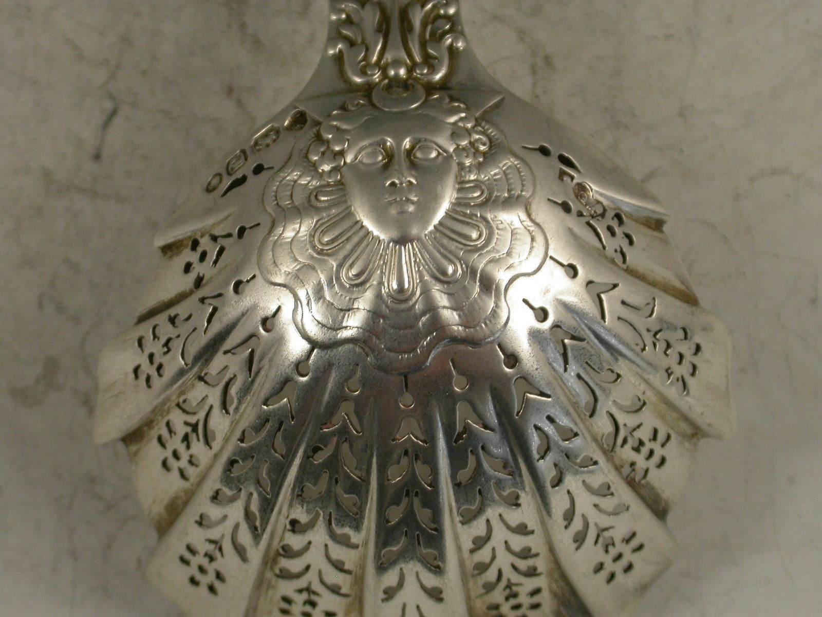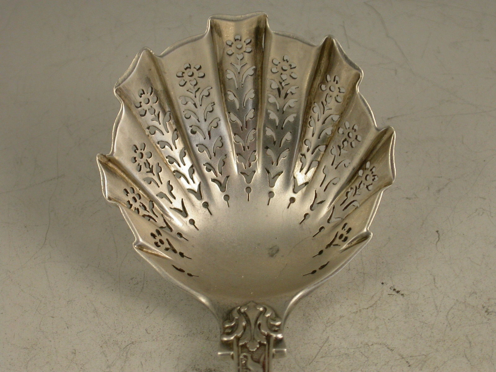 A good Victorian cast silver Sugar Sifter Ladle in the 'Stag Hunt' pattern, with finely pierced fluted bowl.