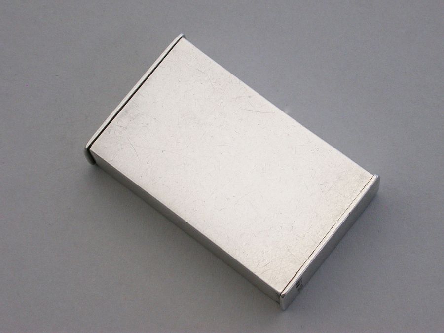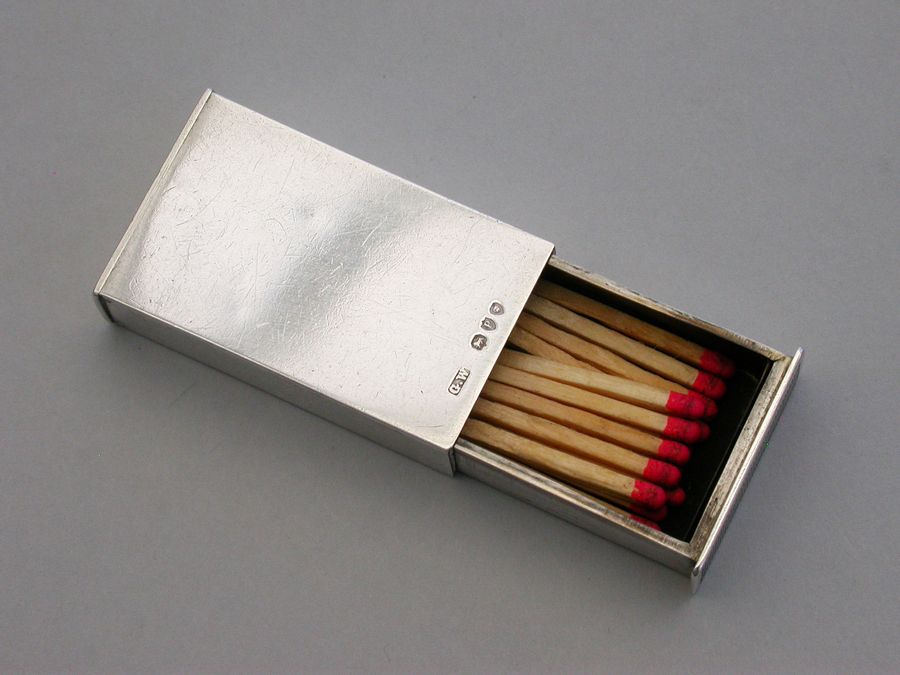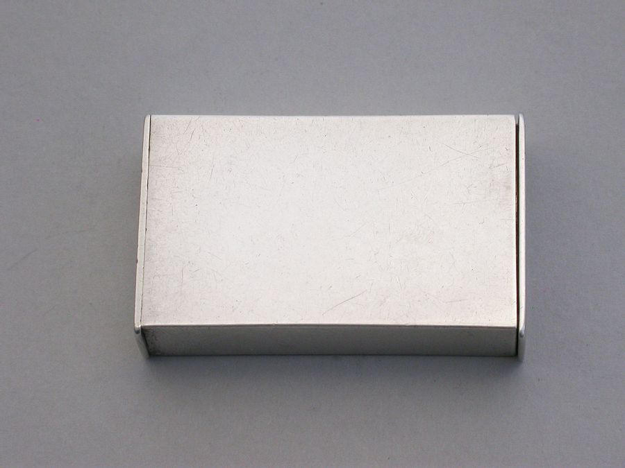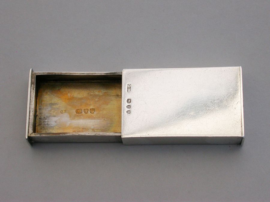 A fine quality Victorian silver Trick Opening Vesta Case of plain rectangular form with striker plate to one end and two separate internal compartments. On initial inspection the gilded interior contains nothing when opened, the ingenious hidden interior compartment containing the matches can only be released when the sprung slide to one end is held down.