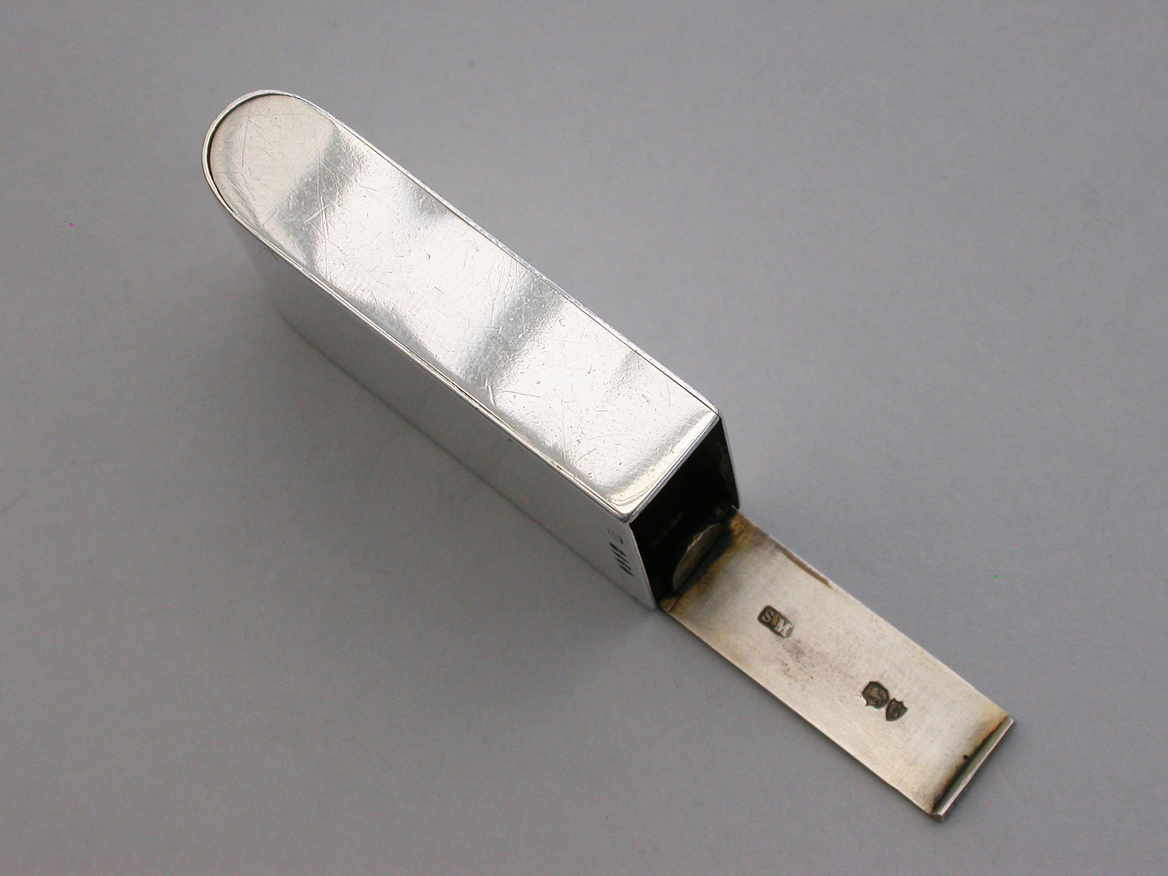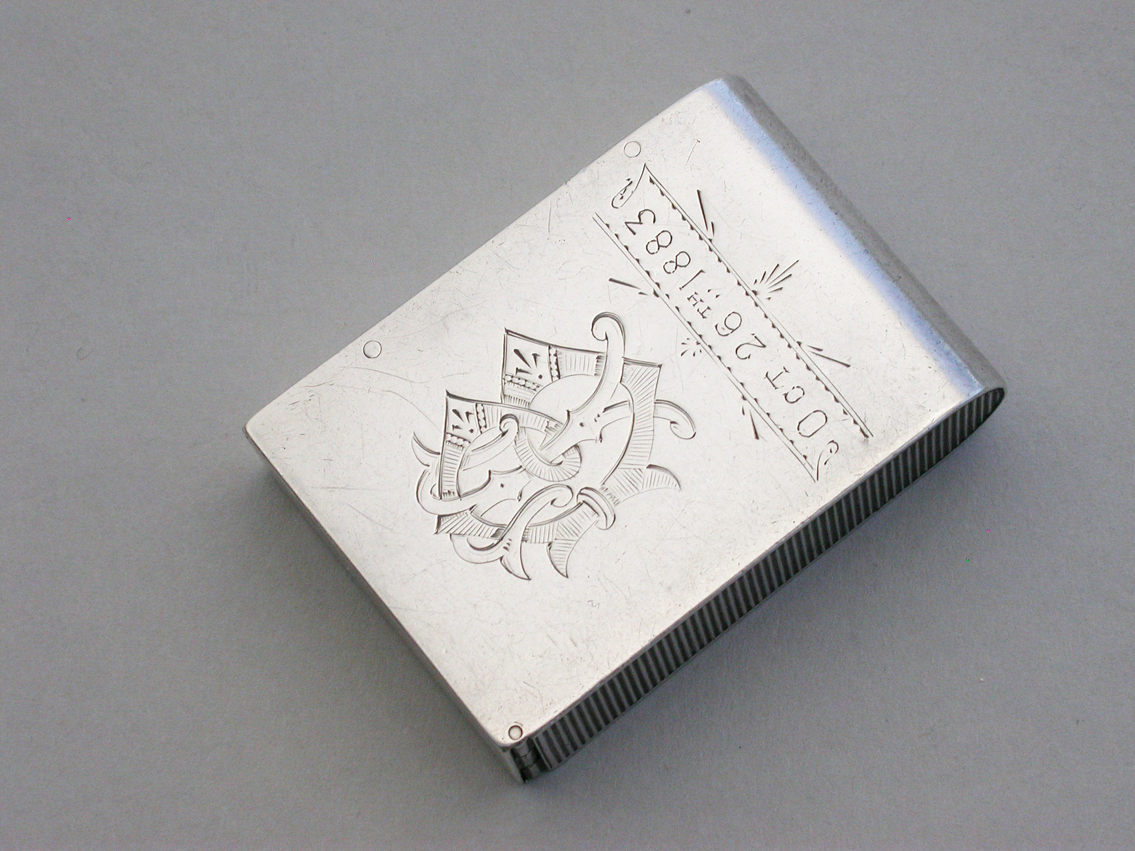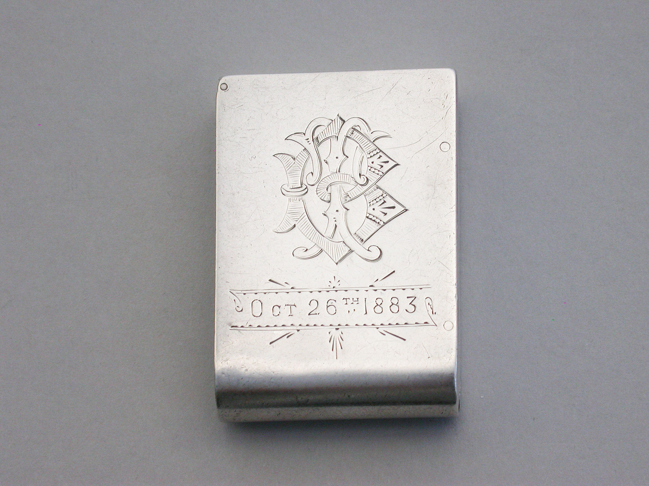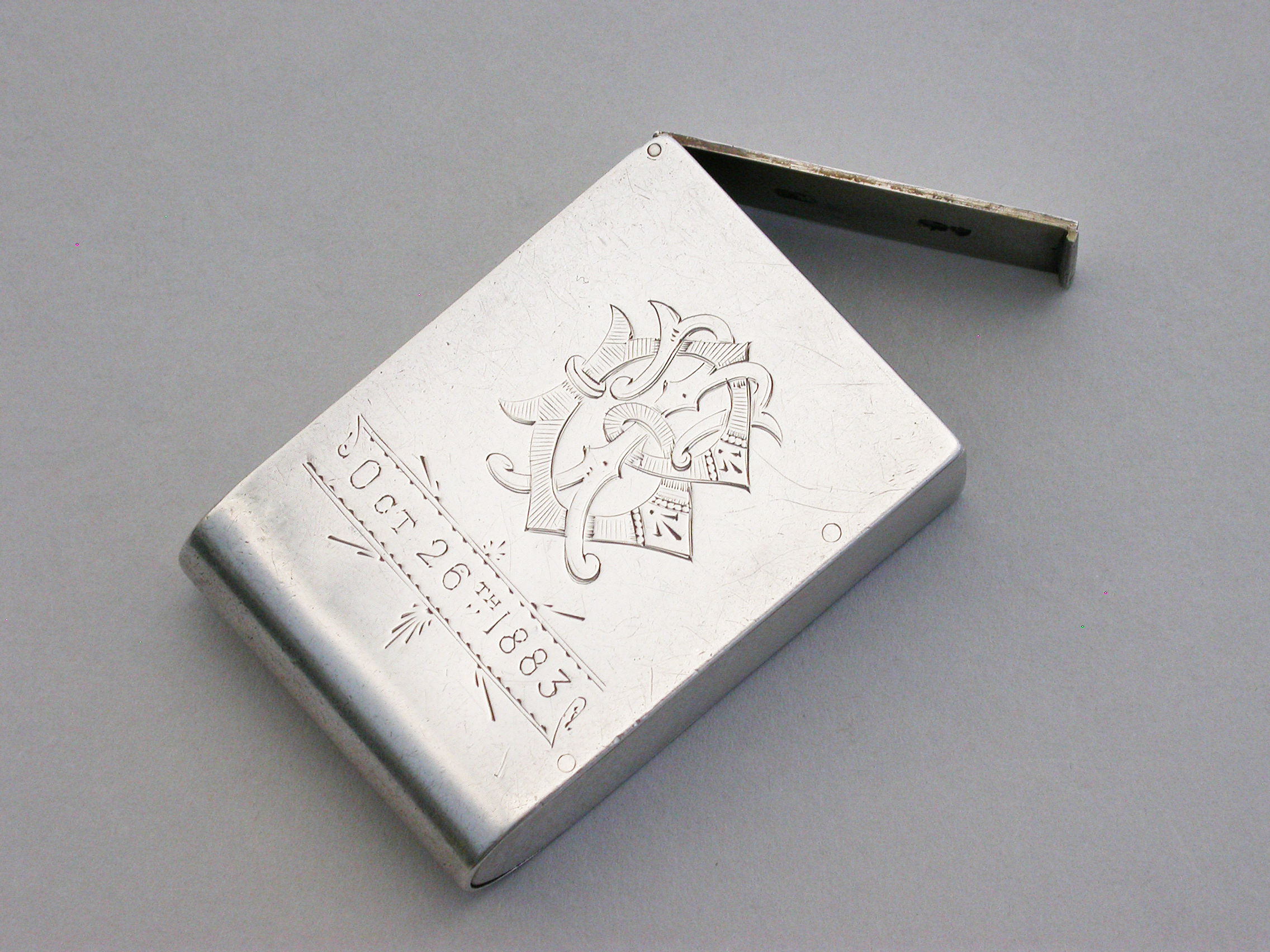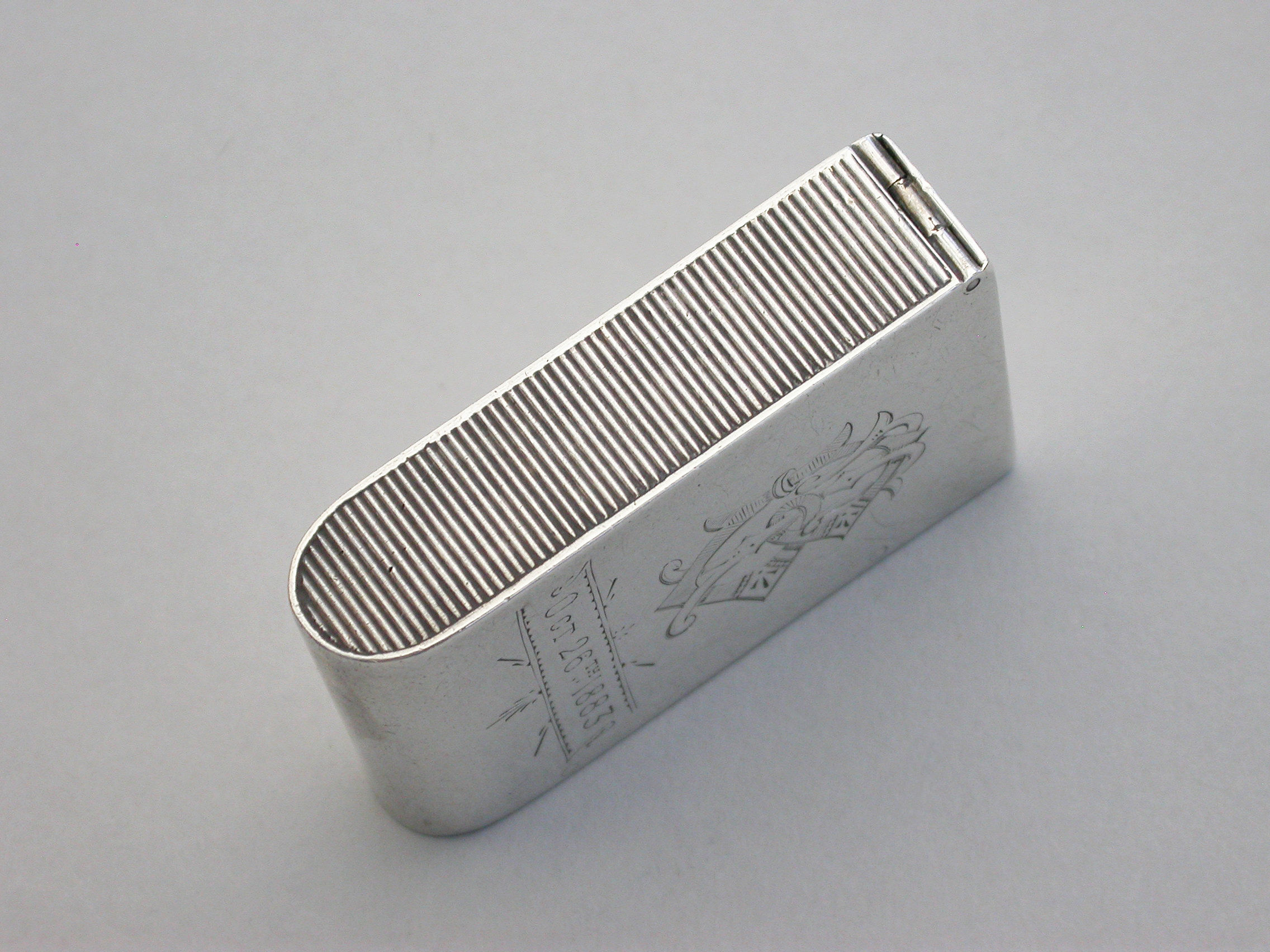 An unusual Victorian silver trick opening Vesta Case of plain domed rectangular form, a striker to one side, the face engraved with contemporary monogram and dated Oct 26th 1883.