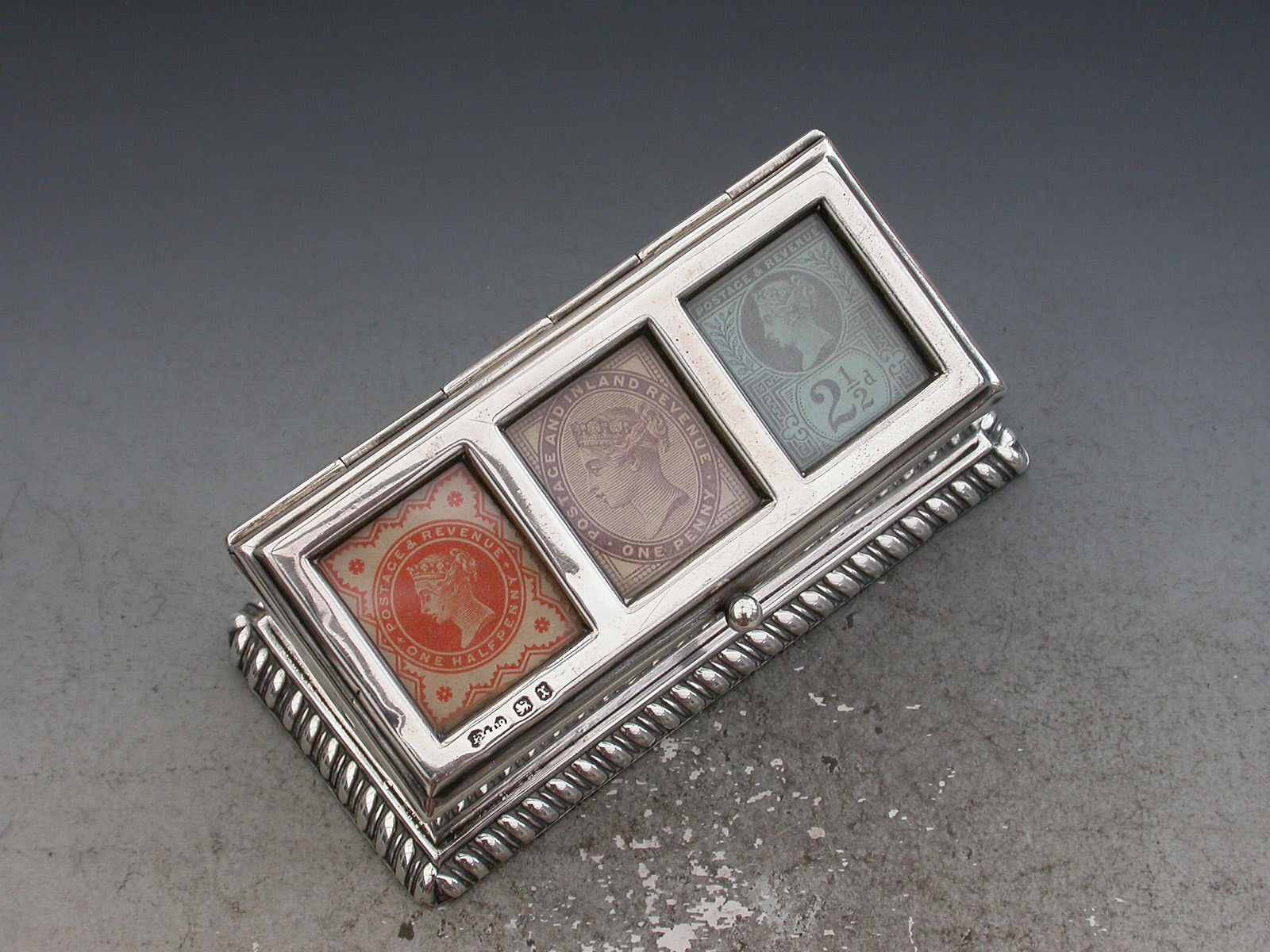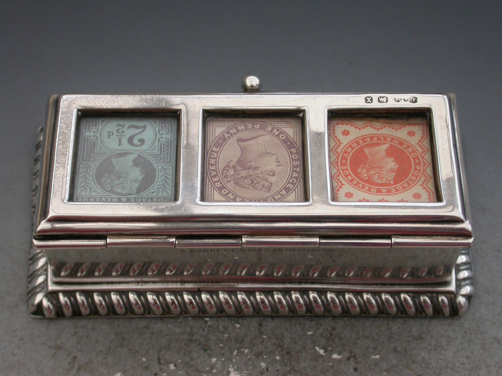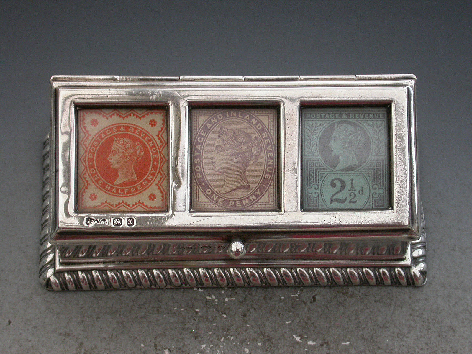 A fine Victorian silver triple compartment Stamp Box of rectangular form with sloped sprung hinged lid and gadrooned border to the base, the lid with three display windows covering Victorian half penny, one penny and 2.1/2d stamps. The silver gilt interior with three sloped compartments and red leather cover to the interior lid.