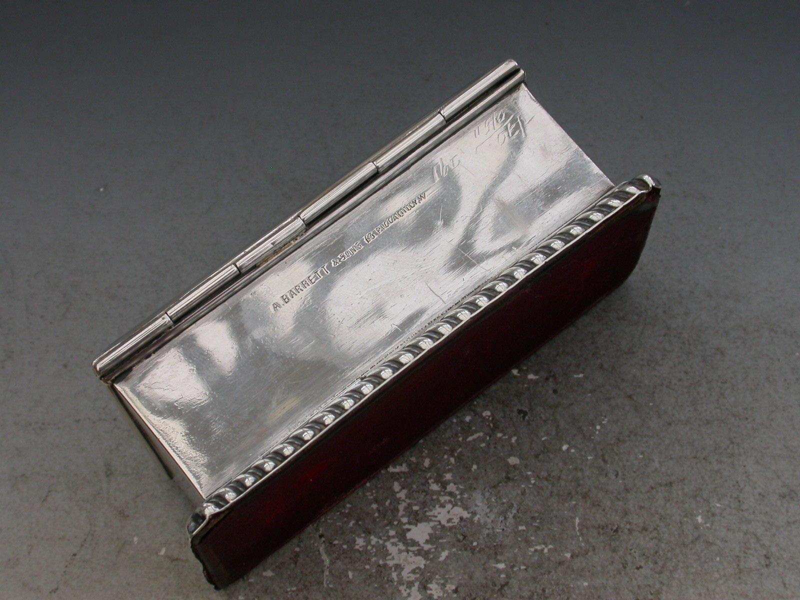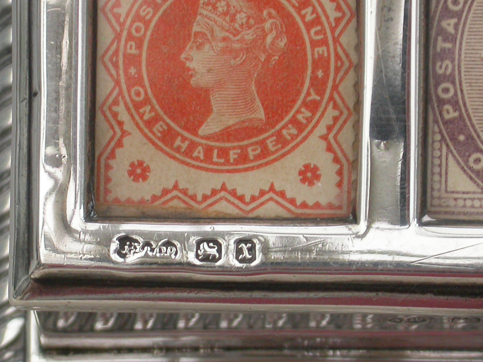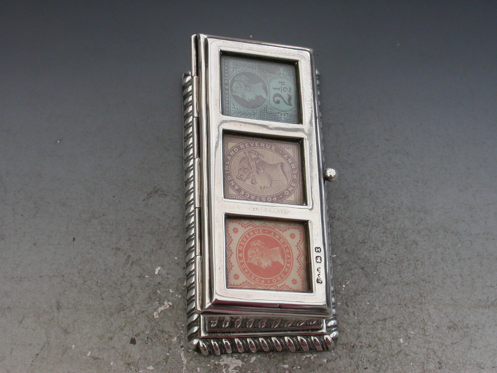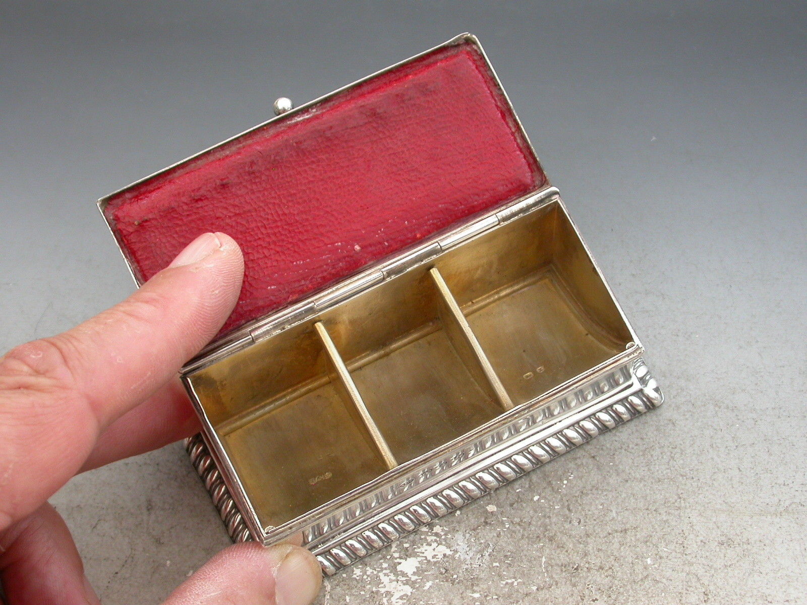 A fine Victorian silver triple compartment Stamp Box of rectangular form with sloped sprung hinged lid and gadrooned border to the base, the lid with three display windows covering Victorian half penny, one penny and 2.1/2d stamps. The silver gilt interior with three sloped compartments and red leather cover to the interior lid.