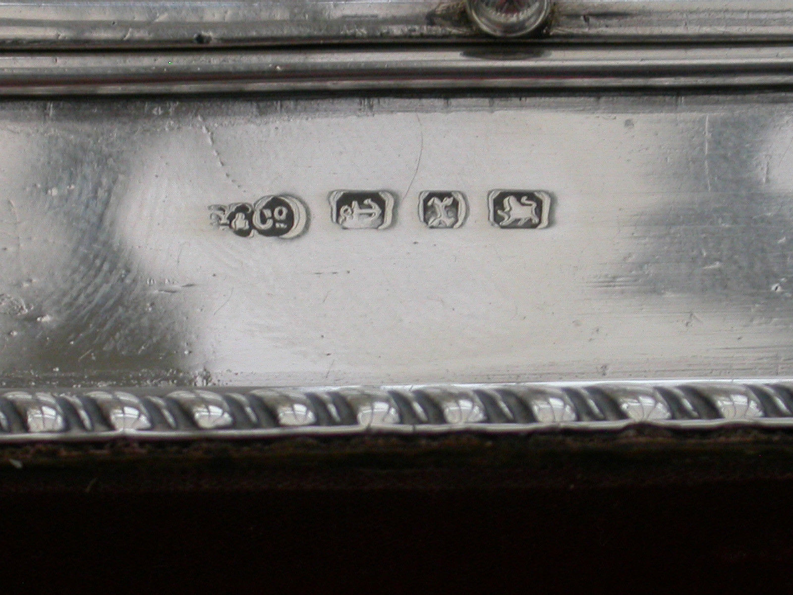In fine condition with original stamps and leather interior. One small dink to a corner of the base and minor surface scratches to the sides.
