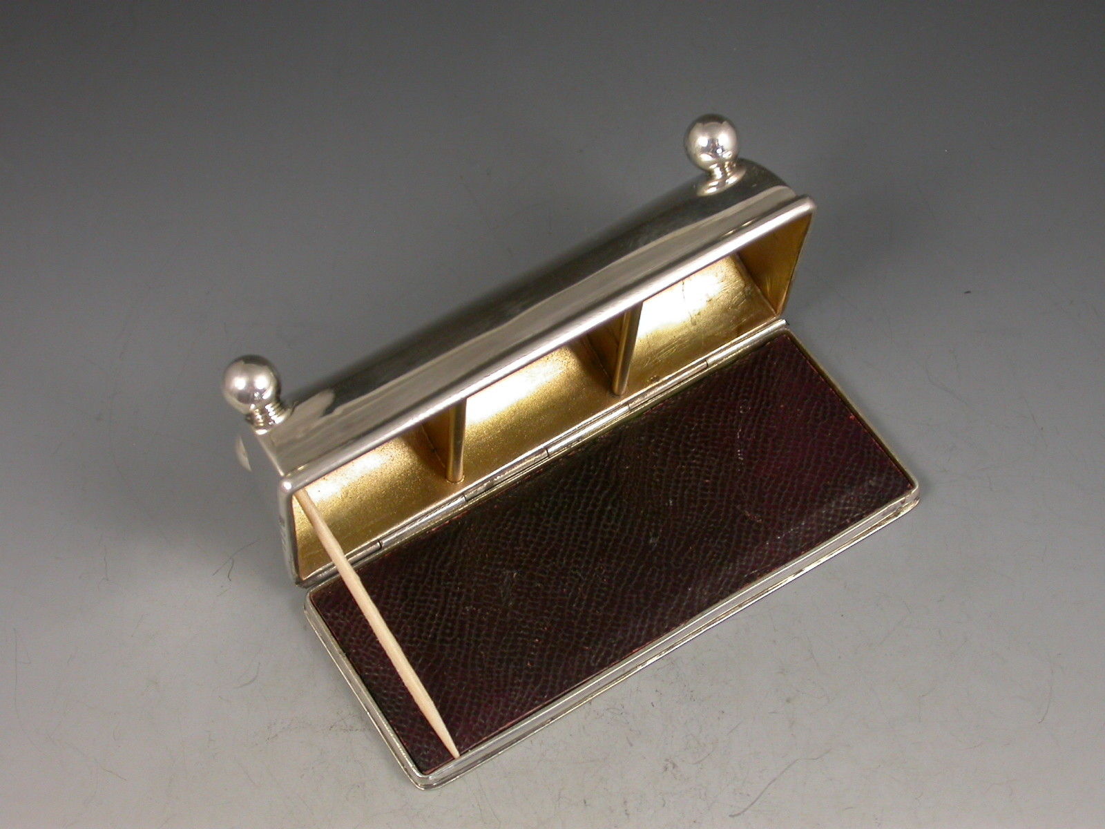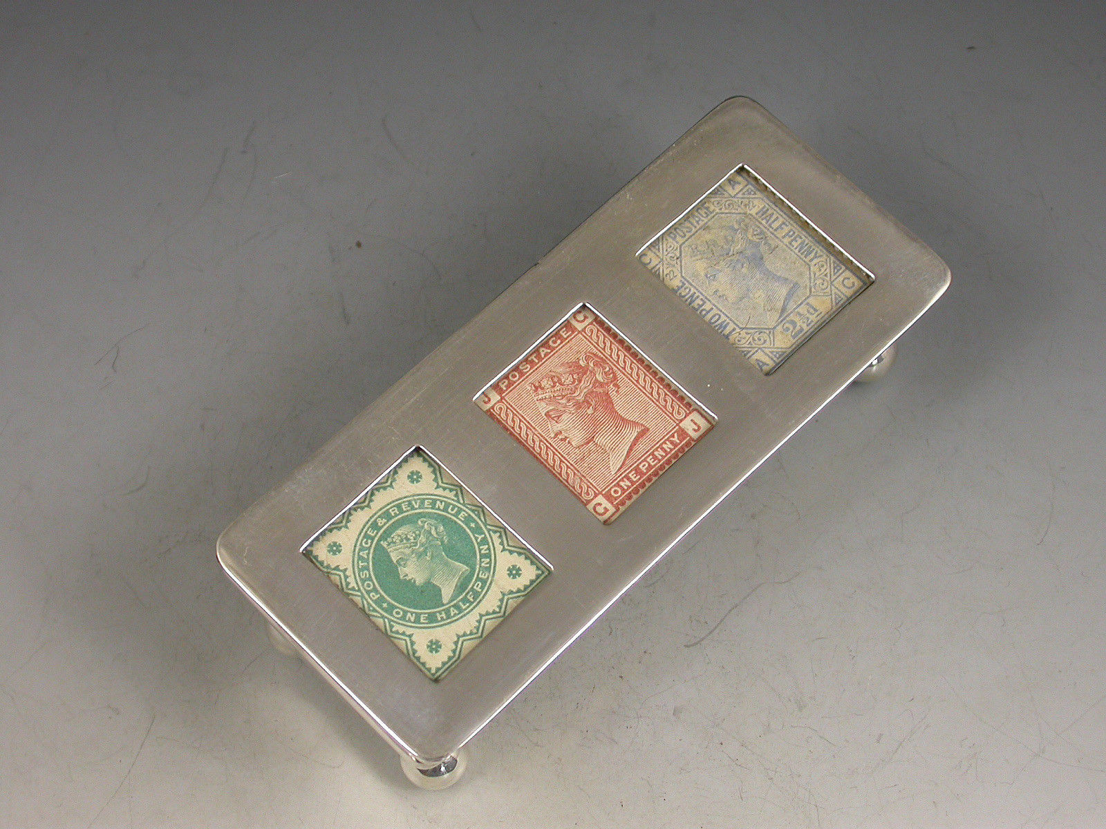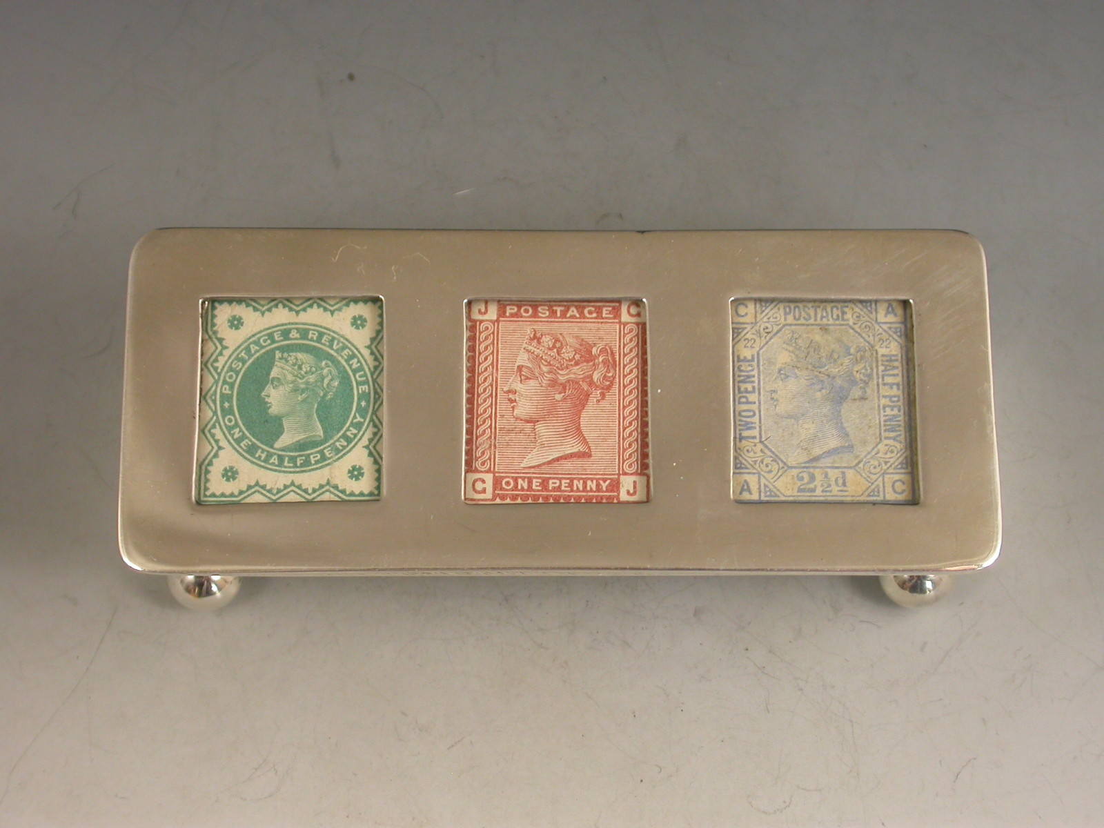 A good Victorian silver triple compartment Stamp Box of trough shape, standing on four ball feet, the sprung hinged lid with three glazed windows containing unused Victorian half penny, one penny and two and a half penny stamps. Silver gilt interior and leather cover to stamp compartment.