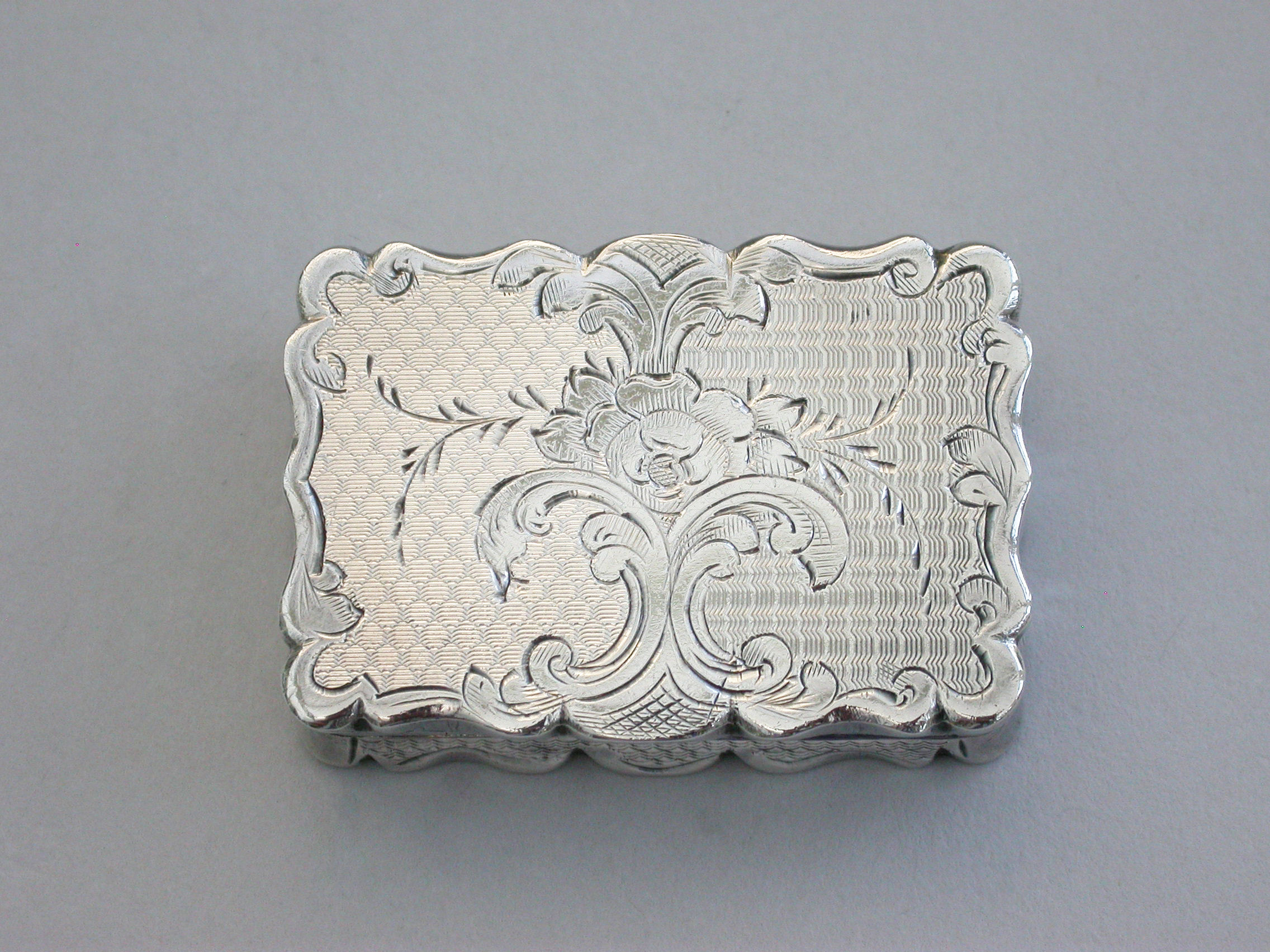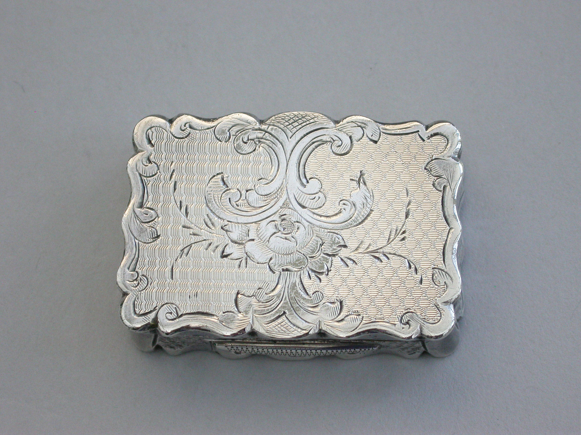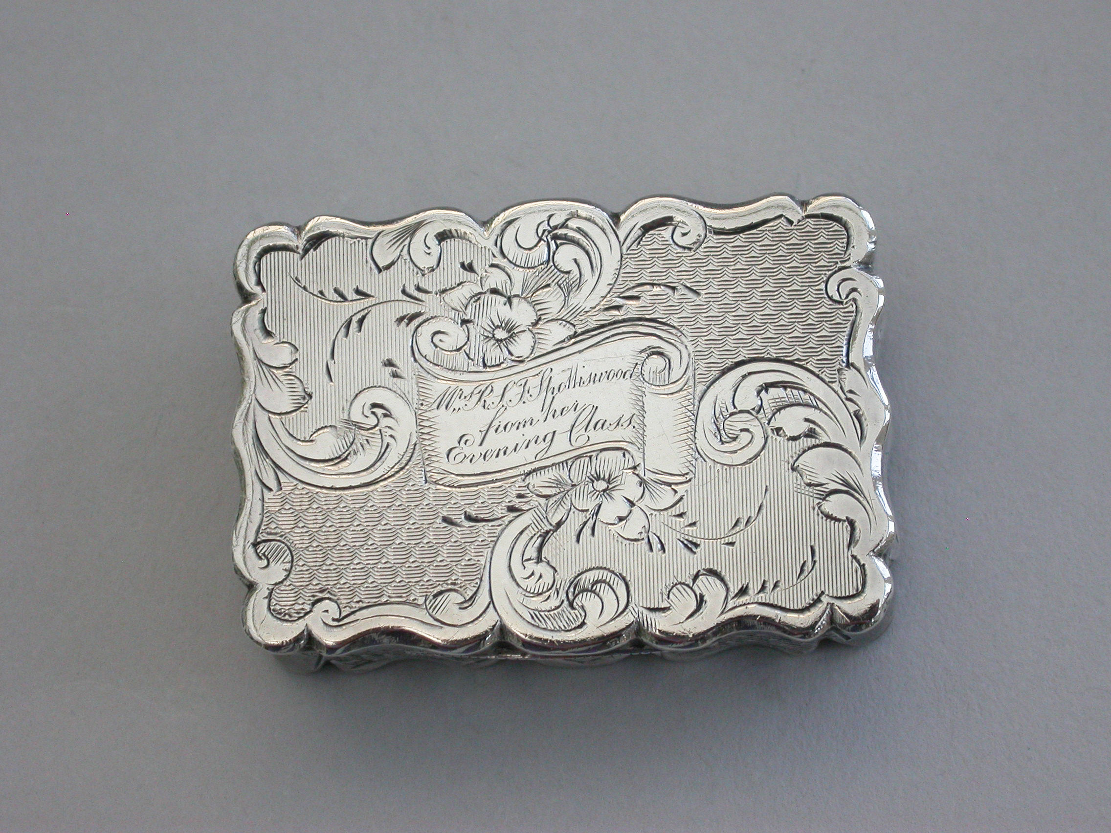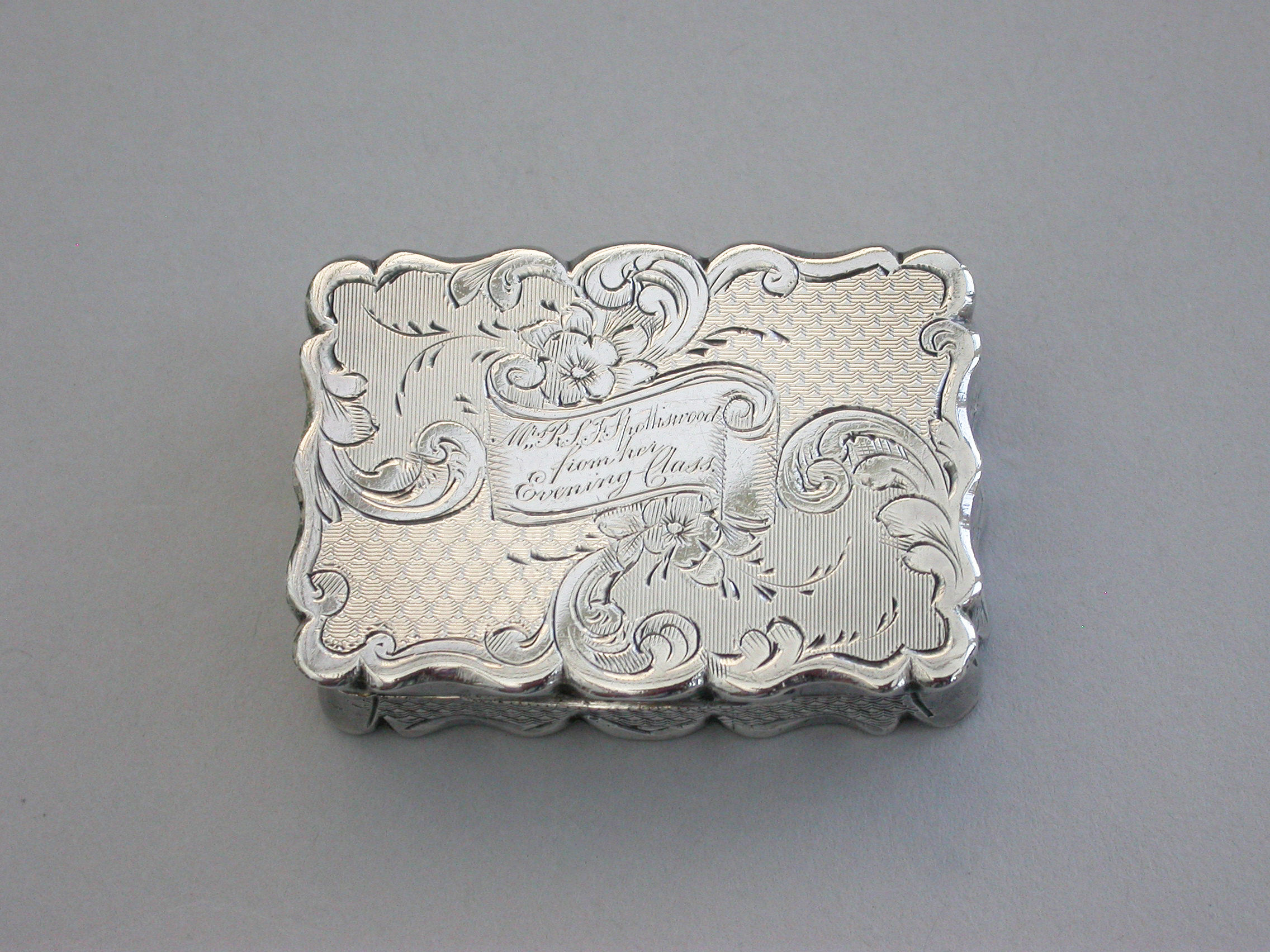 A charming and fine quality Victorian silver Vinaigrette of rectangular form with scalloped edges and all-over decoration of engine turned panels separated by engraved scrolls and flowers. The cover with central cartouche formed as an open scroll engraved: ""Mrs P.S.F Spottiswood from her evening class"". The pierced silver gilt grille with scrolls and a flower head.