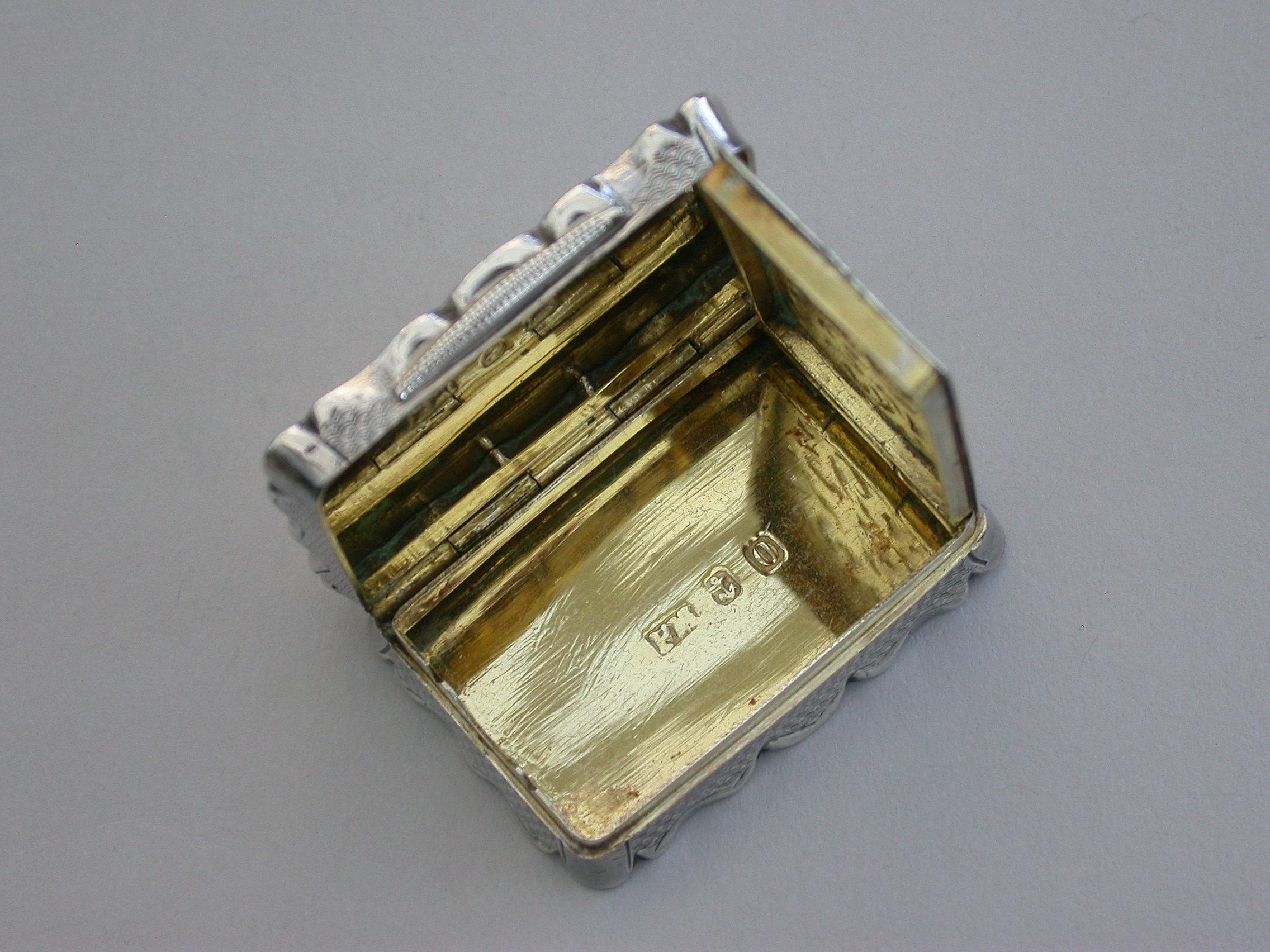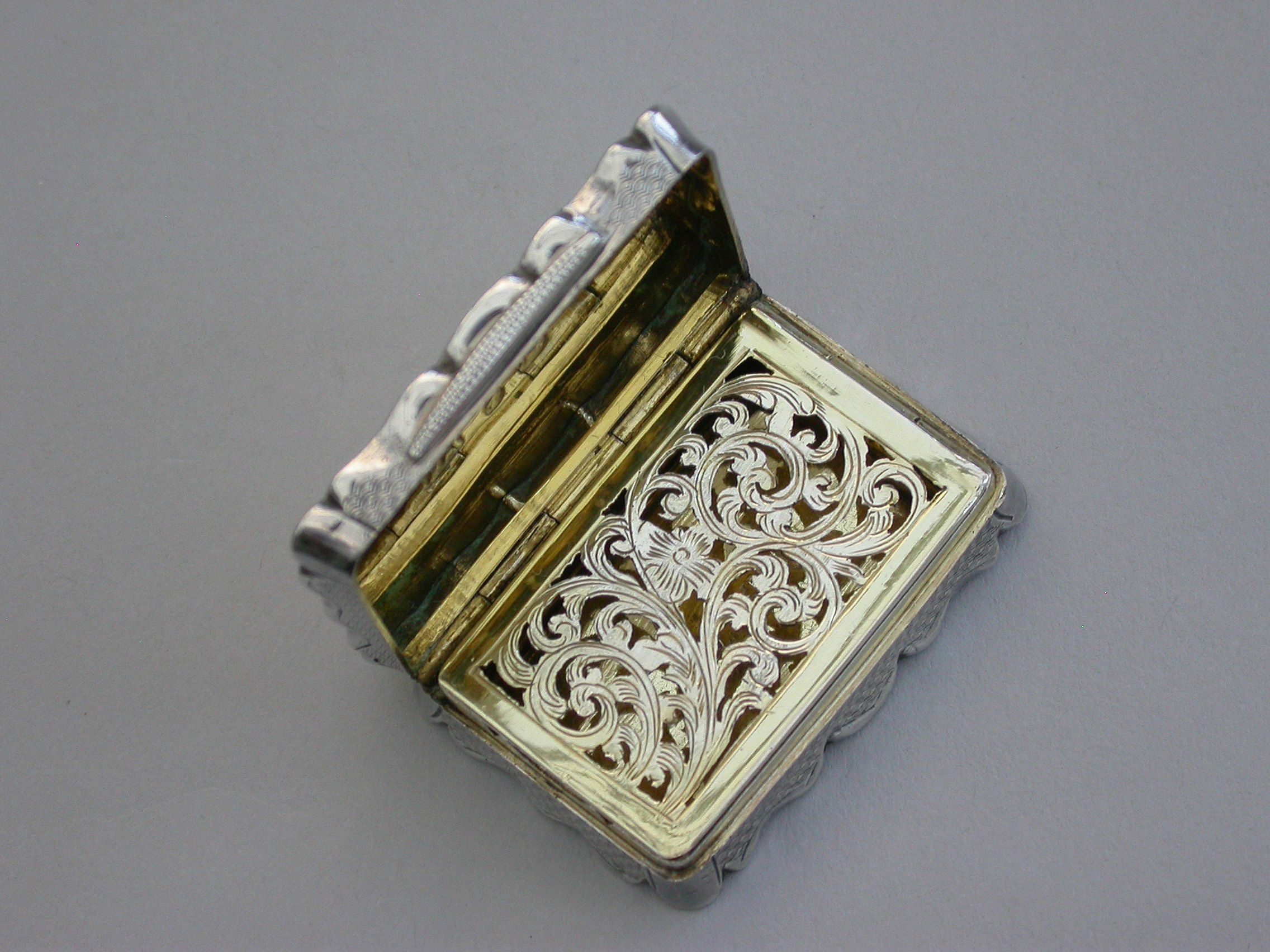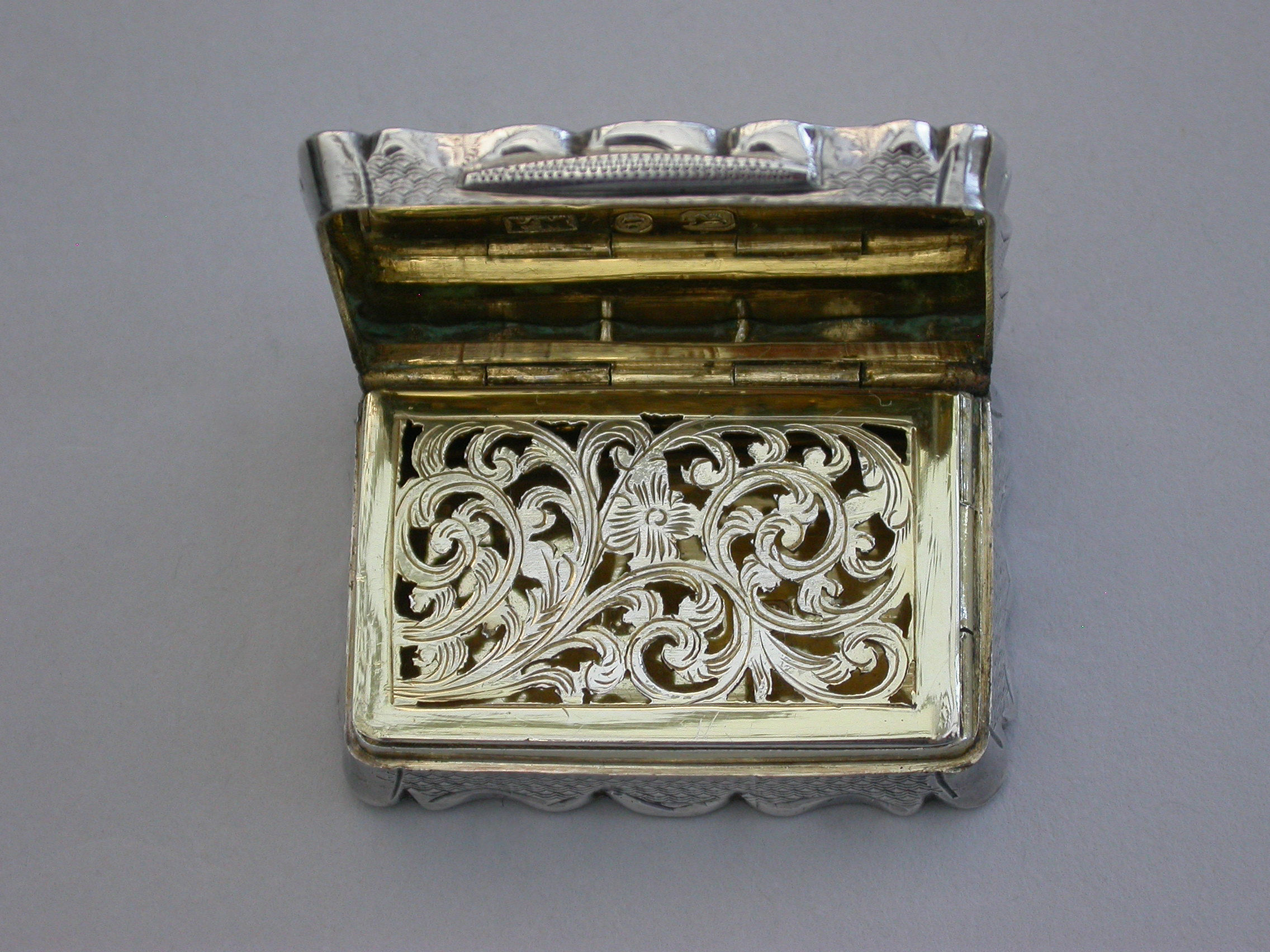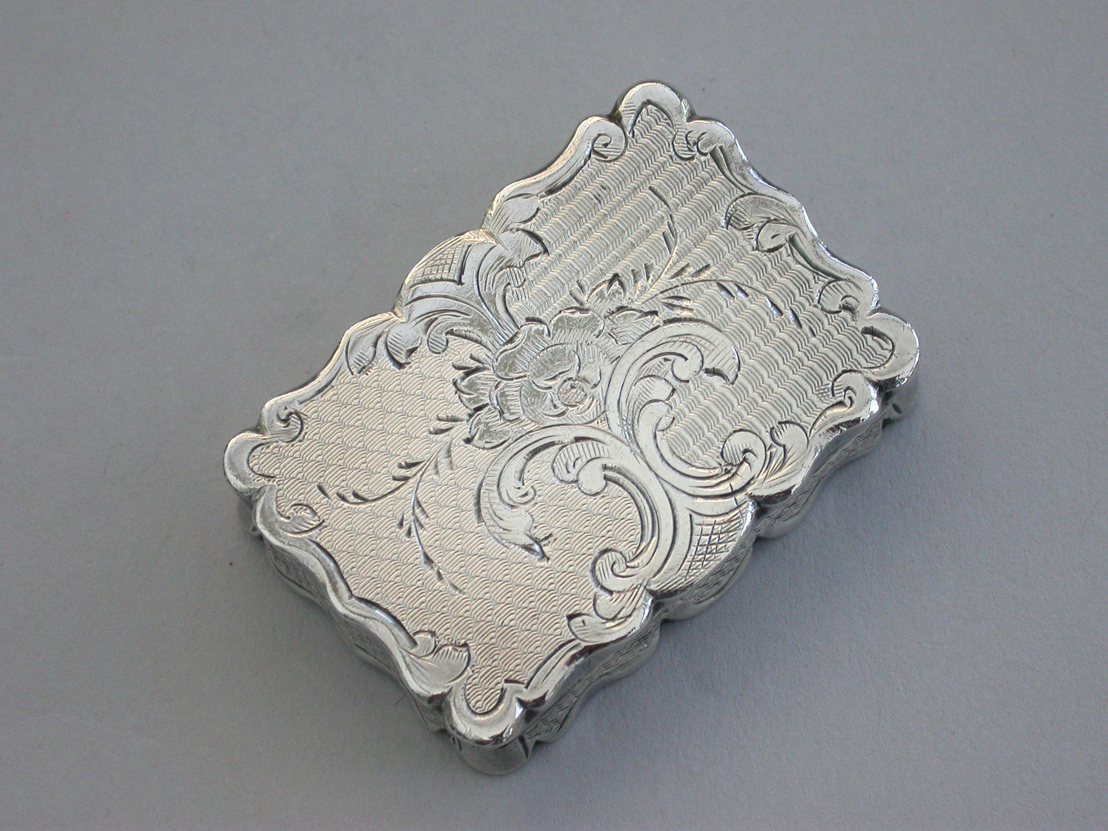 A charming and fine quality Victorian silver Vinaigrette of rectangular form with scalloped edges and all-over decoration of engine turned panels separated by engraved scrolls and flowers. The cover with central cartouche formed as an open scroll engraved: ""Mrs P.S.F Spottiswood from her evening class"". The pierced silver gilt grille with scrolls and a flower head.