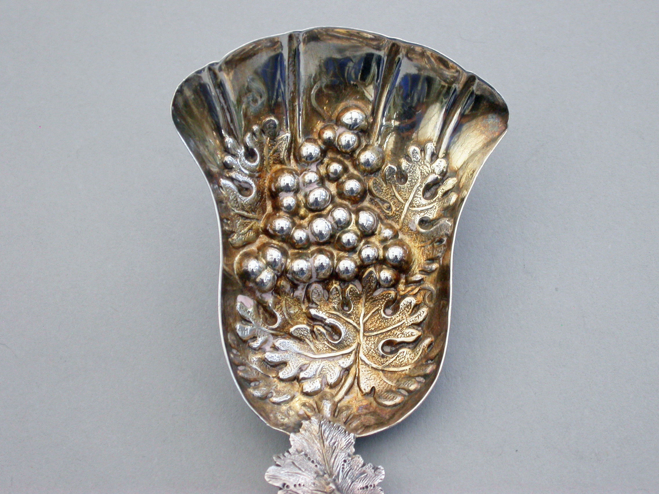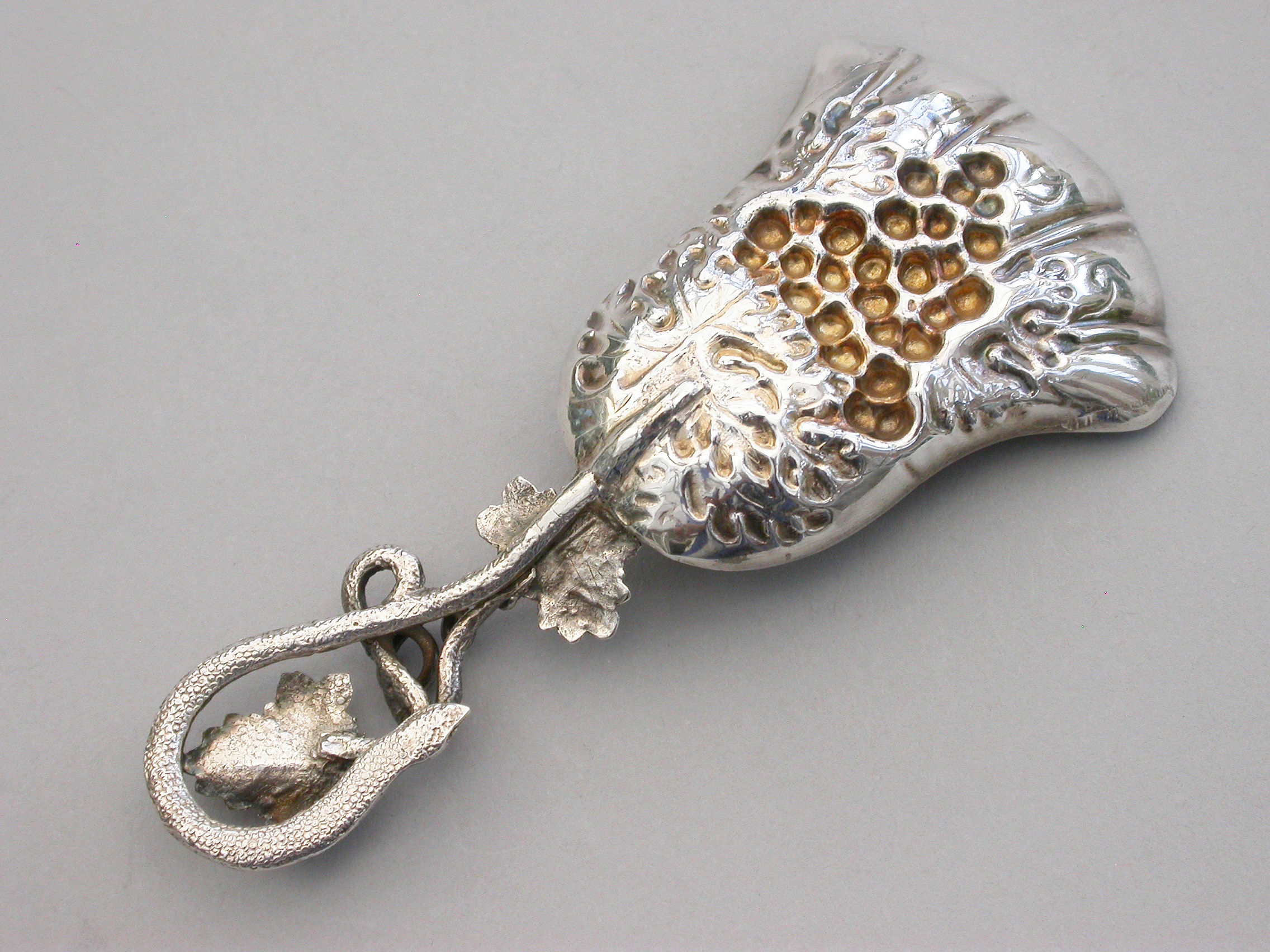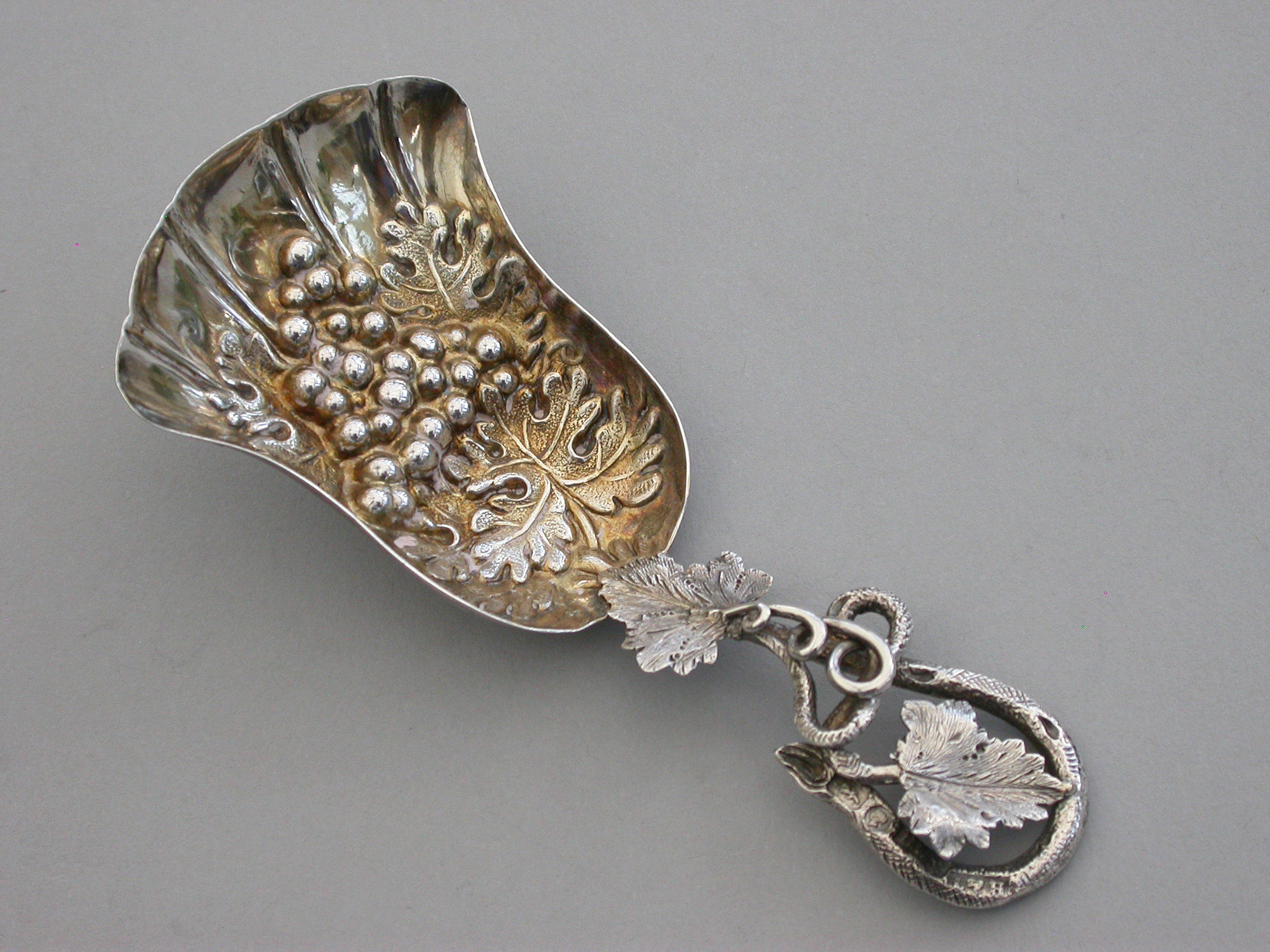 A good Victorian silver Caddy Spoon, the die-stamped silver gilt tulip shaped bowl embossed with a bunch of grapes and vine leaves, the twisted vine tendril handle also decorated with vine leaves.