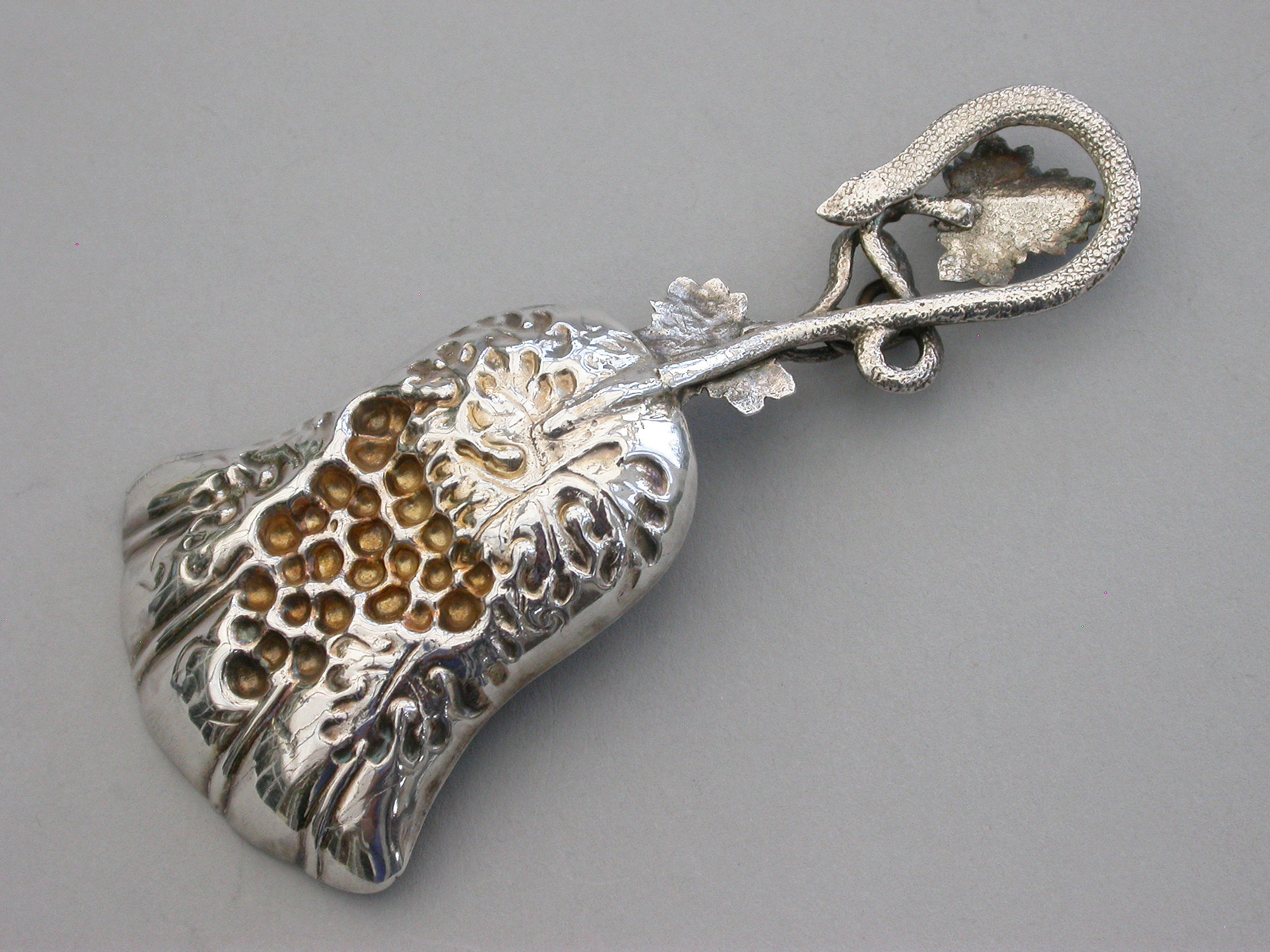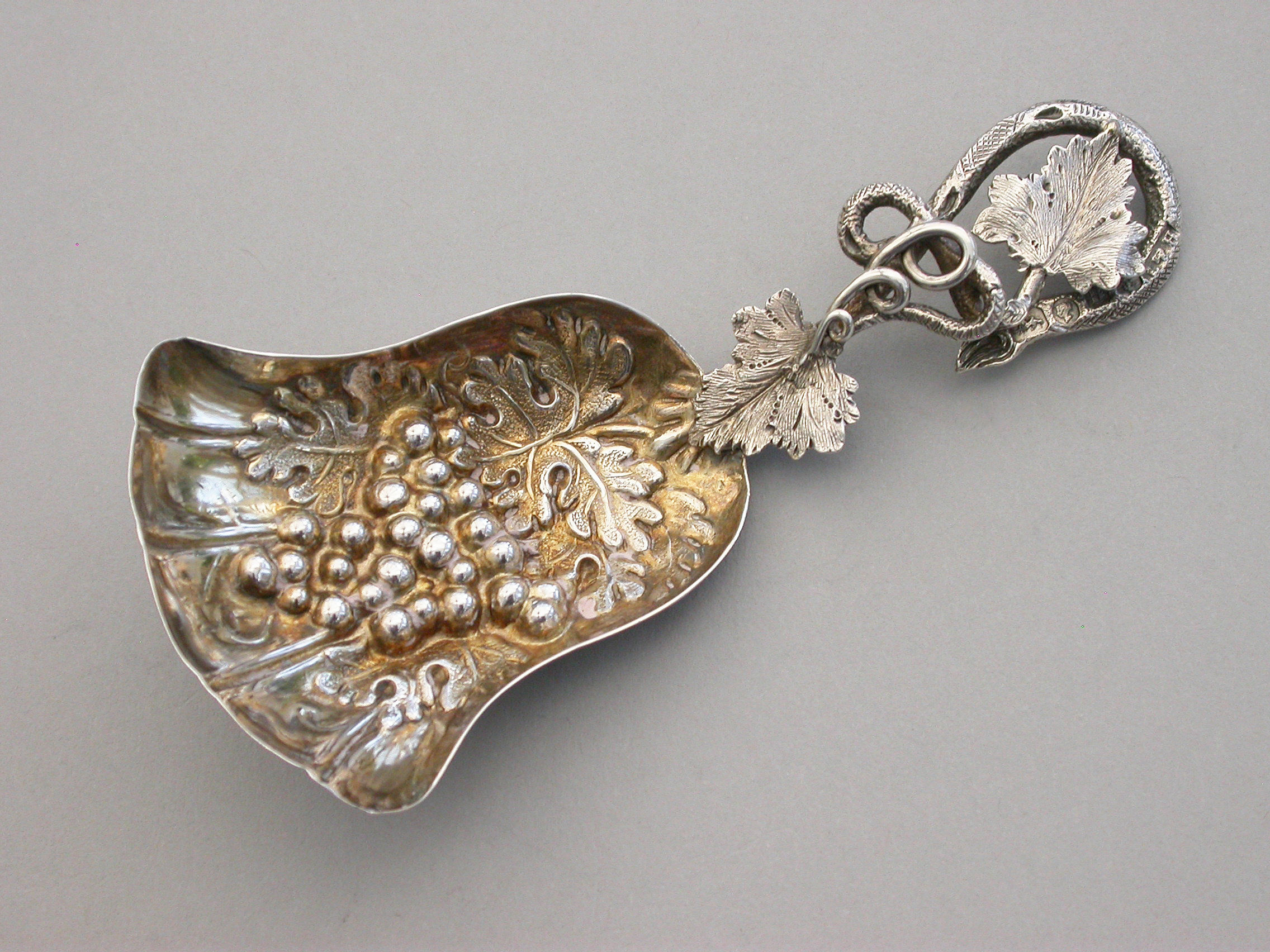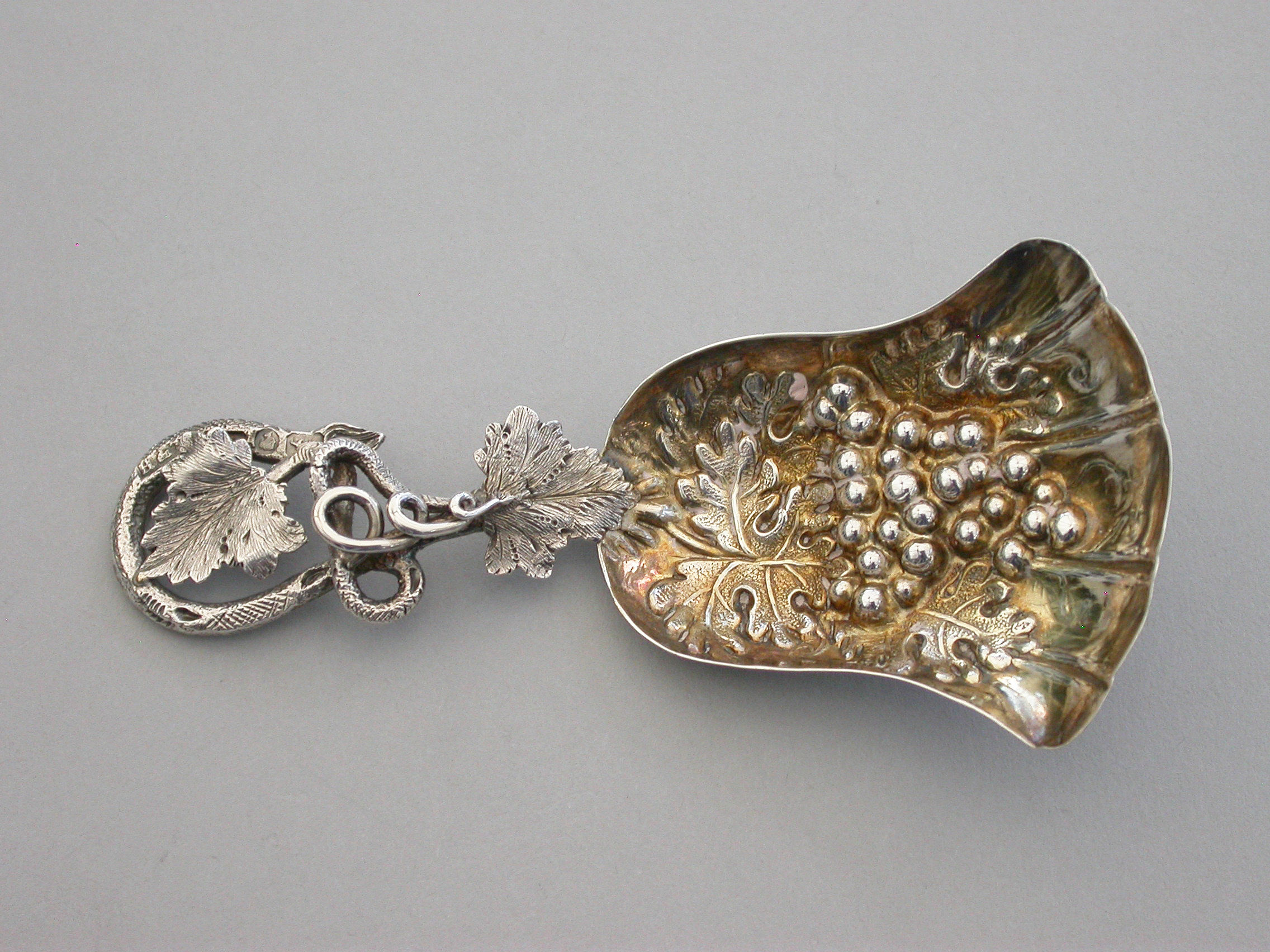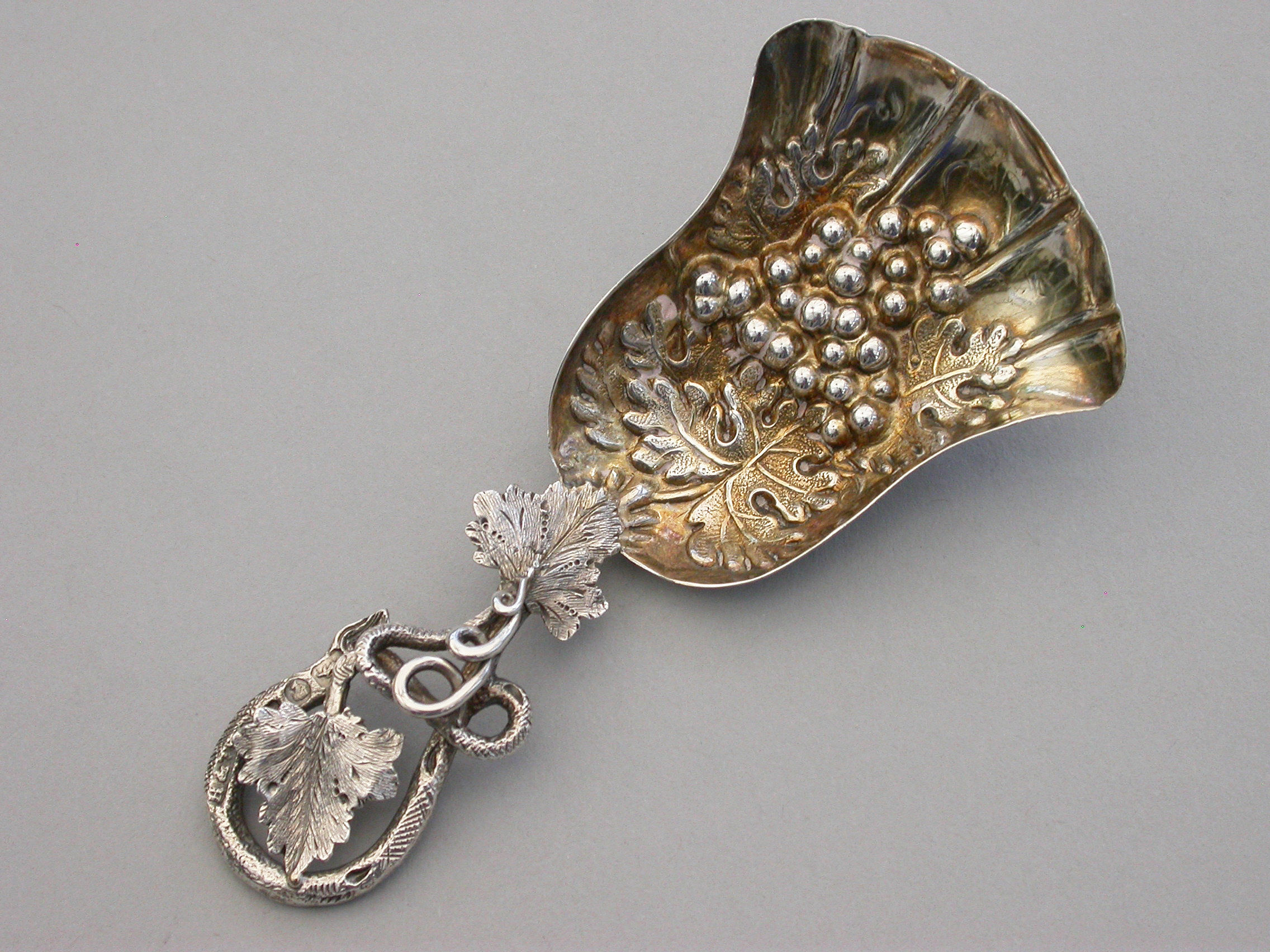 A good Victorian silver Caddy Spoon, the die-stamped silver gilt tulip shaped bowl embossed with a bunch of grapes and vine leaves, the twisted vine tendril handle also decorated with vine leaves.