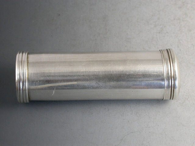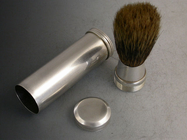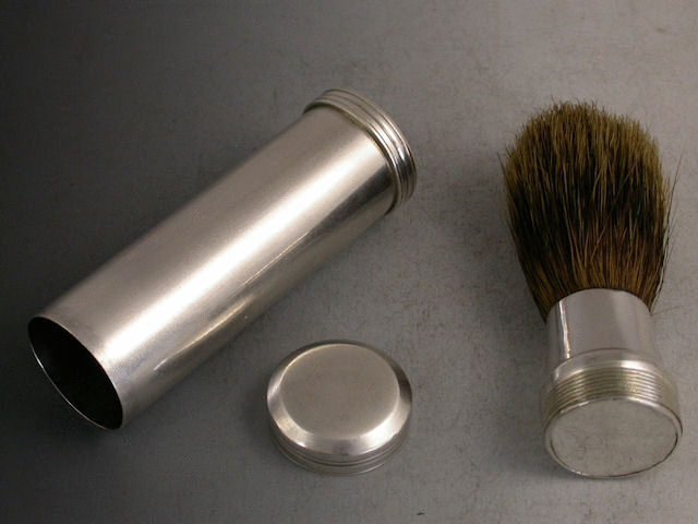 A good early Victorian silver Travelling Shaving Brush of plain cylindrical form with reeded decoration to the base and pull off cover, the original badger hair brush stored inside the tube and screwed into the body for use.