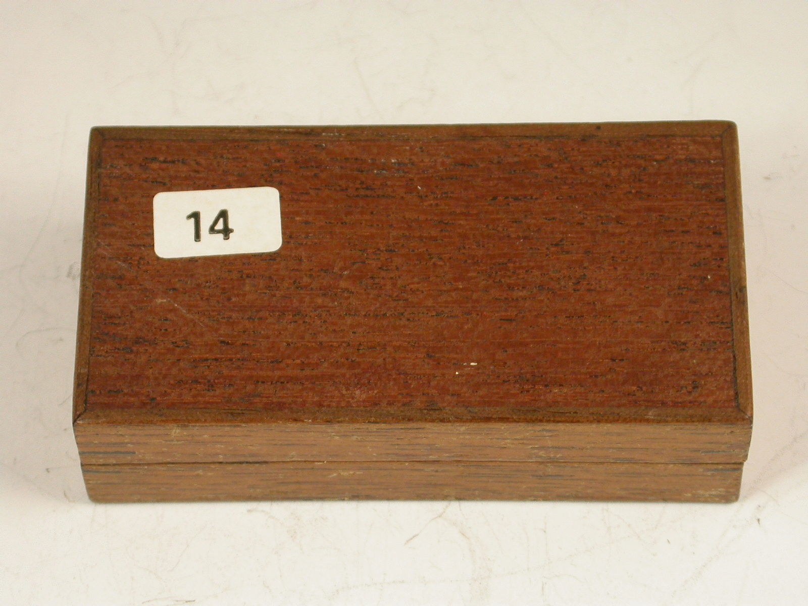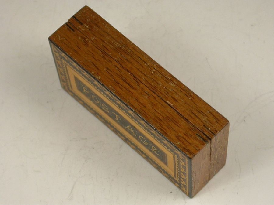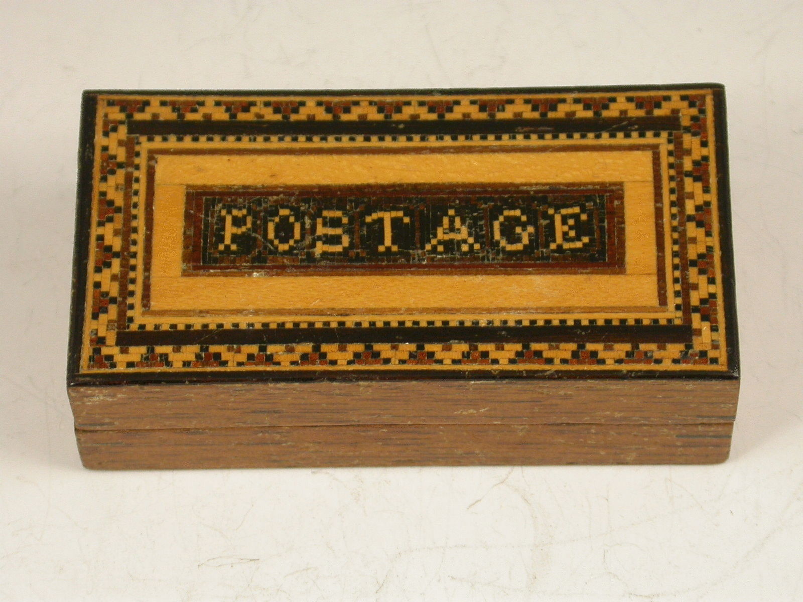 A late 19th century Tunbridgeware rectangular wooden Stamp Box, the lid inlaid with mosaic patterns and the word postage.
