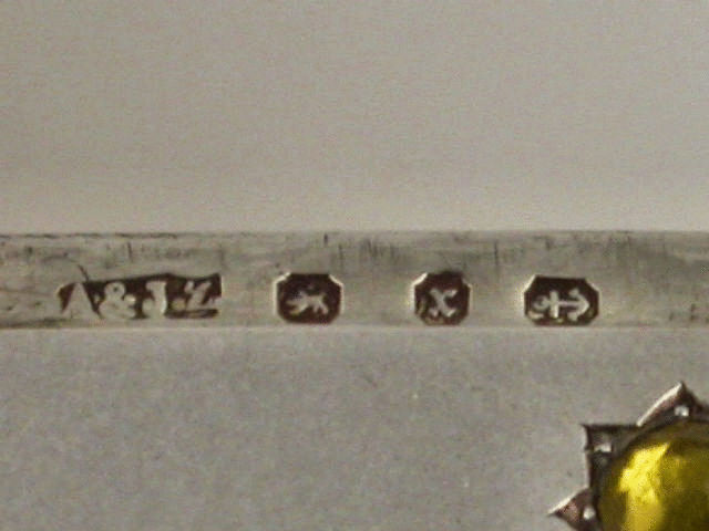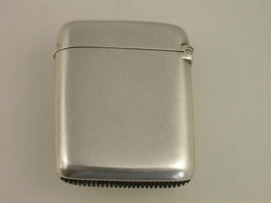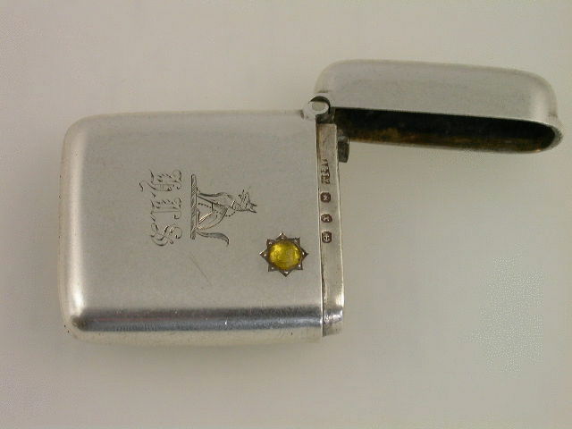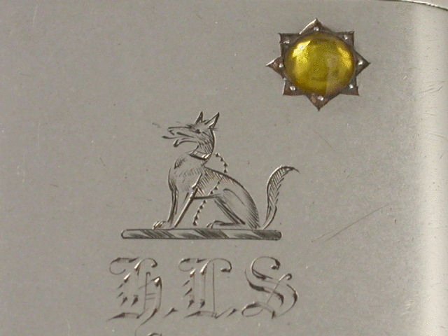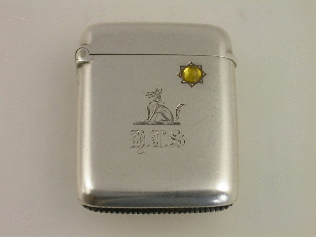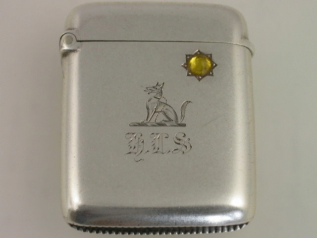 An interesting Victorian silver Vesta Case of plain rounded rectangular form with hinged flip top lid, the front engraved with the initials ‘HLS’ and an Armorial Crest depicting a seated fox with collar and chain, and also set with an amber coloured stone to represent the sun.