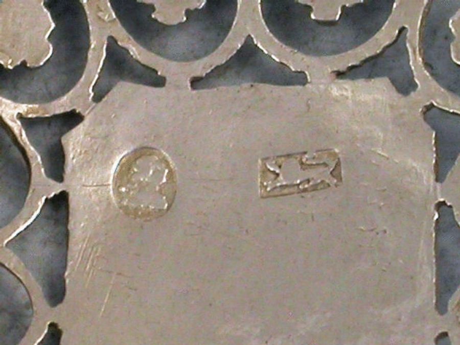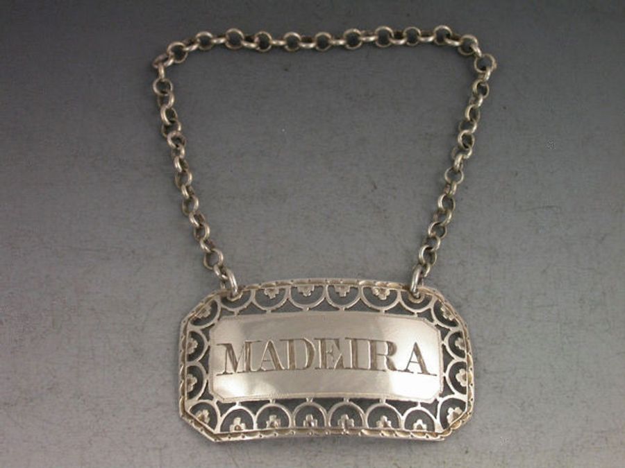 A fine and rare George III Provincial silver Wine Label of rectangular form with cut corners, the intricately pierced border of hoops and trefoils with bright cut engraved decoration, incised for MADEIRA.