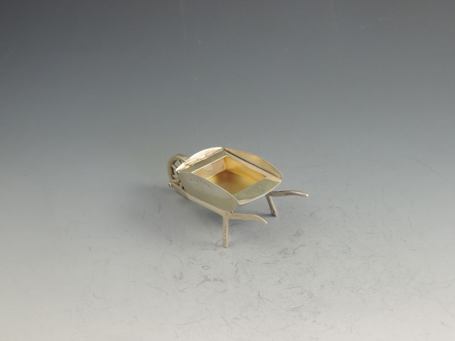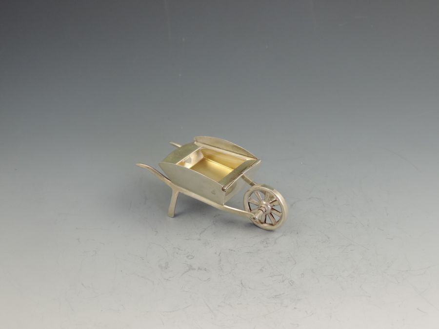 An extremely rare Edwardian novelty silver Stamp Box formed as a Wheel Barrow, the sprung hinged lid with glazed panel, silver gilt interior.