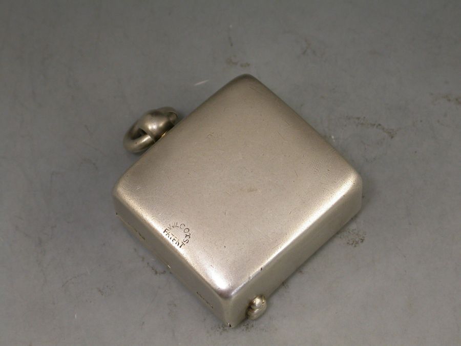 A rare and unusual Wilcox's Patent silver Sovereign Case of cubed form with attached suspension ring, the sliding lid is held in place by the internal sprung sovereign compartment and a brass token stamped with the Royal Crown and the legend - 'The Kings Sovereign Purse Wilcox's Patent', the reverse with 'The Kings Sovereign Purse as supplied to his Majesty'. The case cleverly dispenses just one coin at a time.