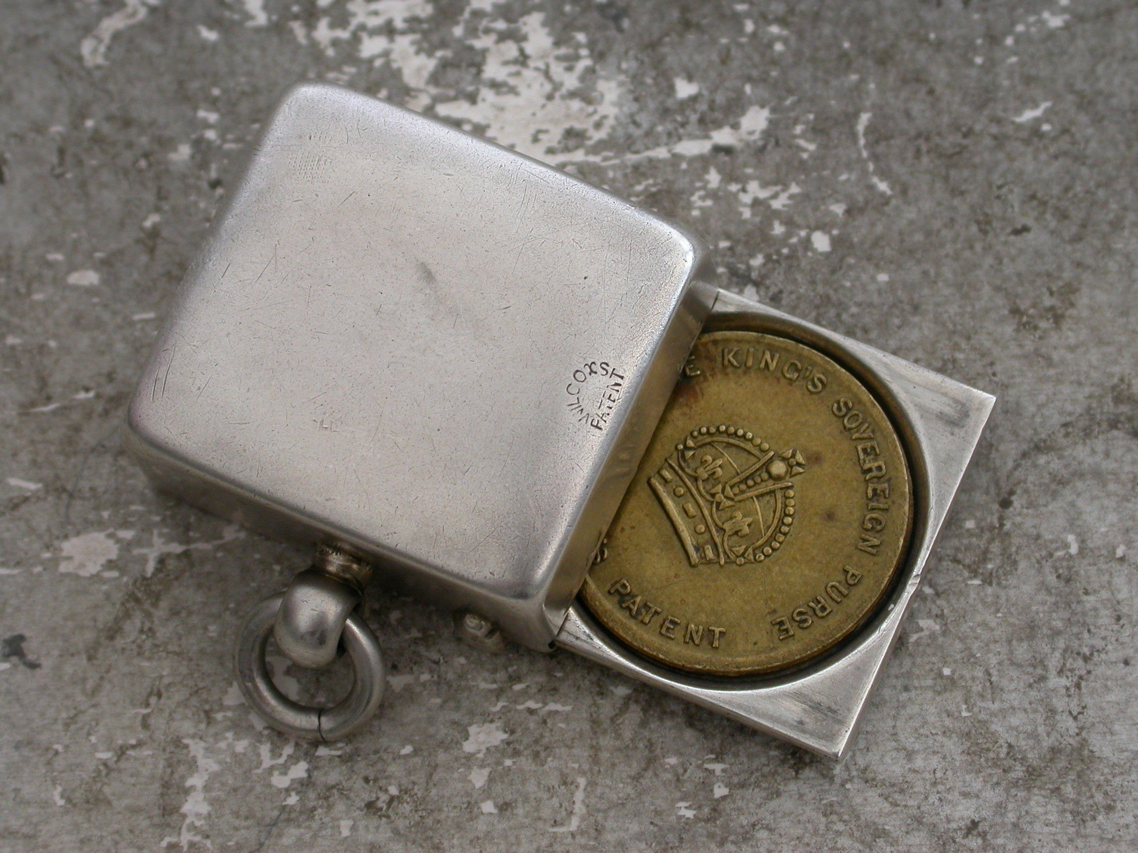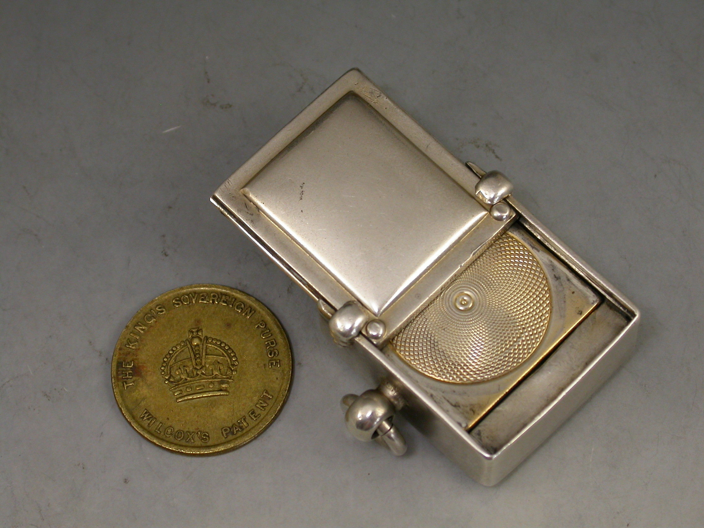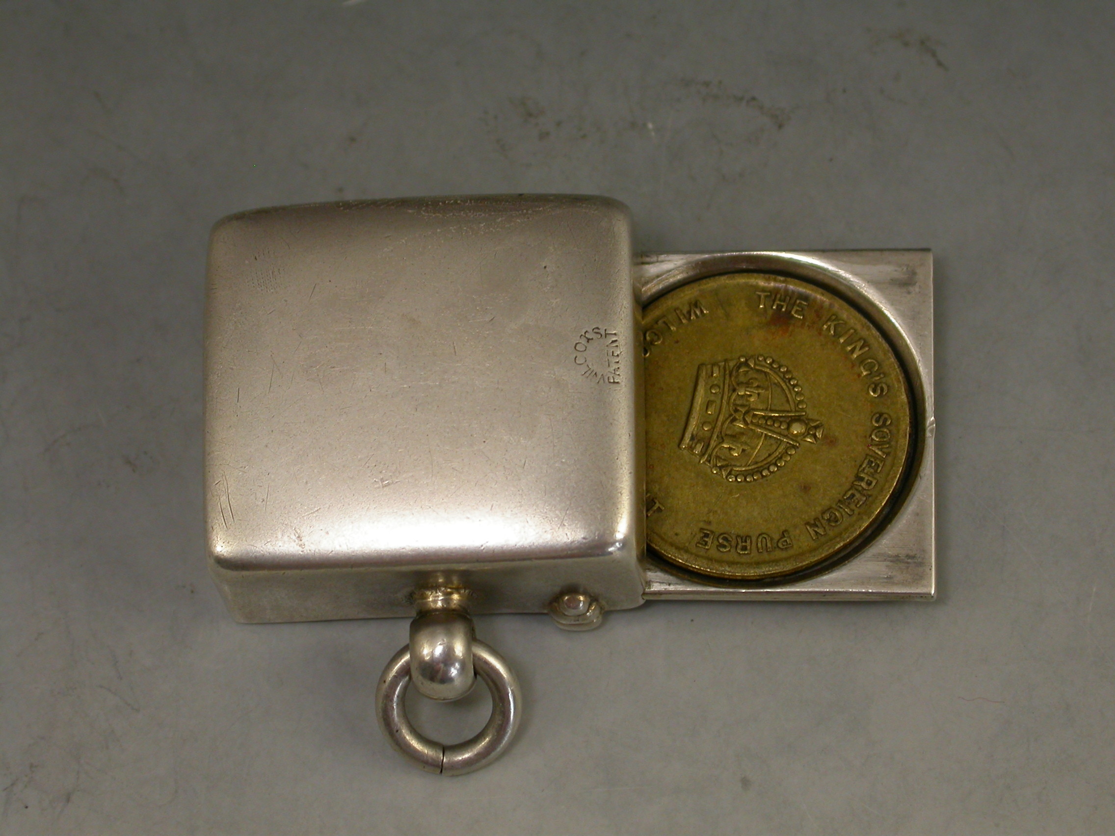 A rare and unusual Wilcox's Patent silver Sovereign Case of cubed form with attached suspension ring, the sliding lid is held in place by the internal sprung sovereign compartment and a brass token stamped with the Royal Crown and the legend - 'The Kings Sovereign Purse Wilcox's Patent', the reverse with 'The Kings Sovereign Purse as supplied to his Majesty'. The case cleverly dispenses just one coin at a time.