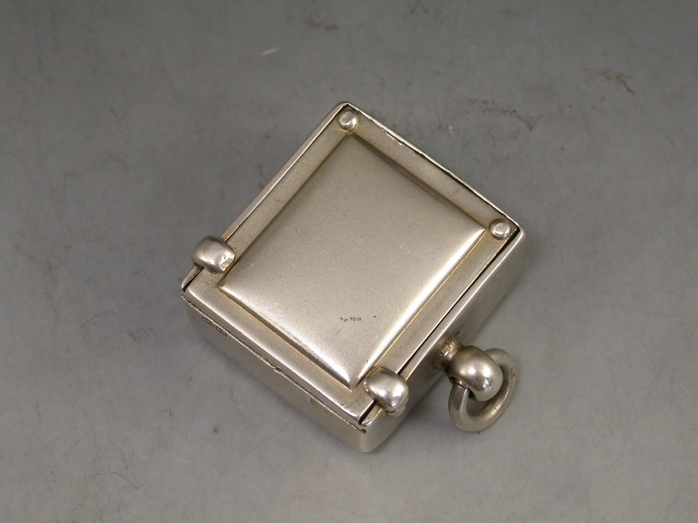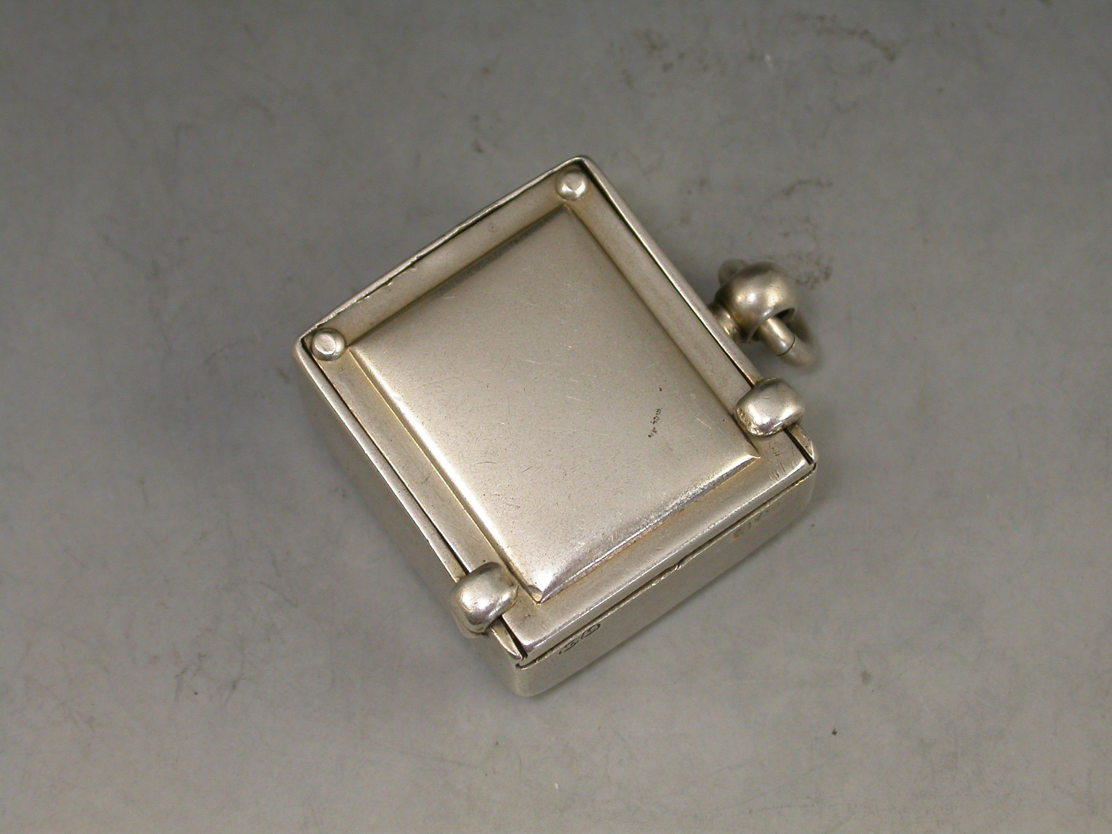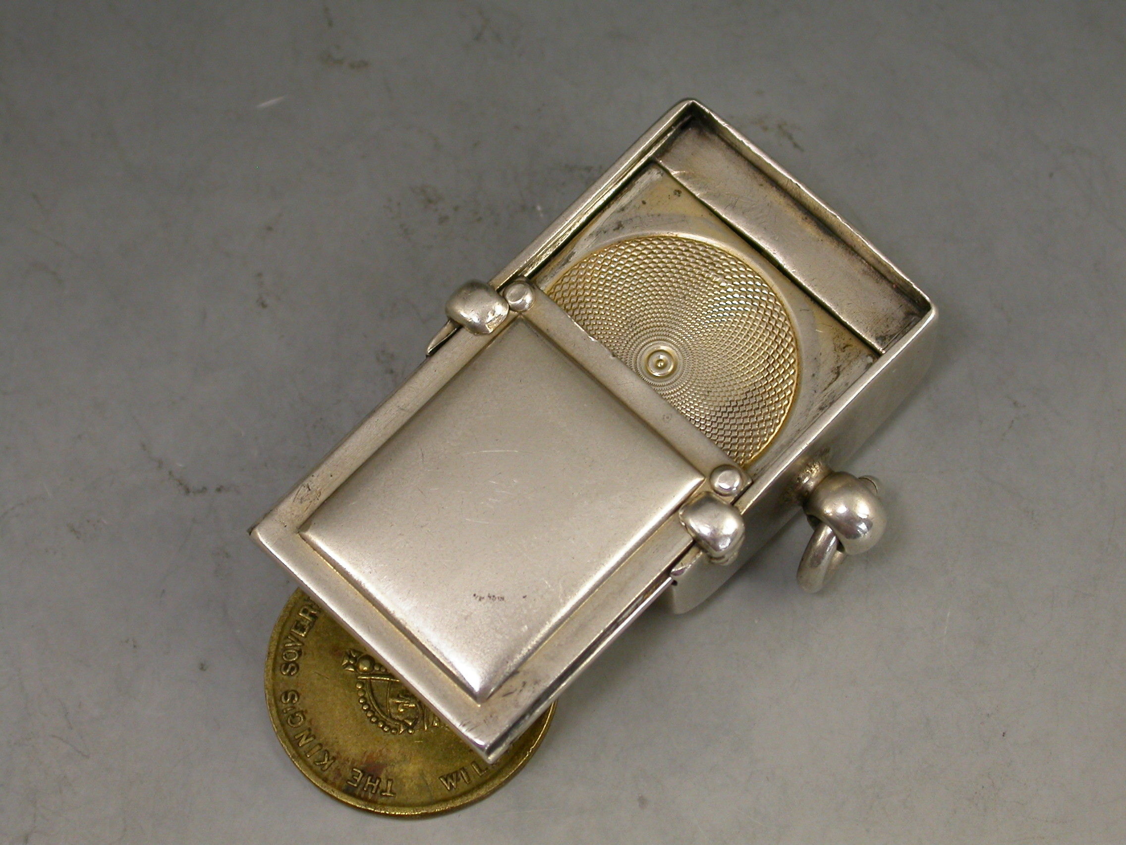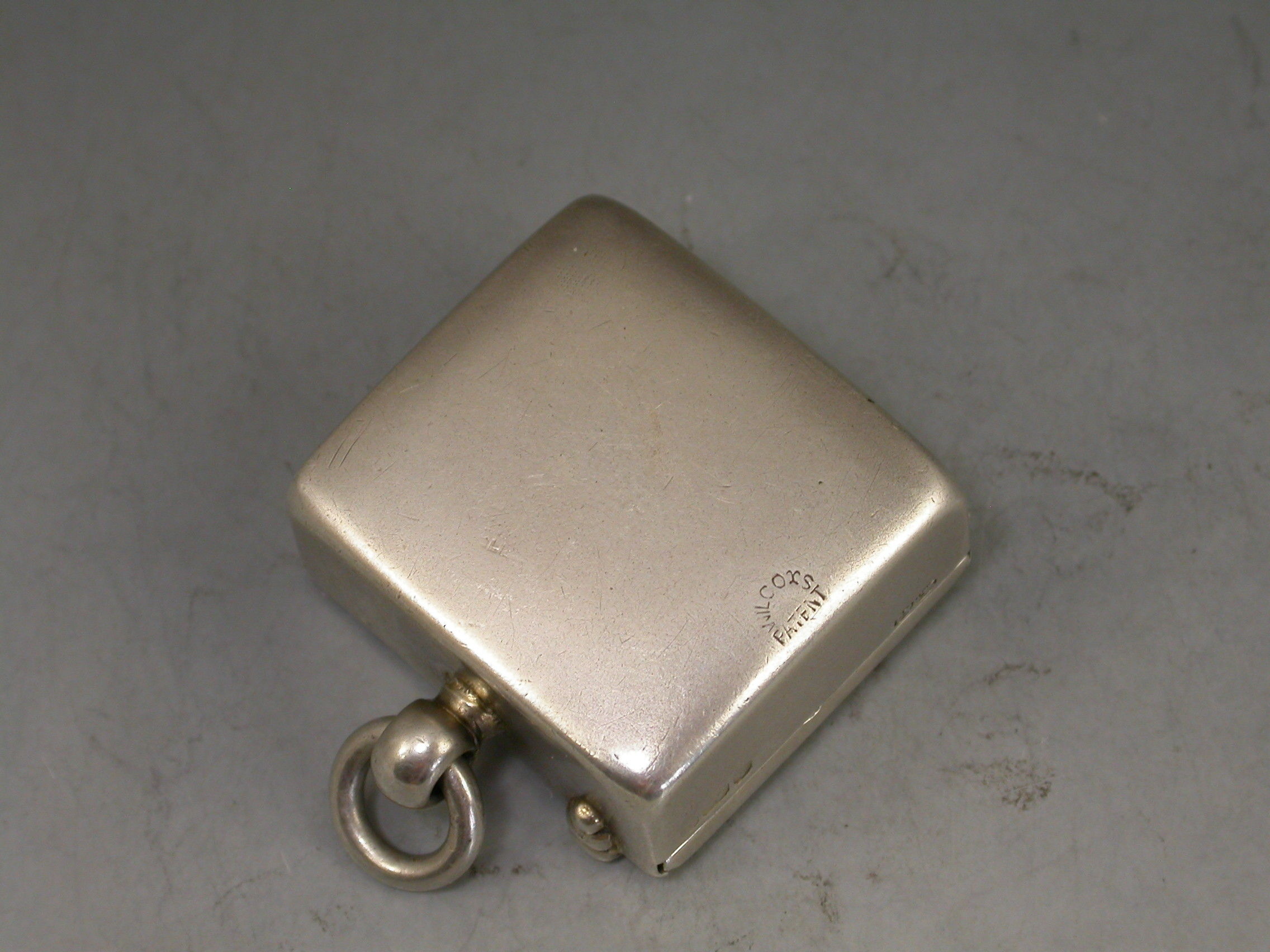 A rare and unusual Wilcox's Patent silver Sovereign Case of cubed form with attached suspension ring, the sliding lid is held in place by the internal sprung sovereign compartment and a brass token stamped with the Royal Crown and the legend - 'The Kings Sovereign Purse Wilcox's Patent', the reverse with 'The Kings Sovereign Purse as supplied to his Majesty'. The case cleverly dispenses just one coin at a time.