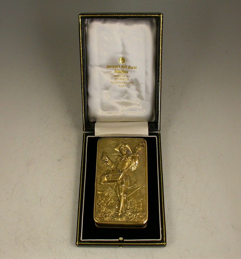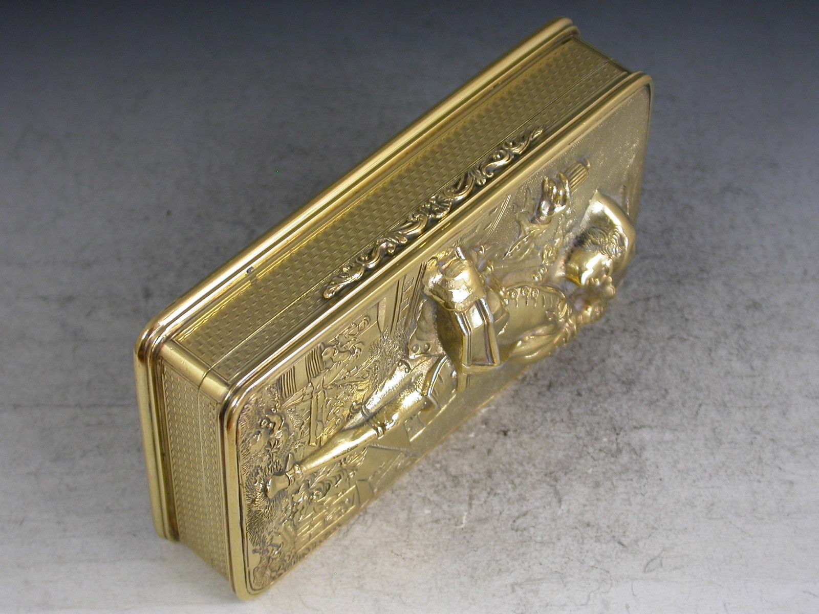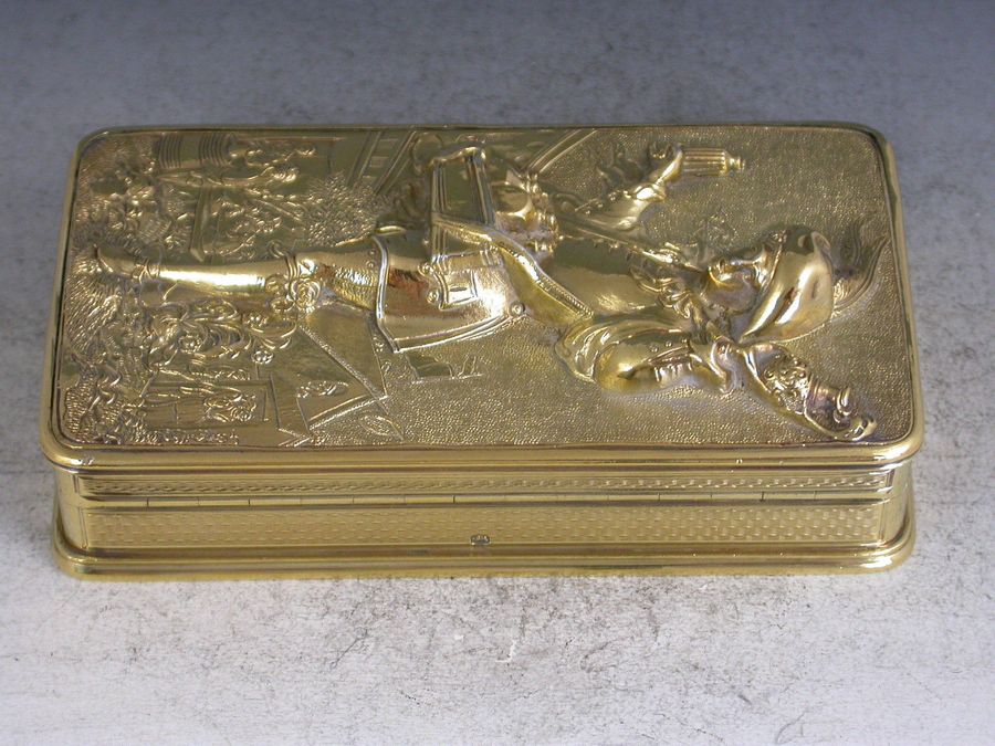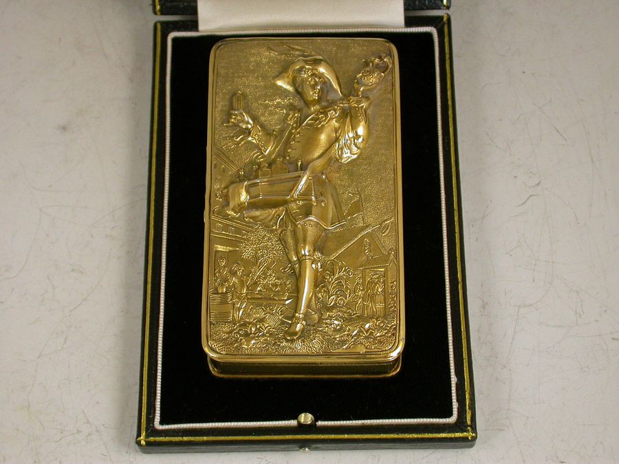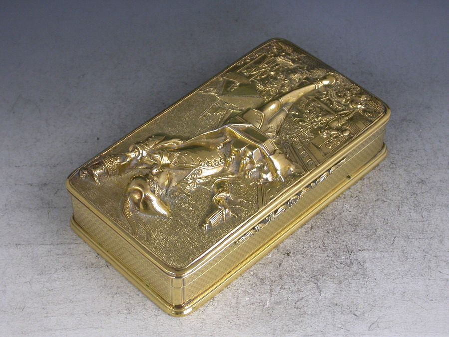 A very fine quality William IV silver gilt Snuff Box, the base and sides with engine turned decoration, the cover mounted with a high relief panel depicting a wine pedlar touting his wares in a town square with a tavern scene in the background, all on a matted ground.