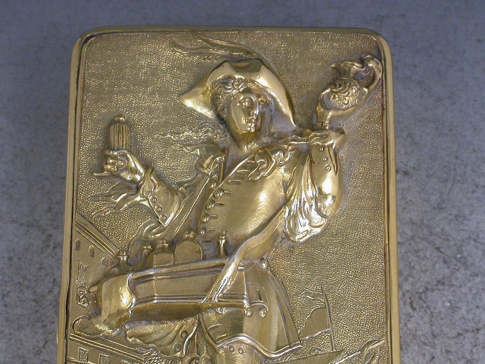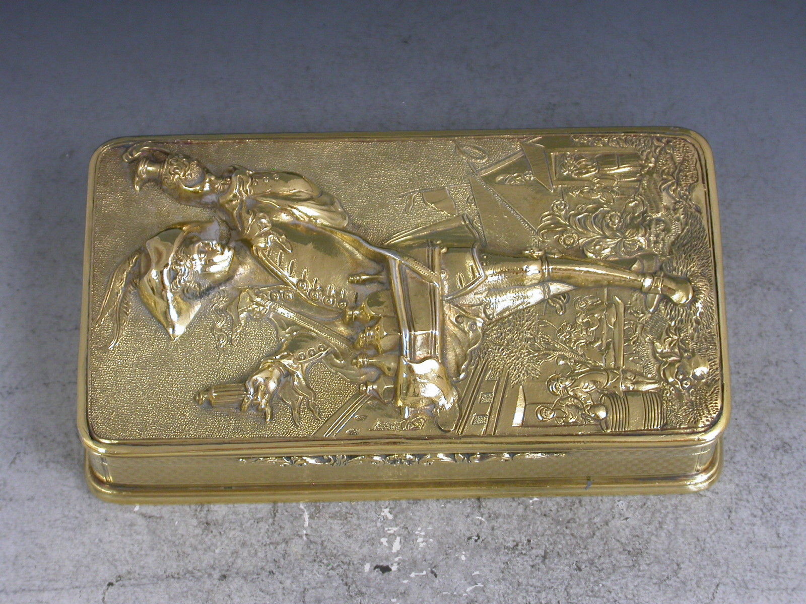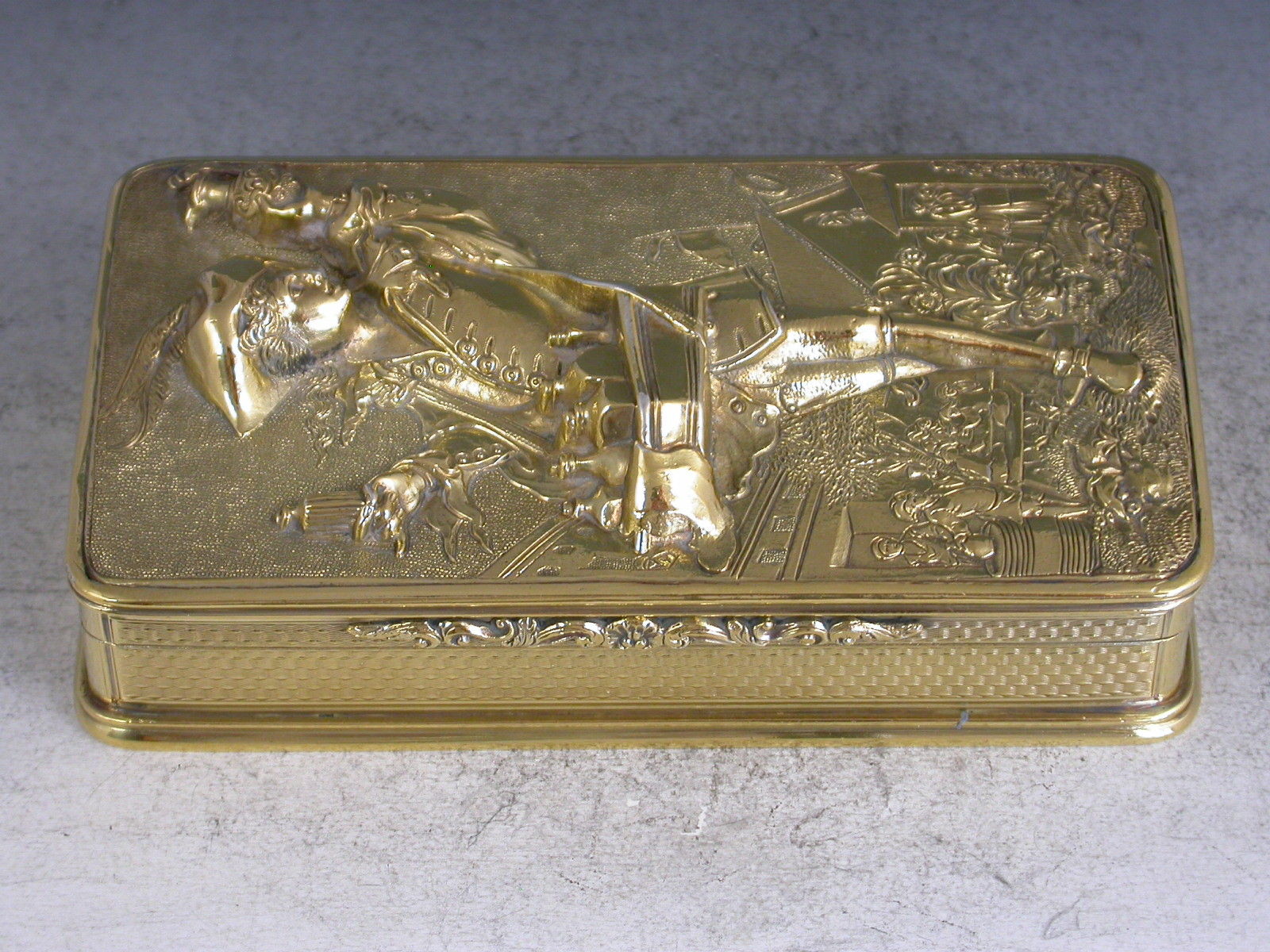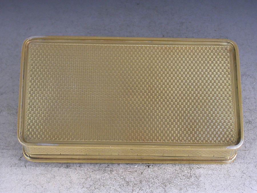 A very fine quality William IV silver gilt Snuff Box, the base and sides with engine turned decoration, the cover mounted with a high relief panel depicting a wine pedlar touting his wares in a town square with a tavern scene in the background, all on a matted ground.